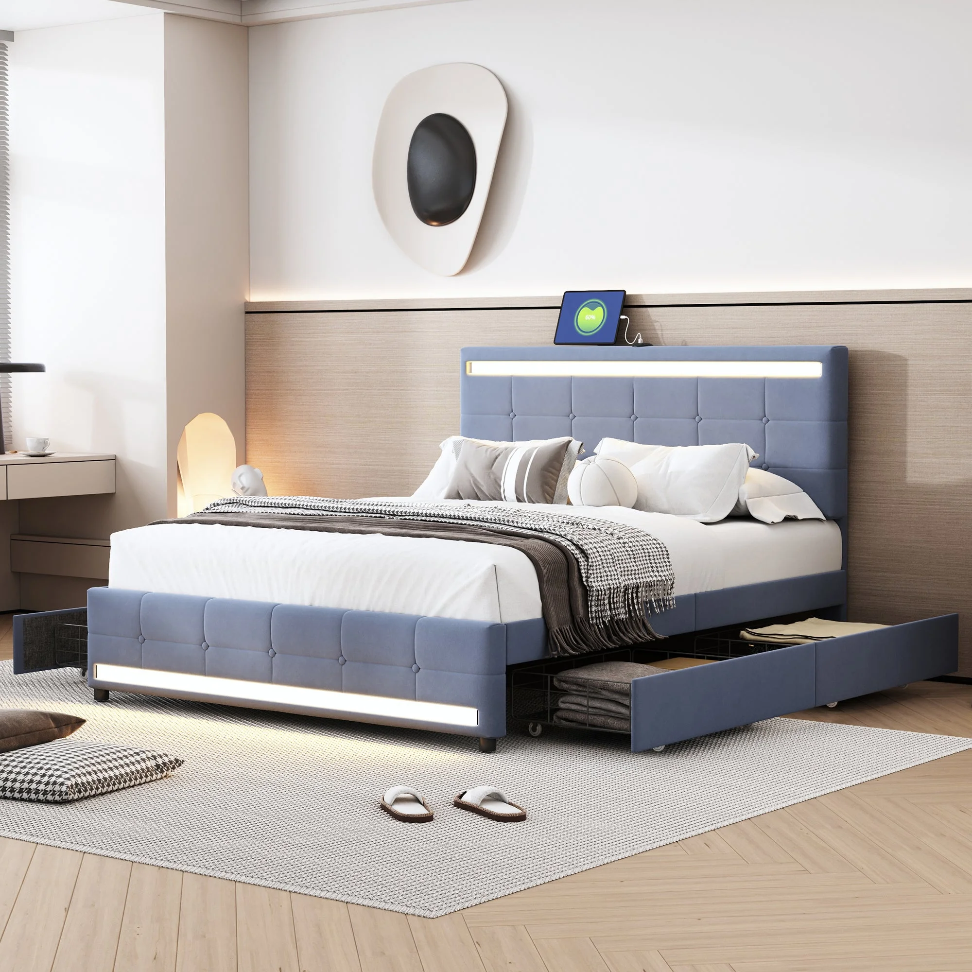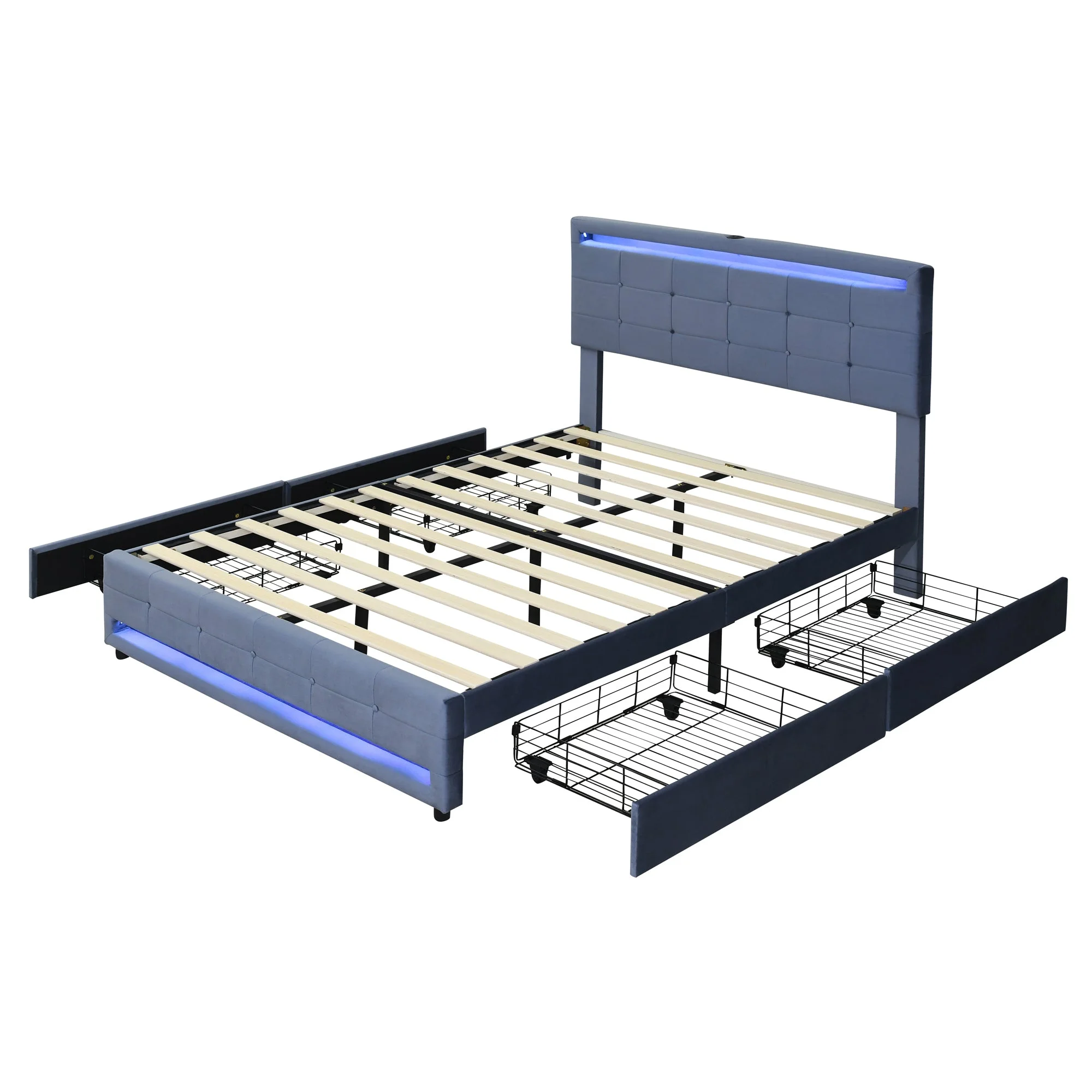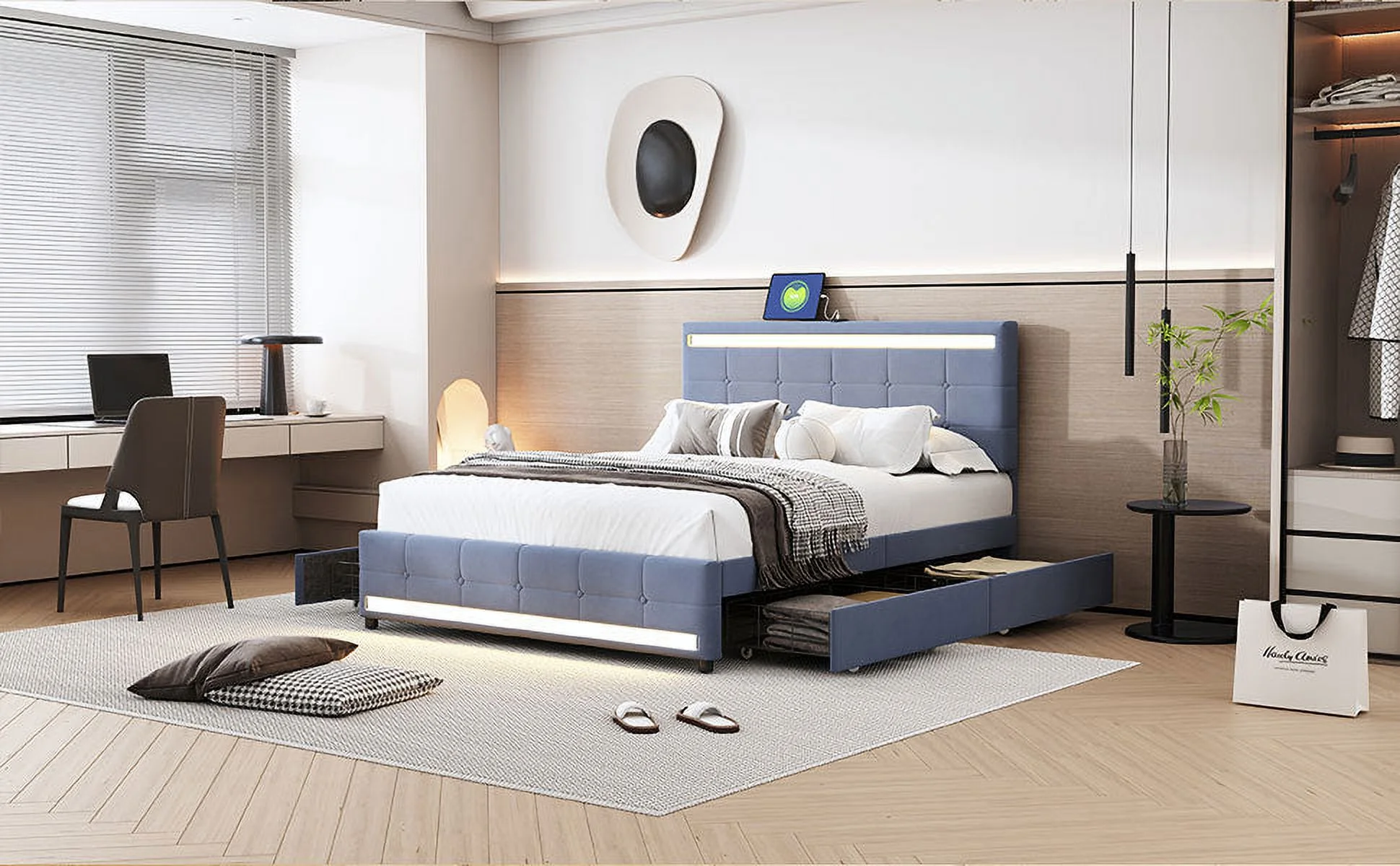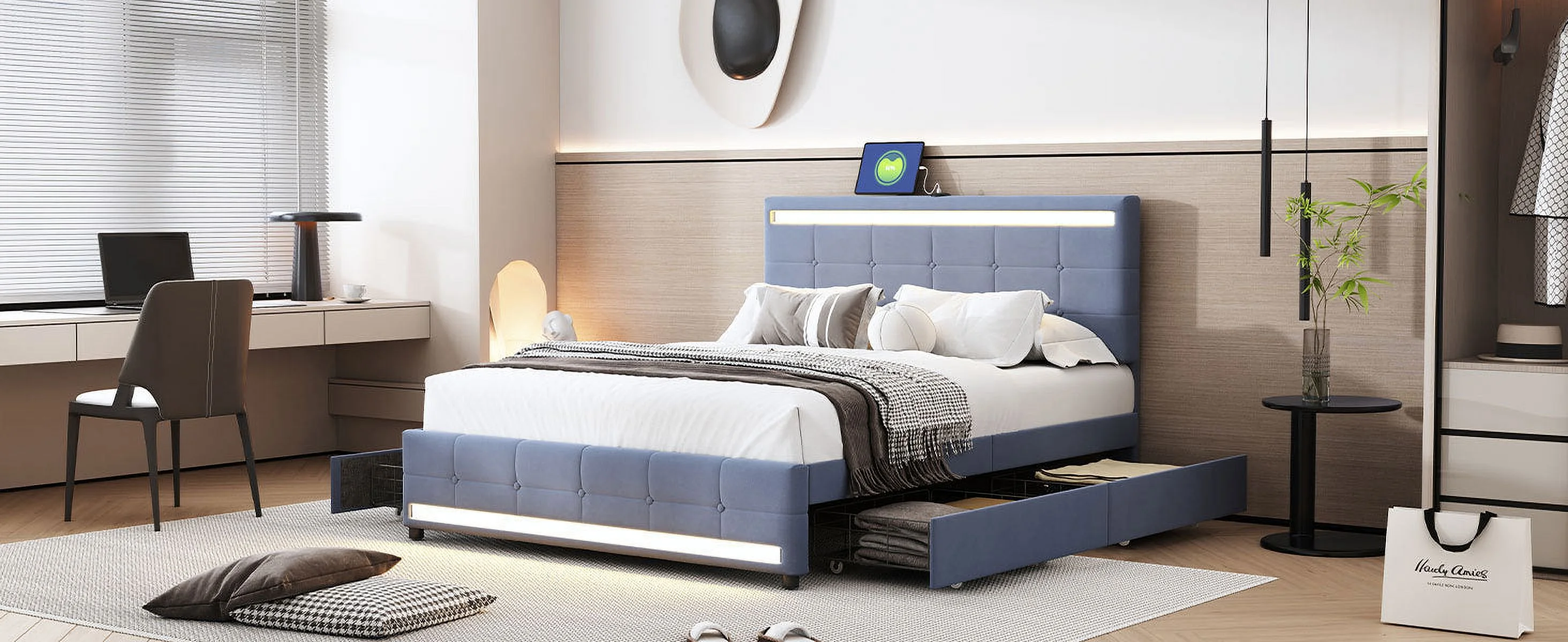 Natural Grey Finish 1pc Eastern King Size Bed Wooden Bedroom Furniture Drawers Footboard Upholstered Bedframe HB