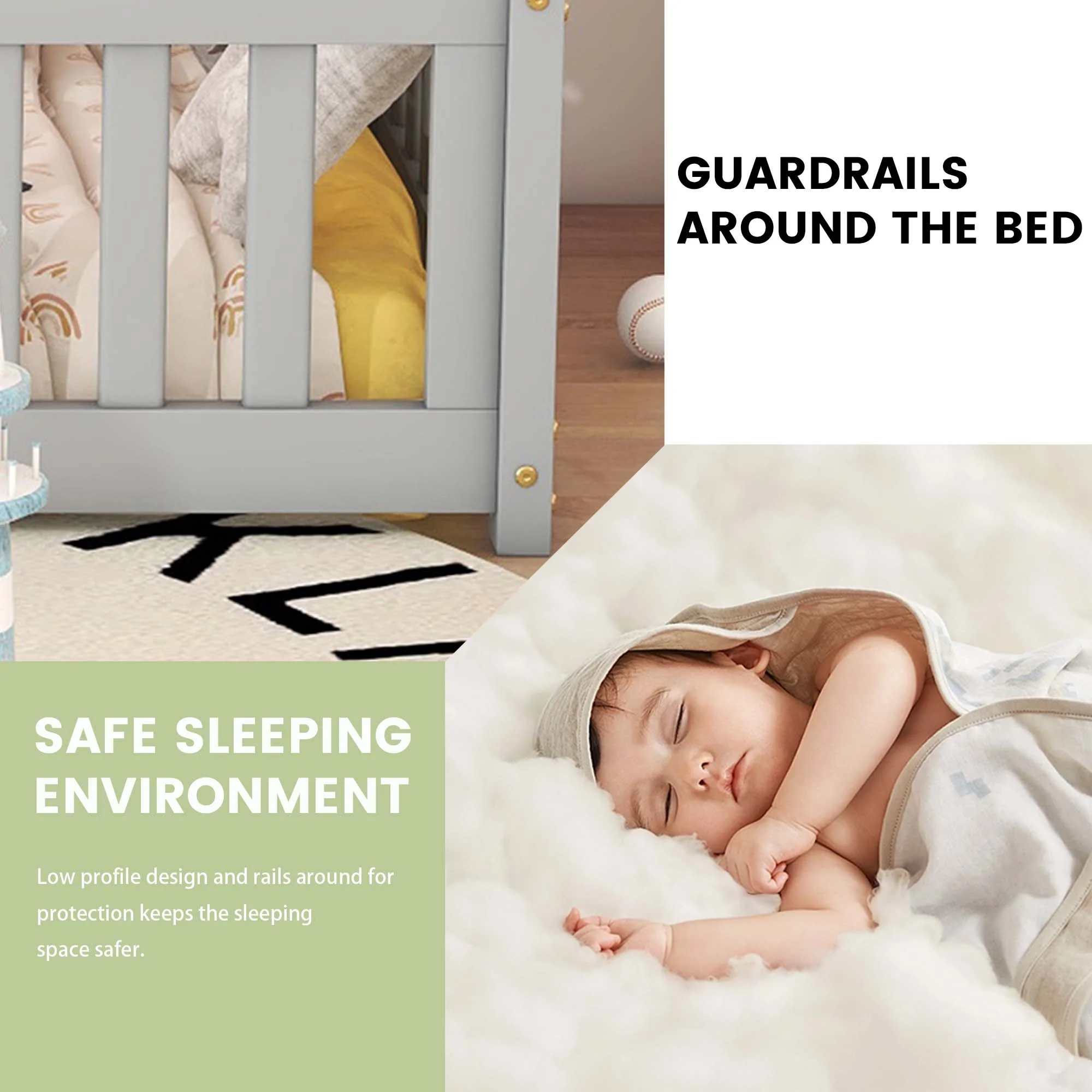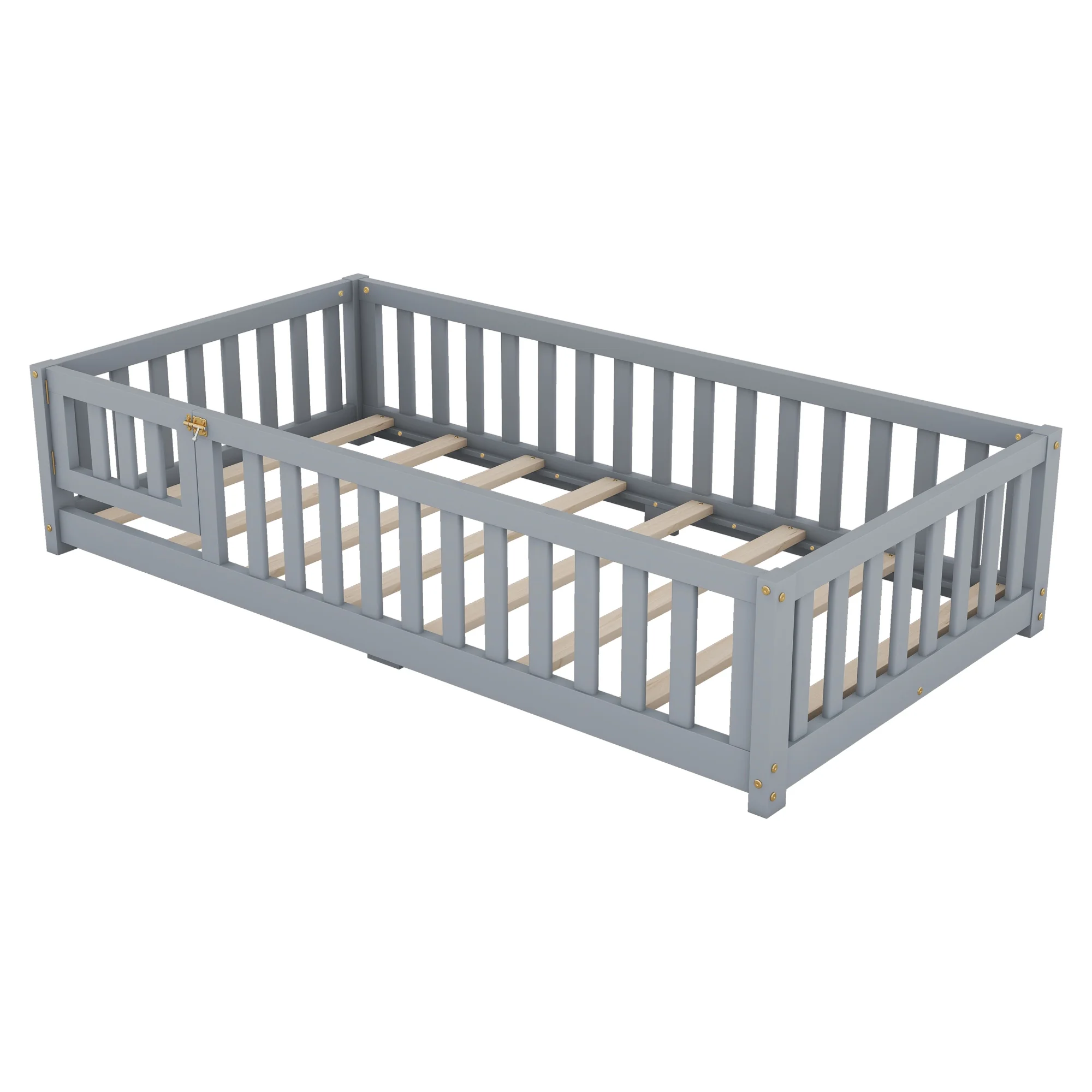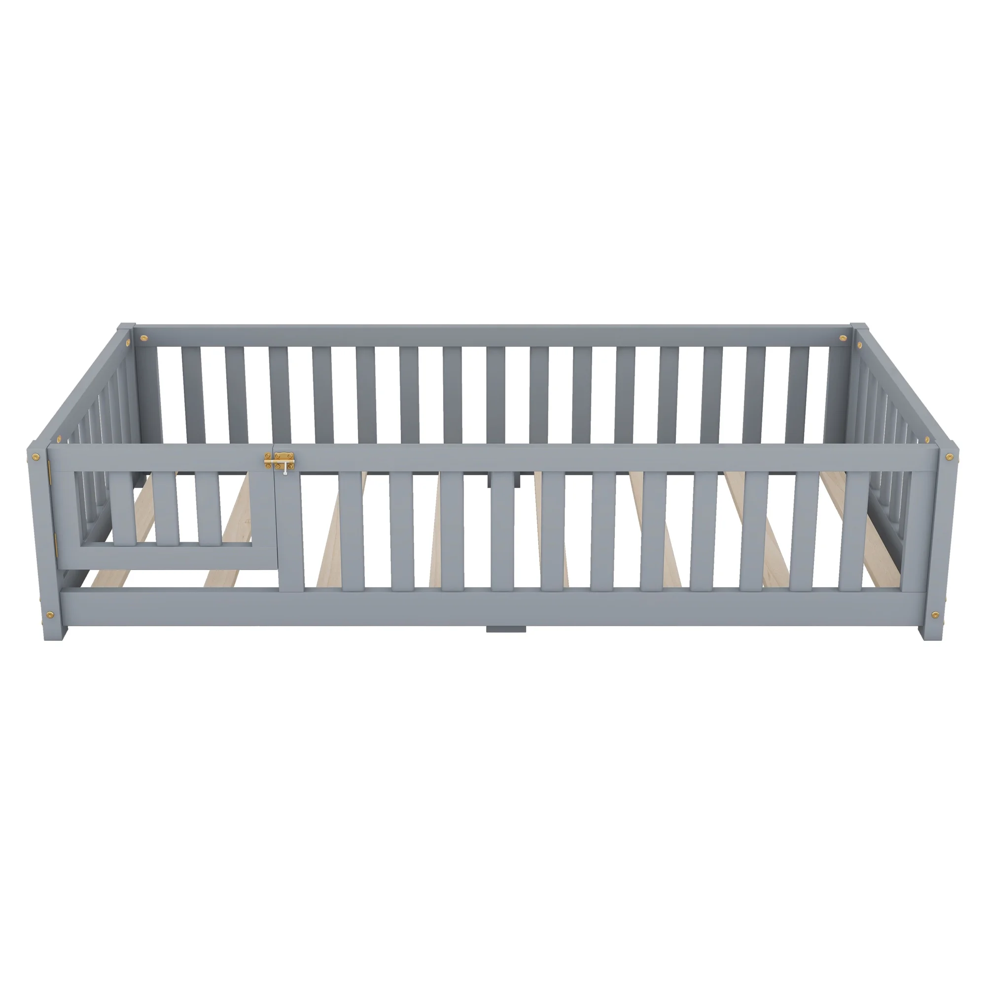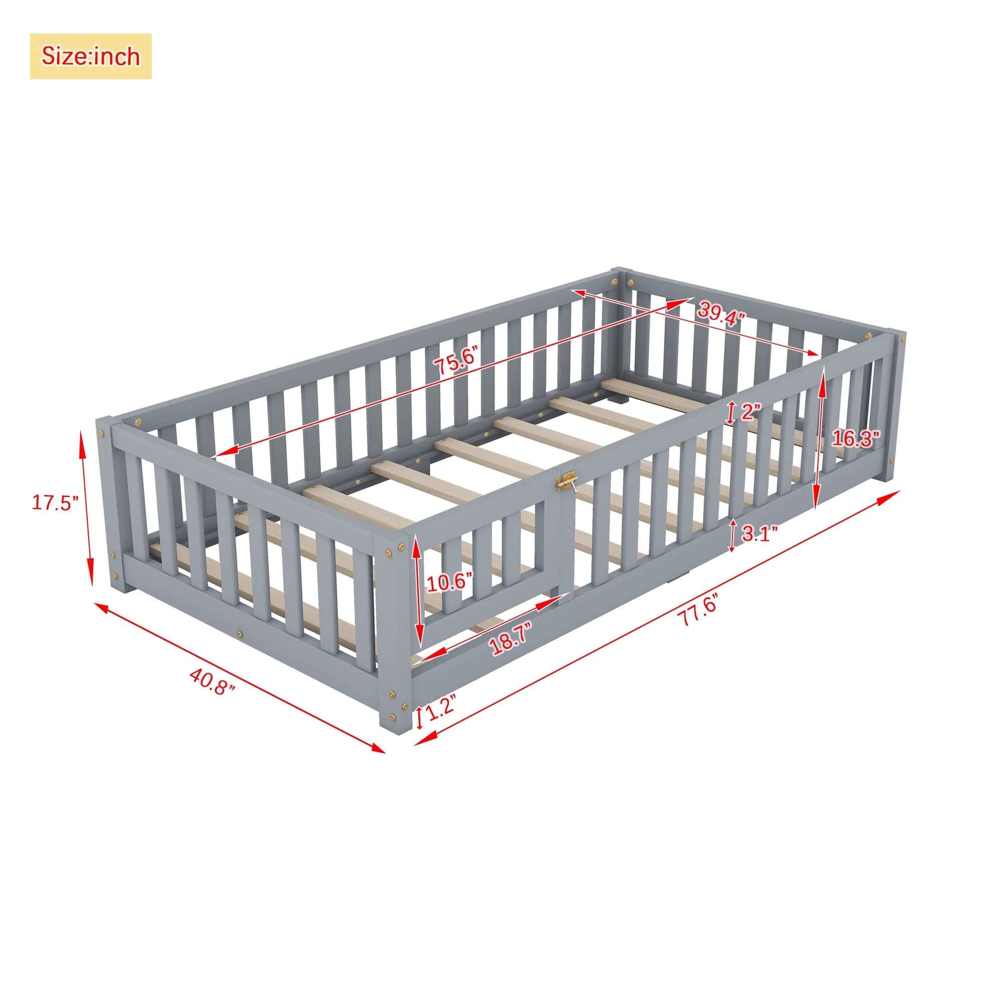 Twin Size Bed Floor Bed with Safety Guardrails and Door for Kids, Gray (Expect Arrival Date Nov.20th)