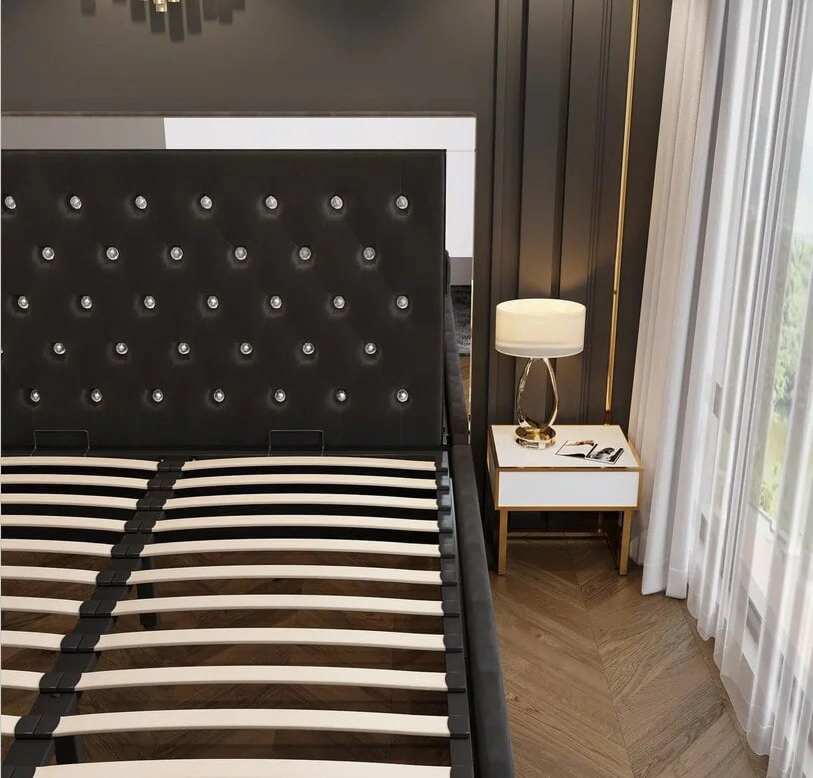 1Pc Black Finish King Size Panel Upholstered Button Tufted Headboard Bed Wooden Bedroom Furniture