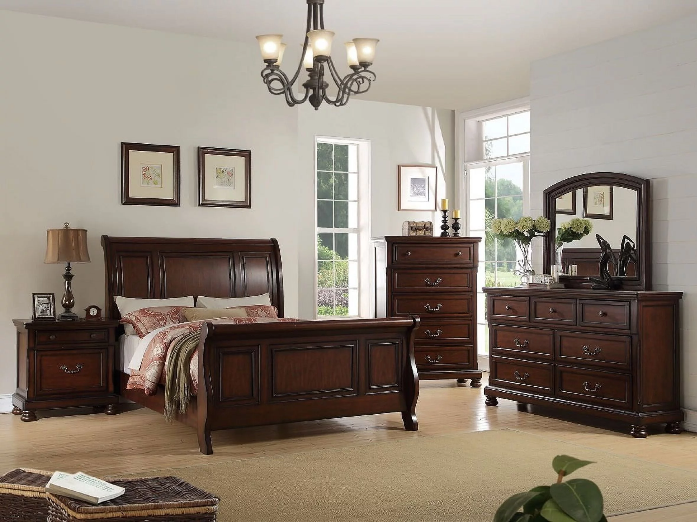 Antique Sleigh Bed Bedroom Cherry Veneer Wooden 1pc Eastern King Size Bed HB FB Rails MDF Pine Formal Bedframe