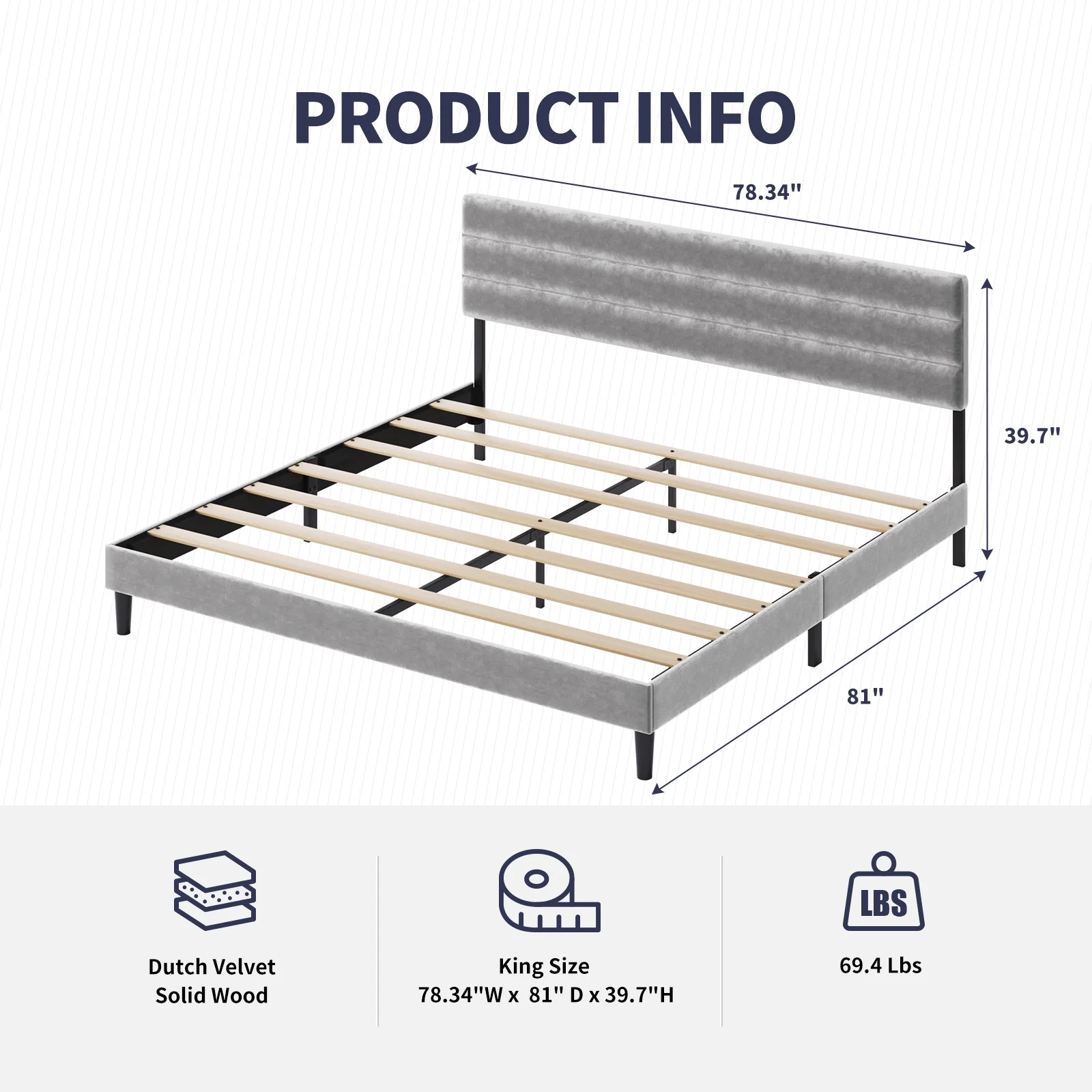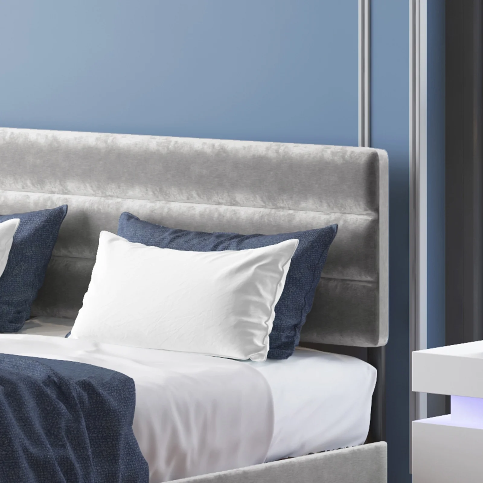 Cleo King Size Bed, Velvet, XL 3 Panel Headboard, Crystal Tufted, Blue