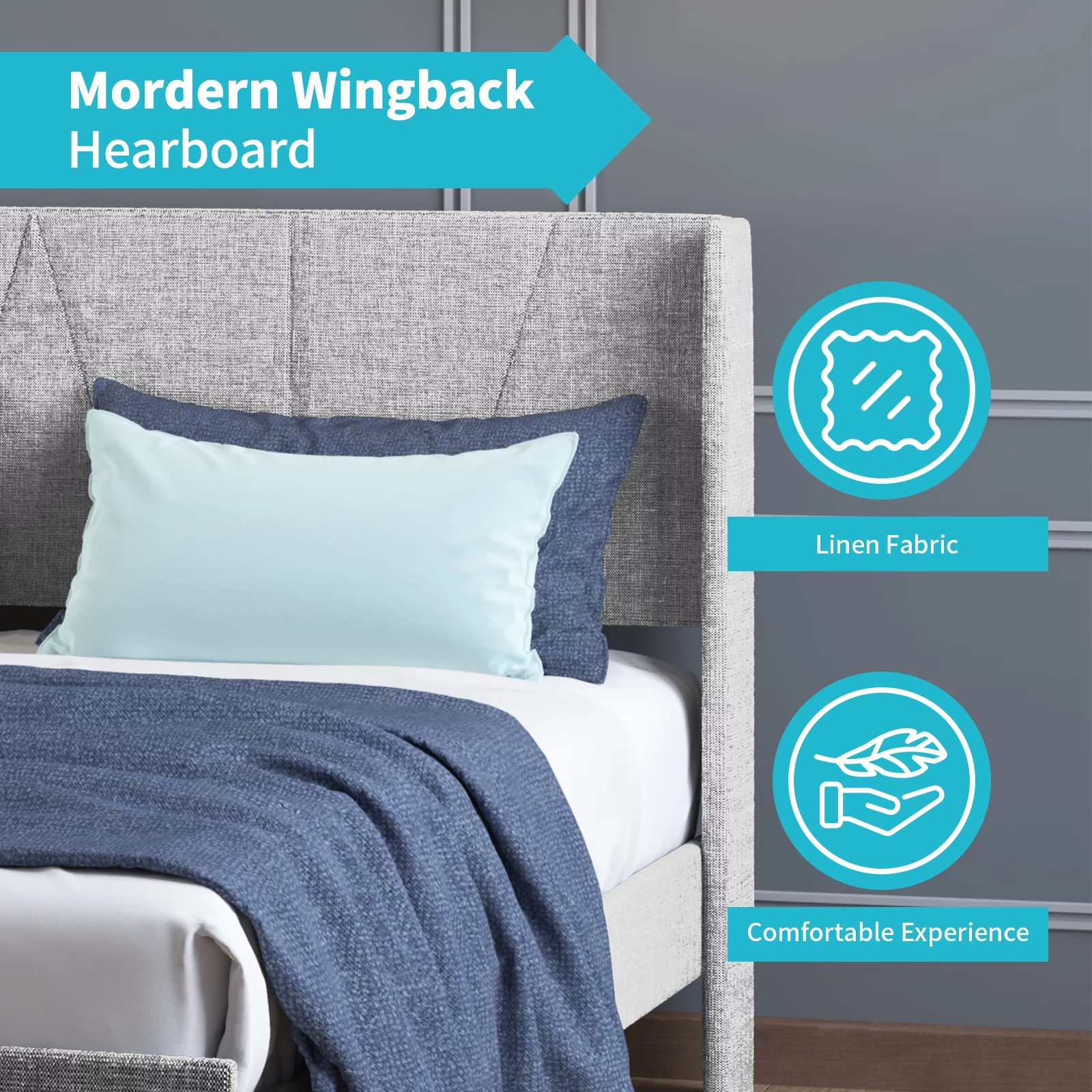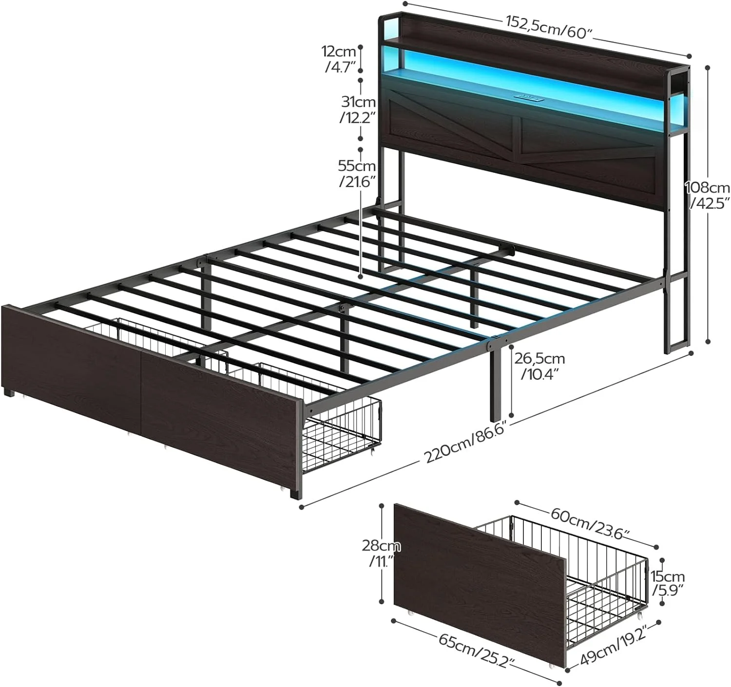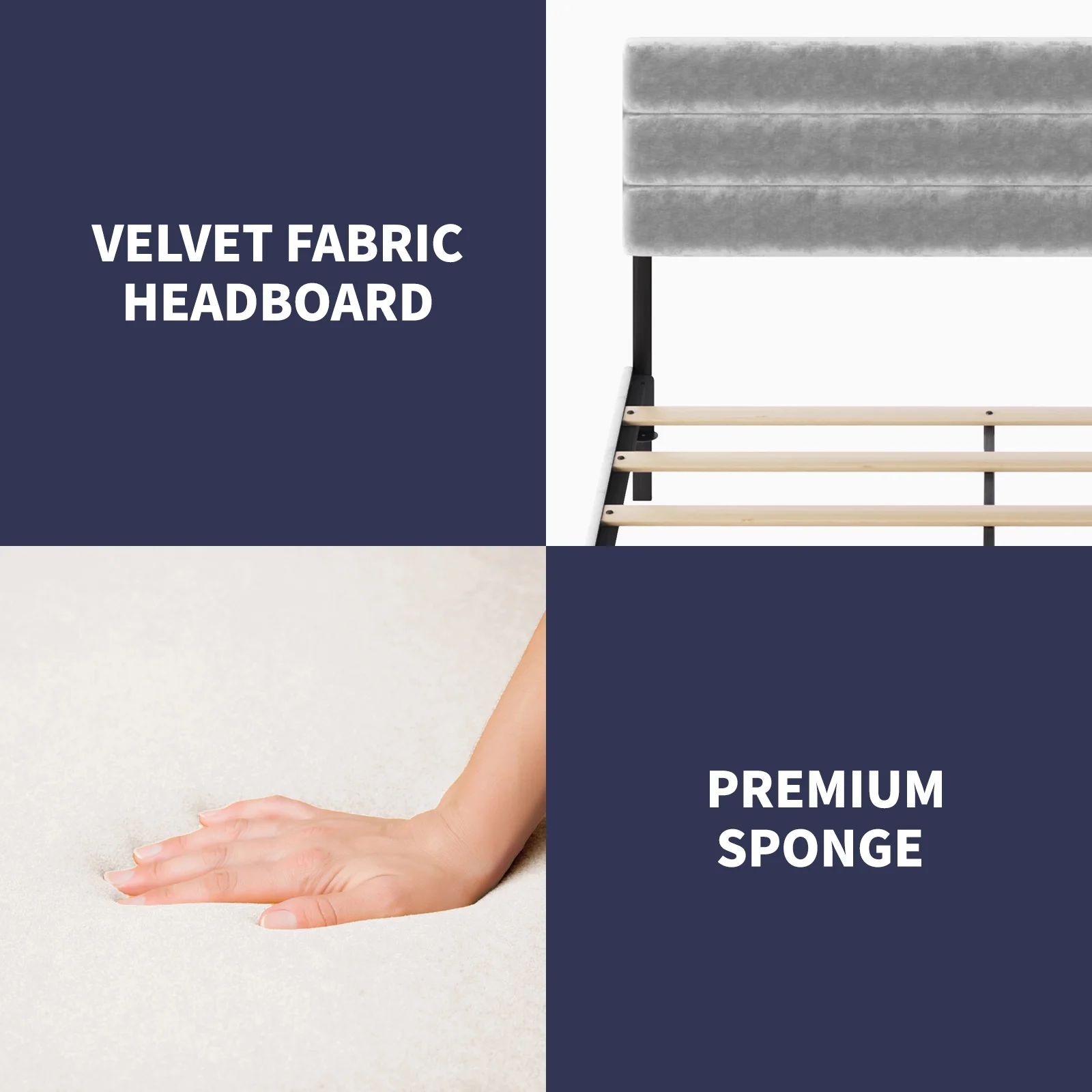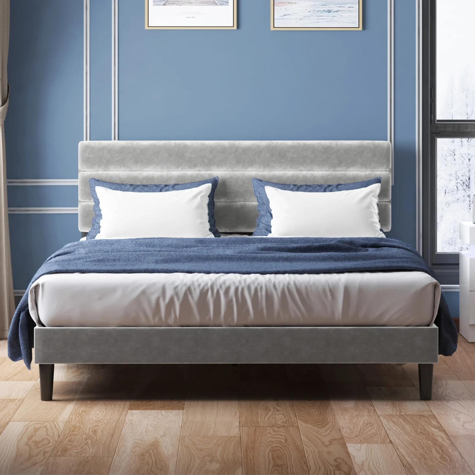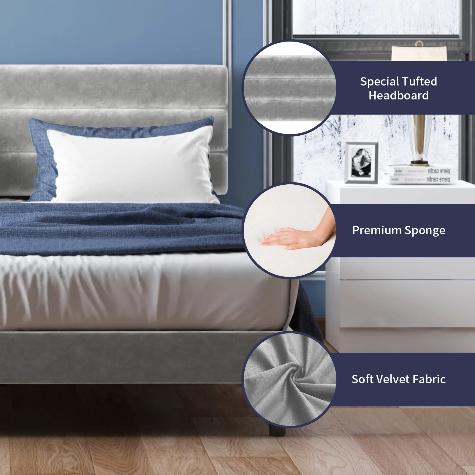 Cleo Queen Bed, Velvet, XL 3 Panel Tall Headboard, Crystal Tufted, Blue