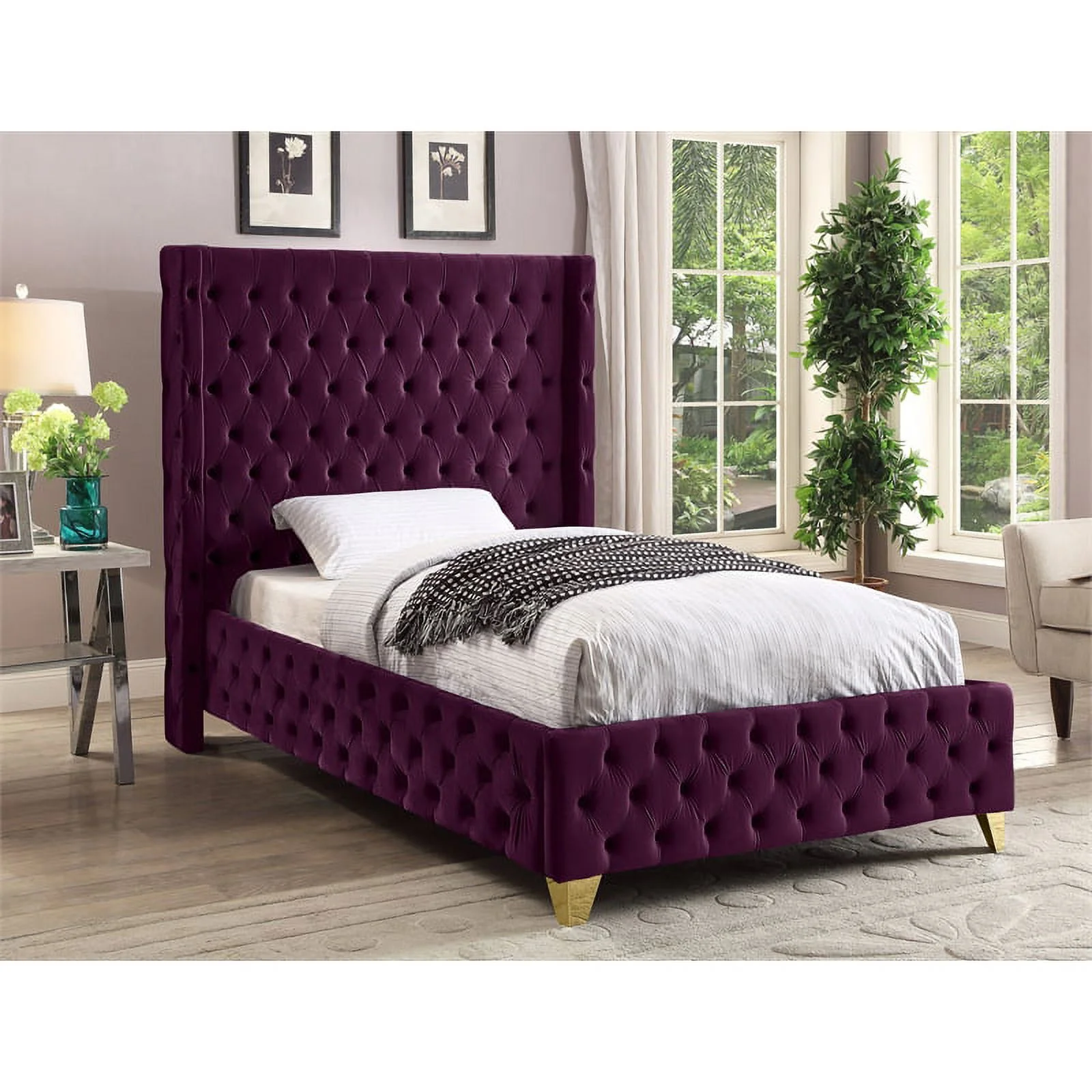 Bowery Hill Purple Modern Velvet Fabric King Size Wingback Bed in Blue