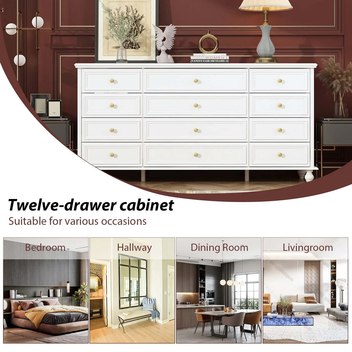 Timechee 63'' W Dresser White Chest Srorage Cabinet Lacquer Drawers White - 12-drawer