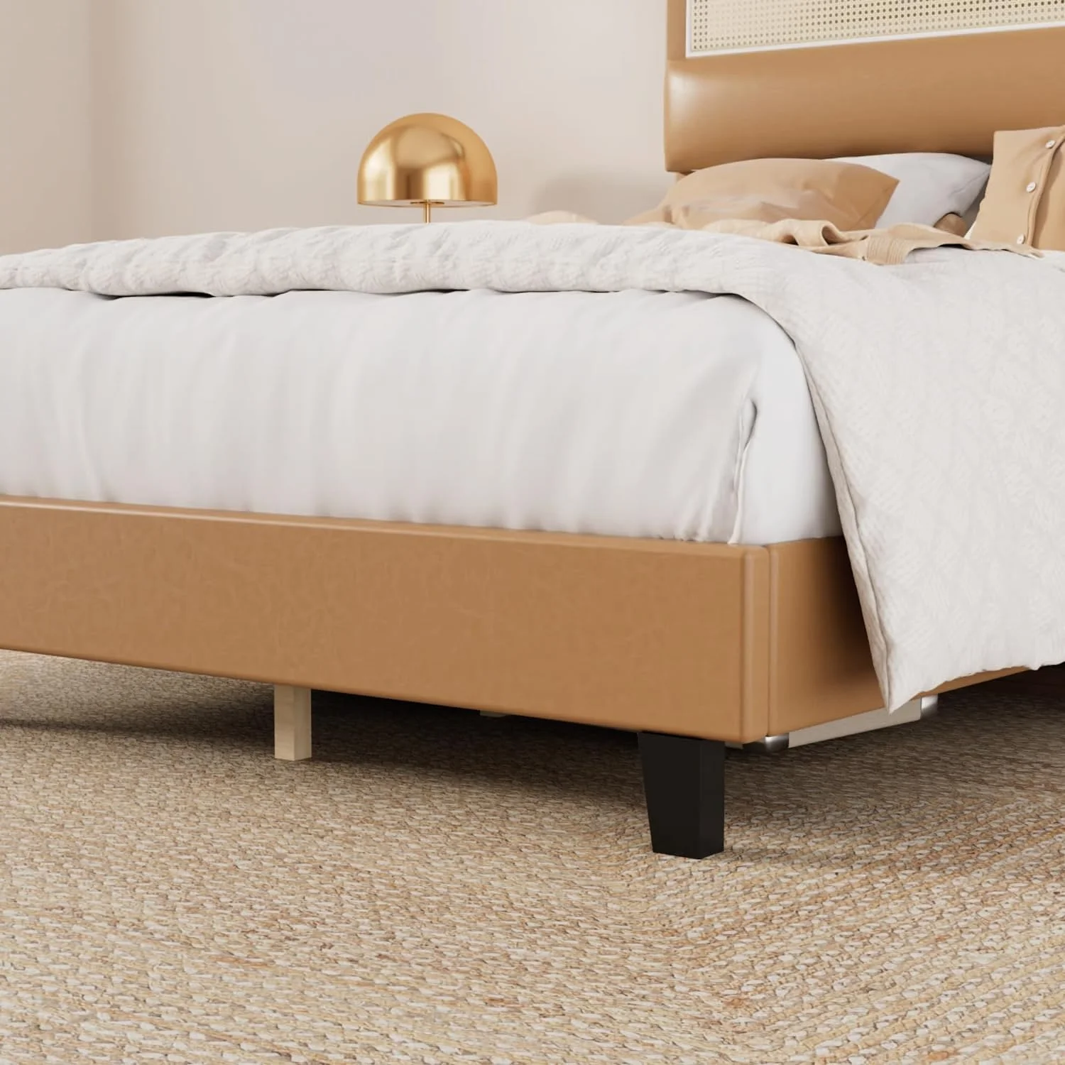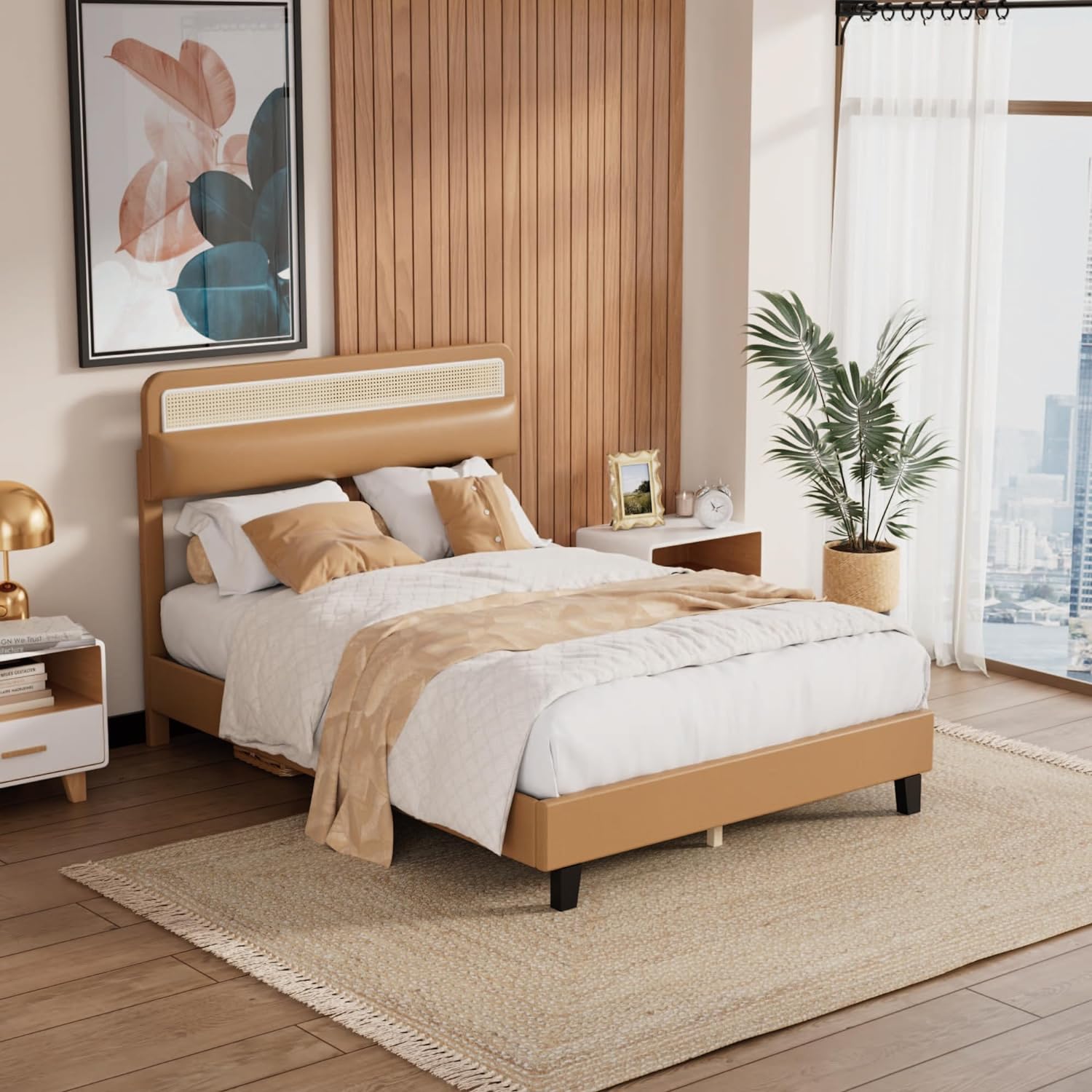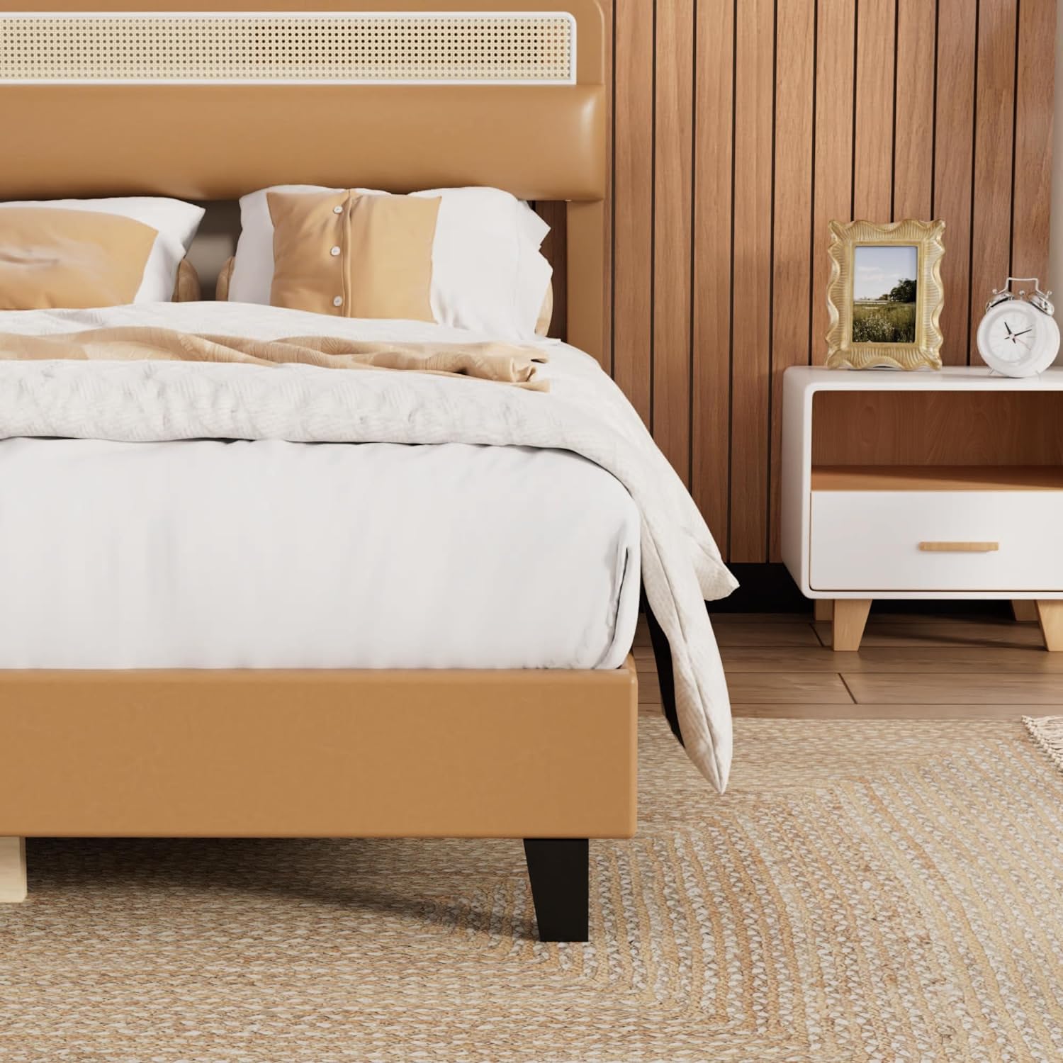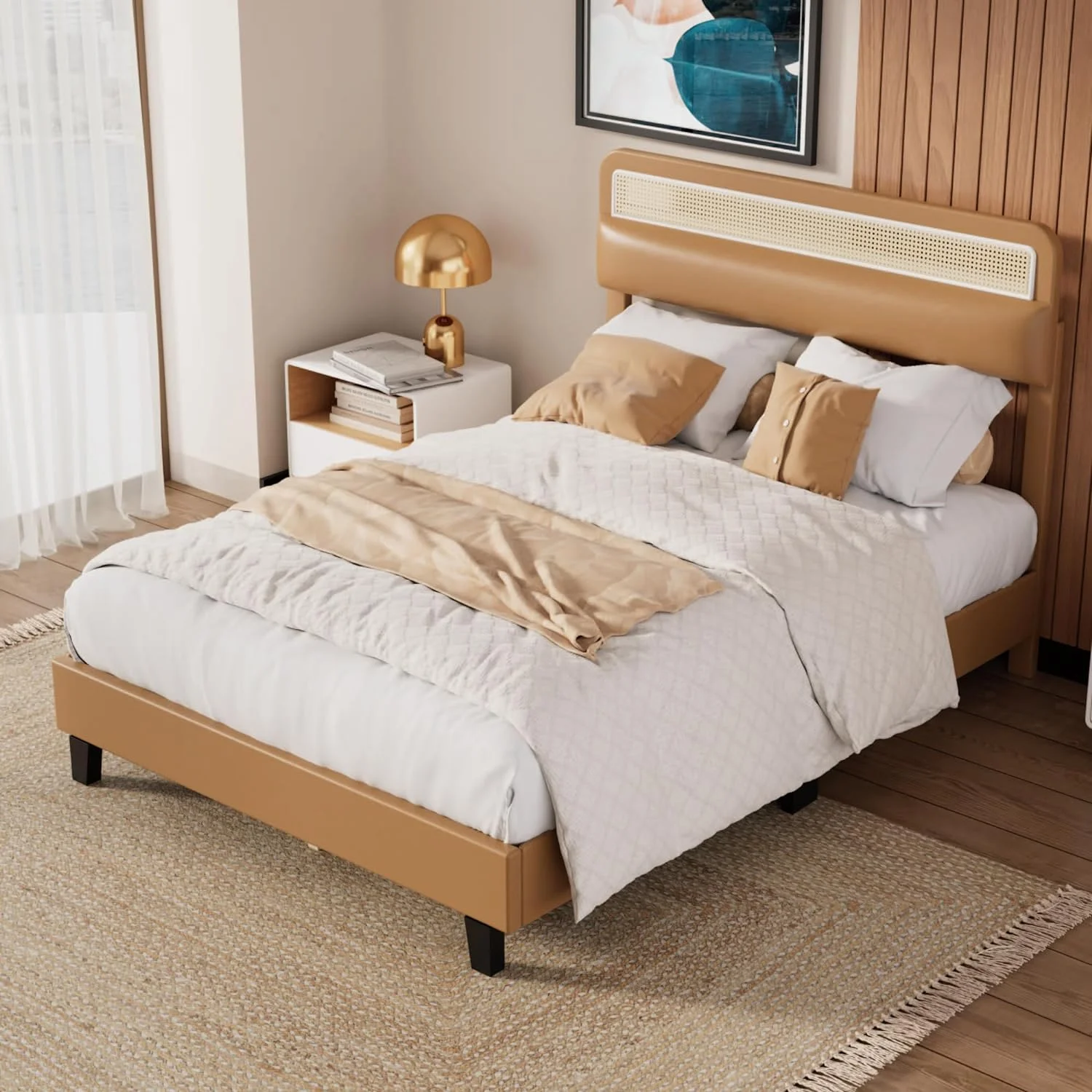 Direct Wicker Upholstered Platform Bed with Headboard and 4 Drawers, No Box Spring Needed, Linen Fabric, Queen Size Beige