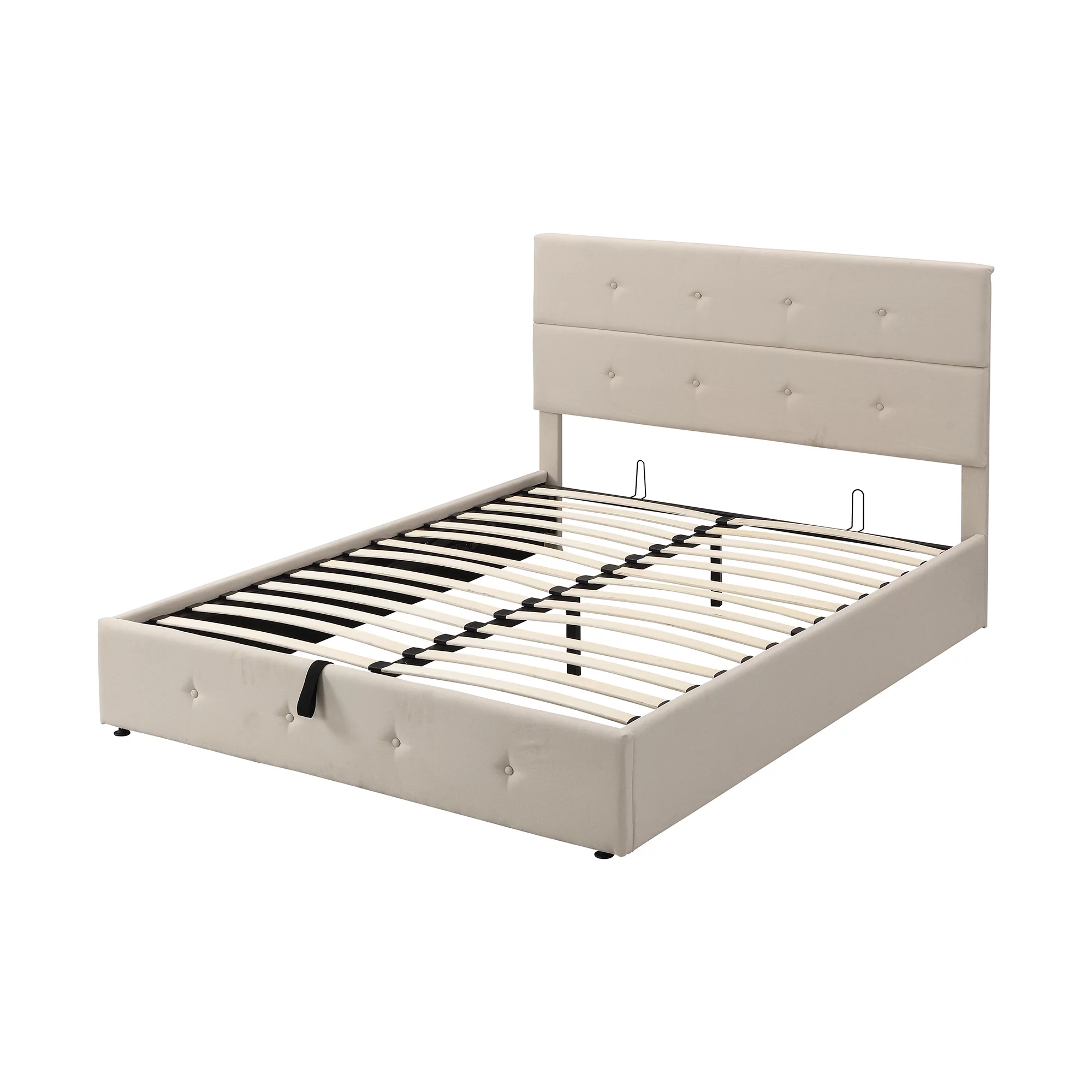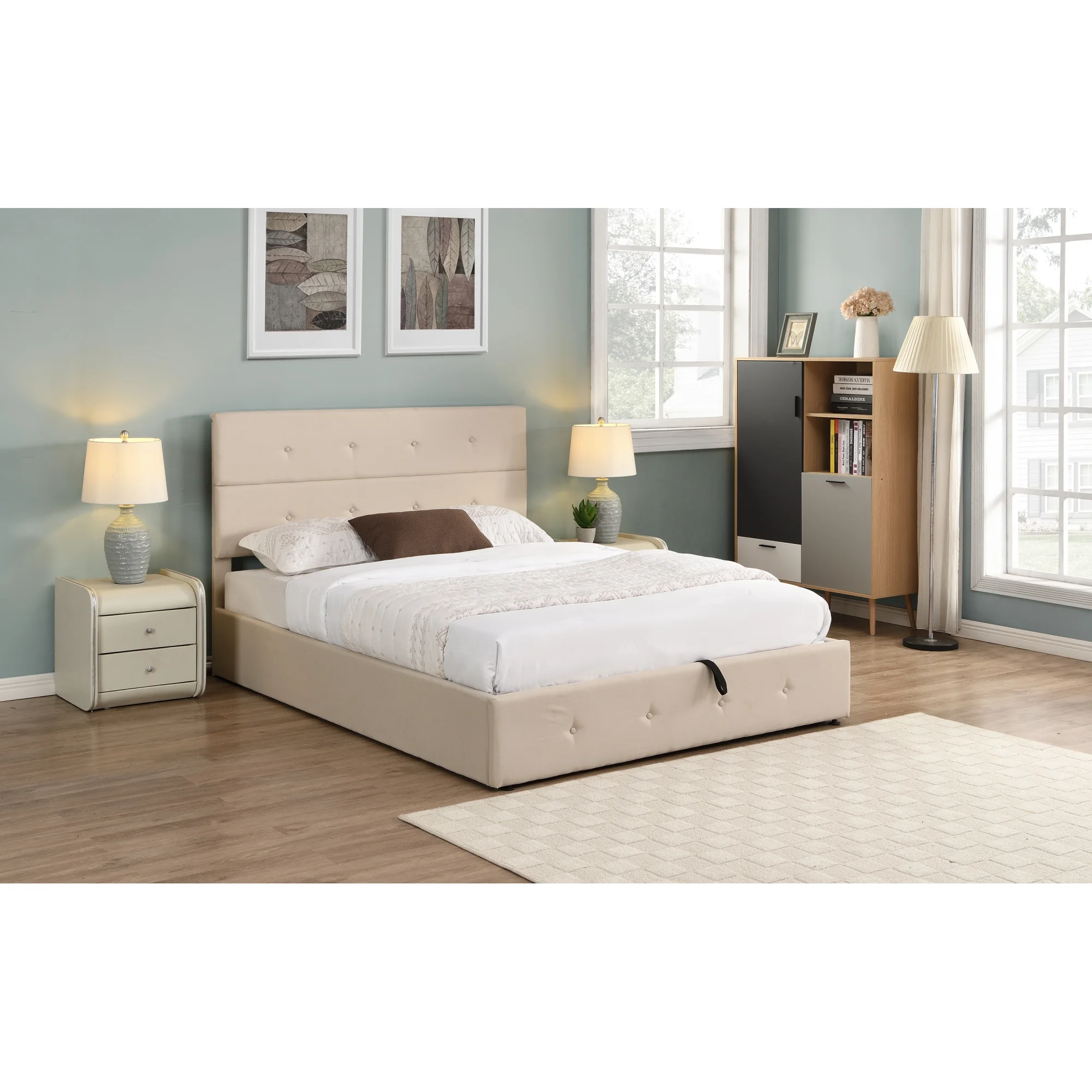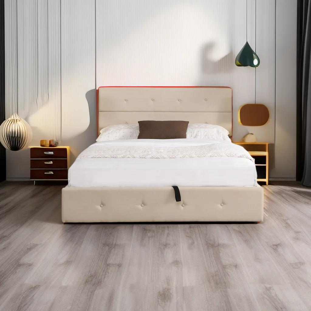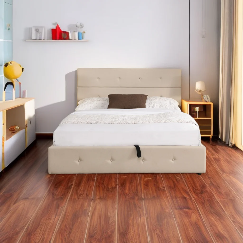 Dawn Whisper Upholstered Platform Bed with Underneath Storage, Queen Size, Beige