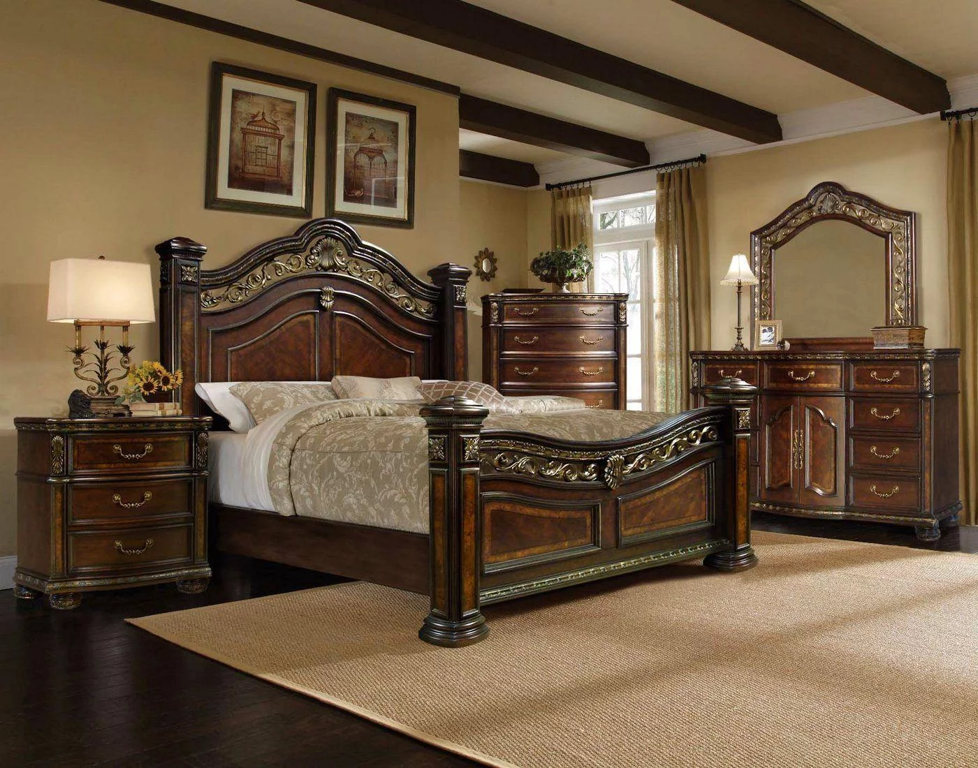 McFerran B163-Q Antique Brass Cherry Wood Finish Queen Bed Classic