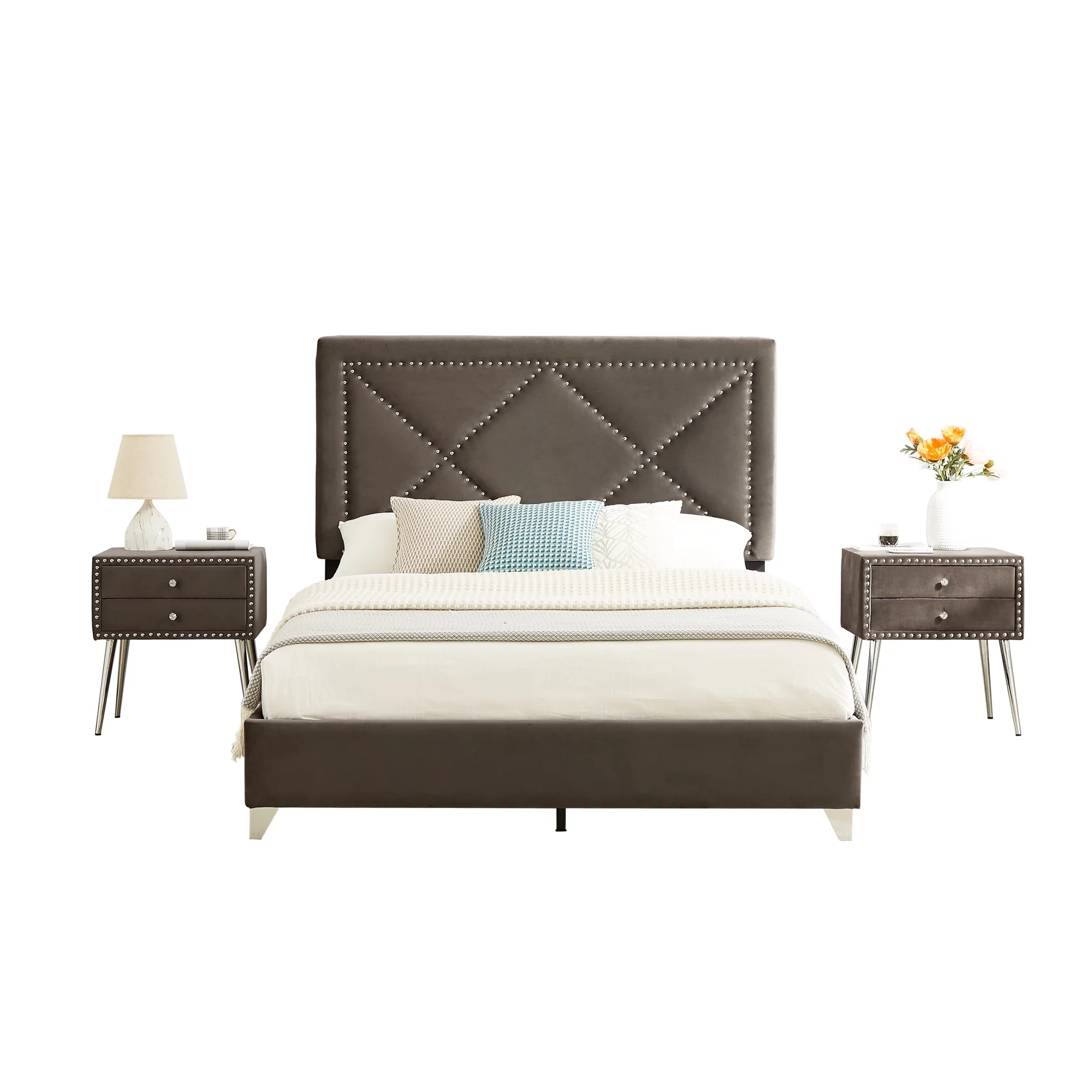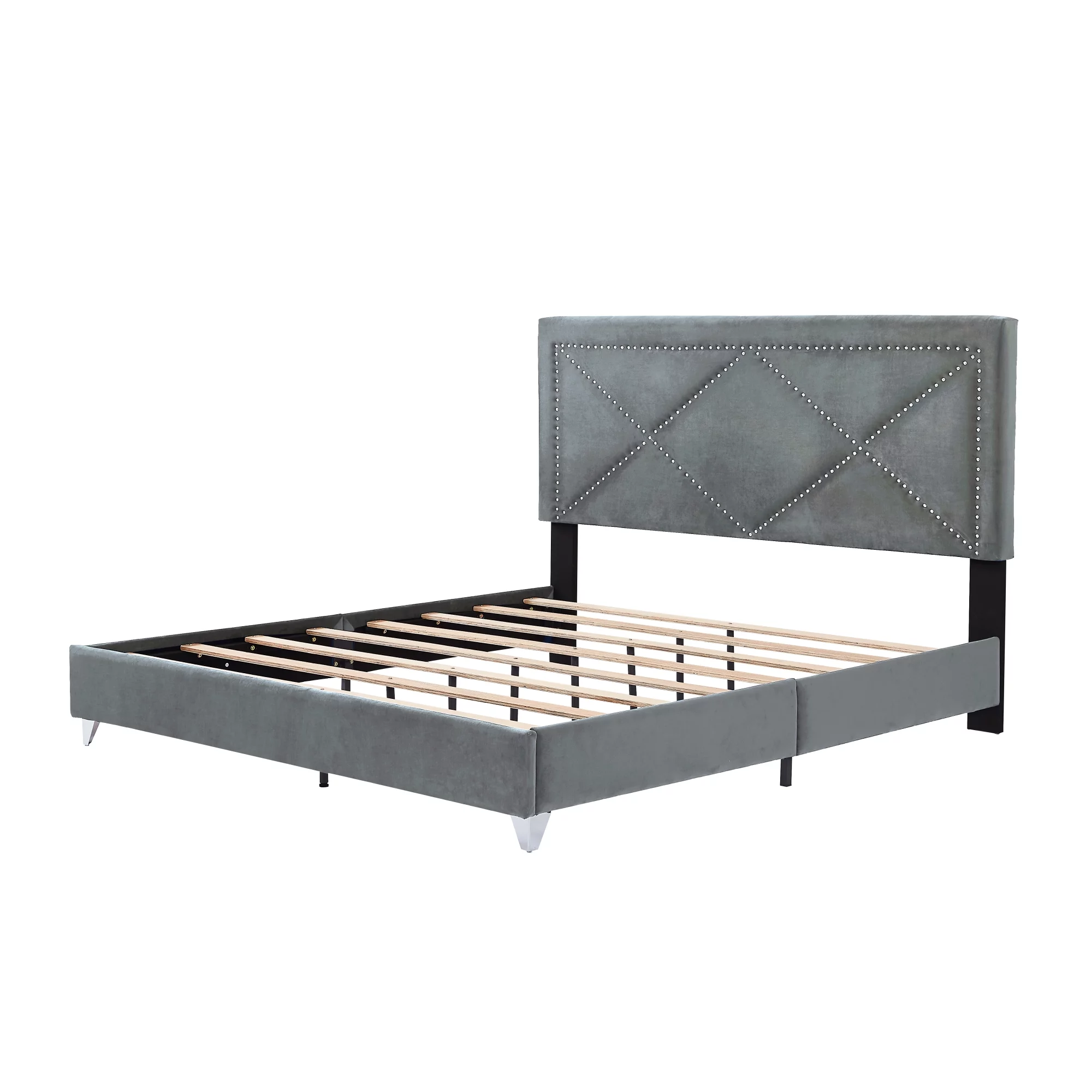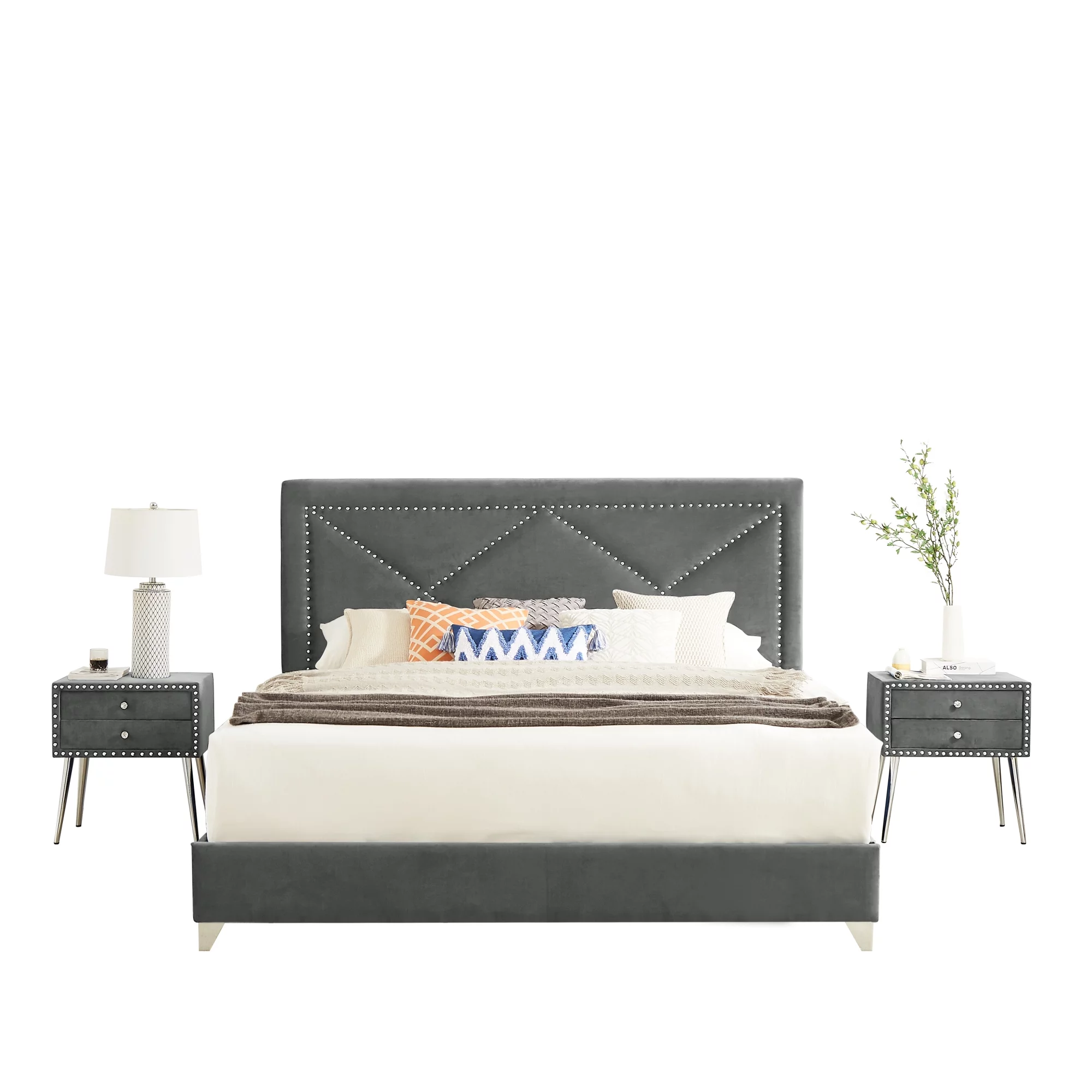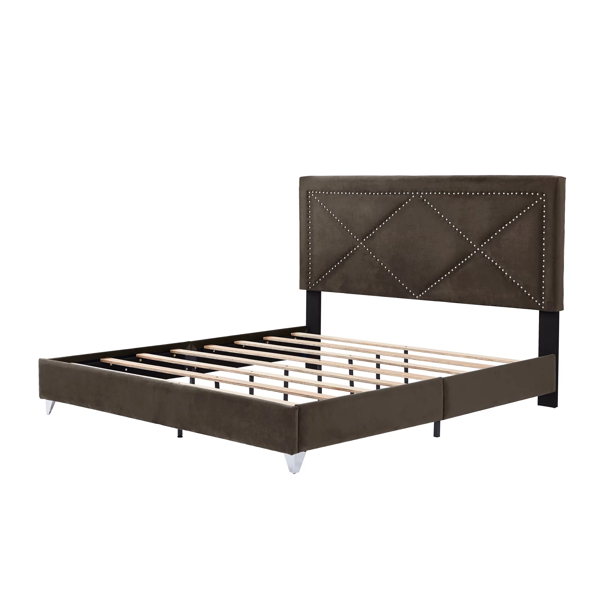 B109 King bed with two nightstands,Beautiful brass studs adorn the headboard, strong wooden slats + metal legs with Electroplate