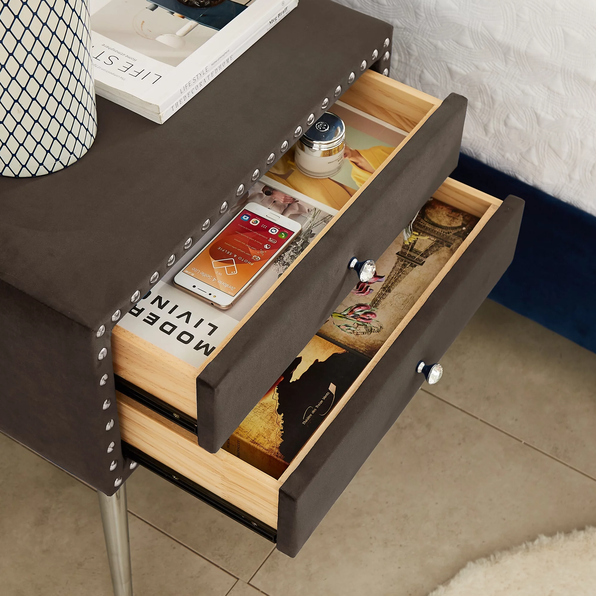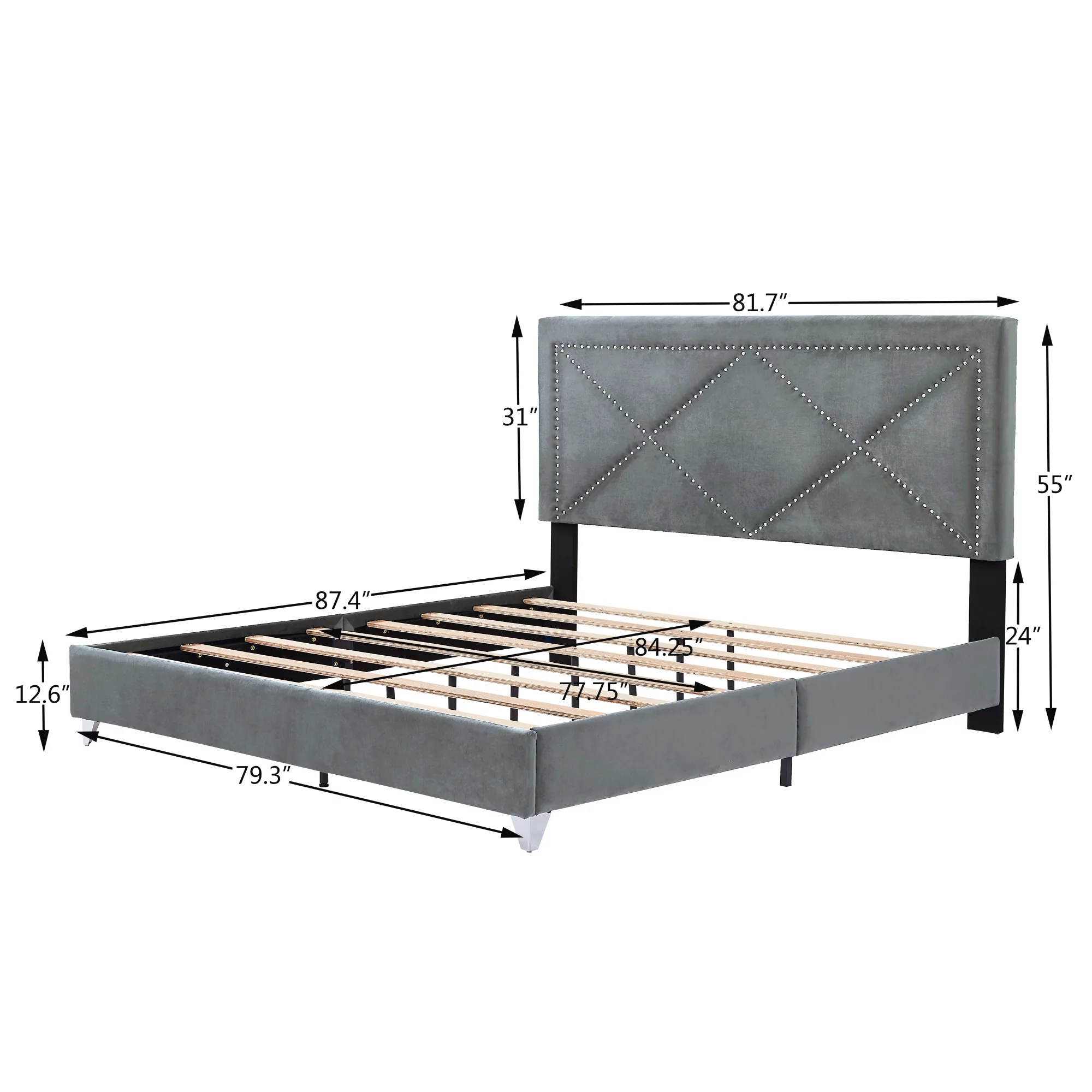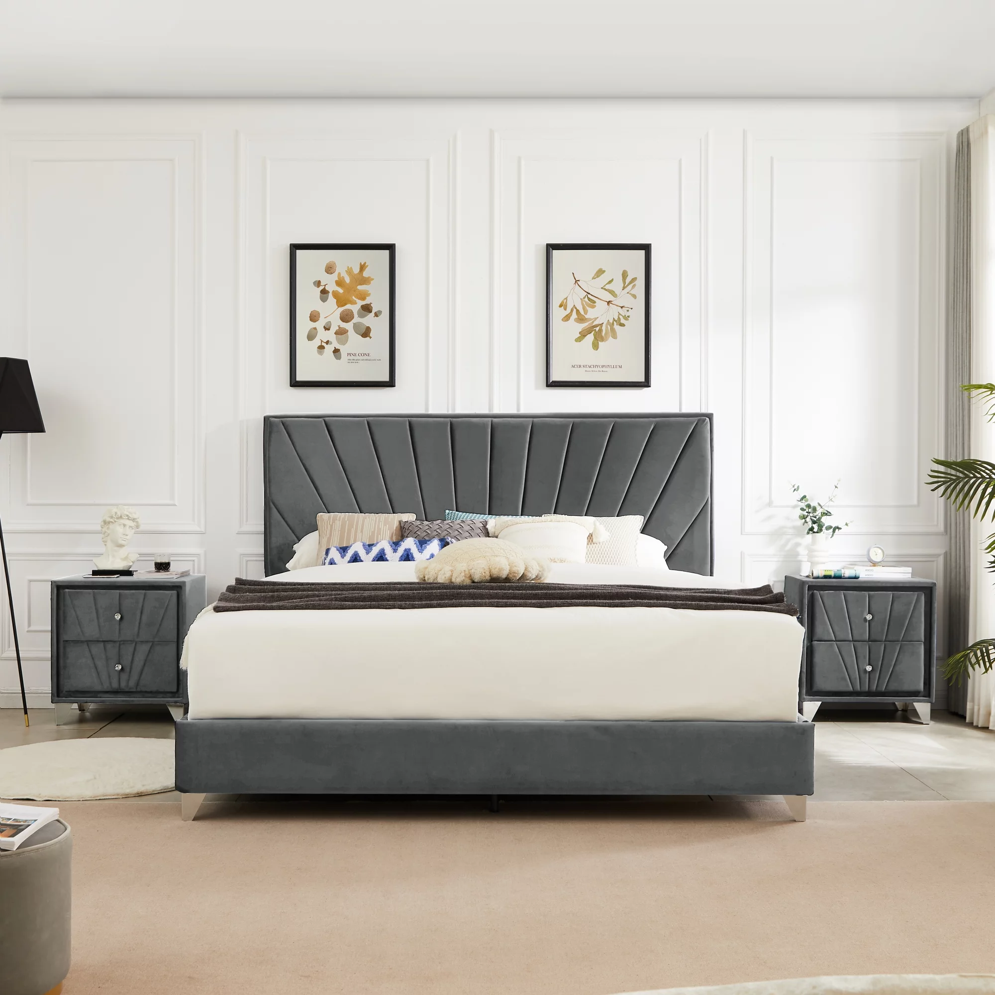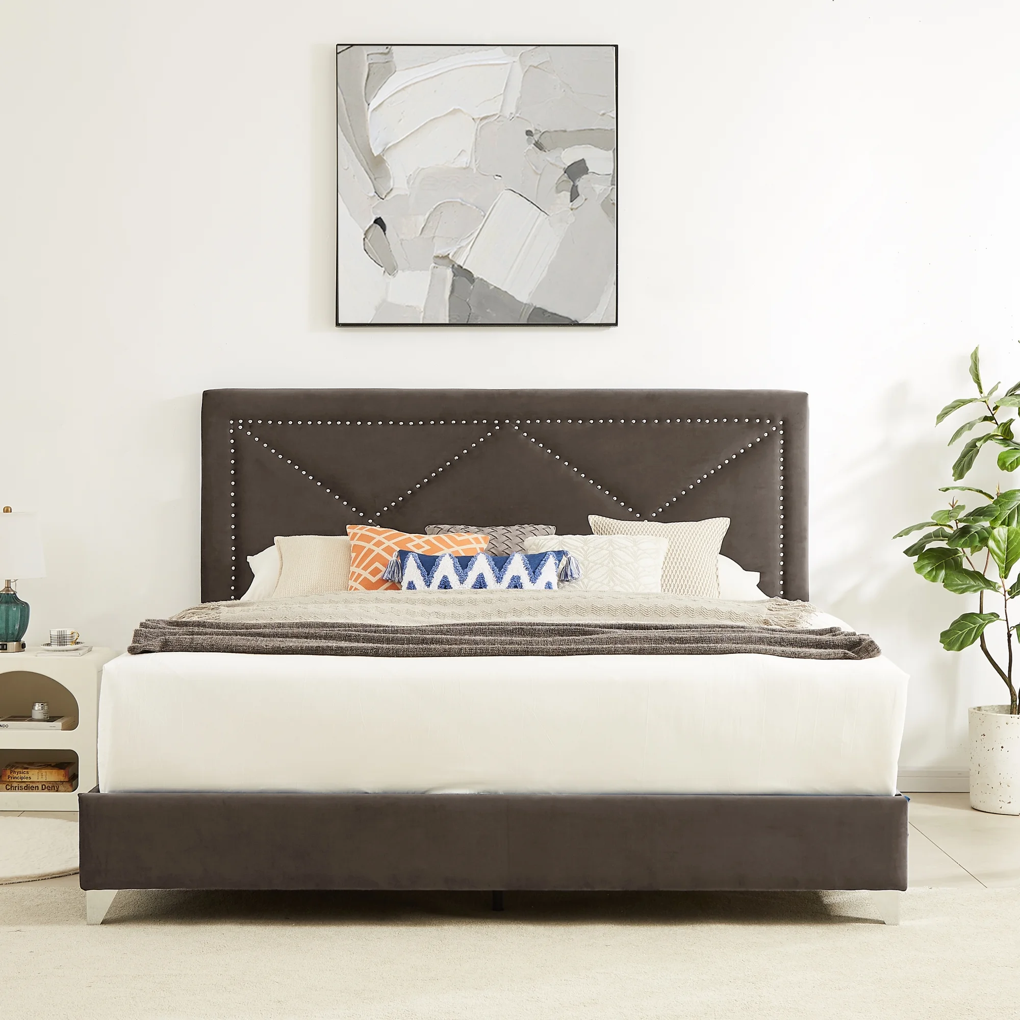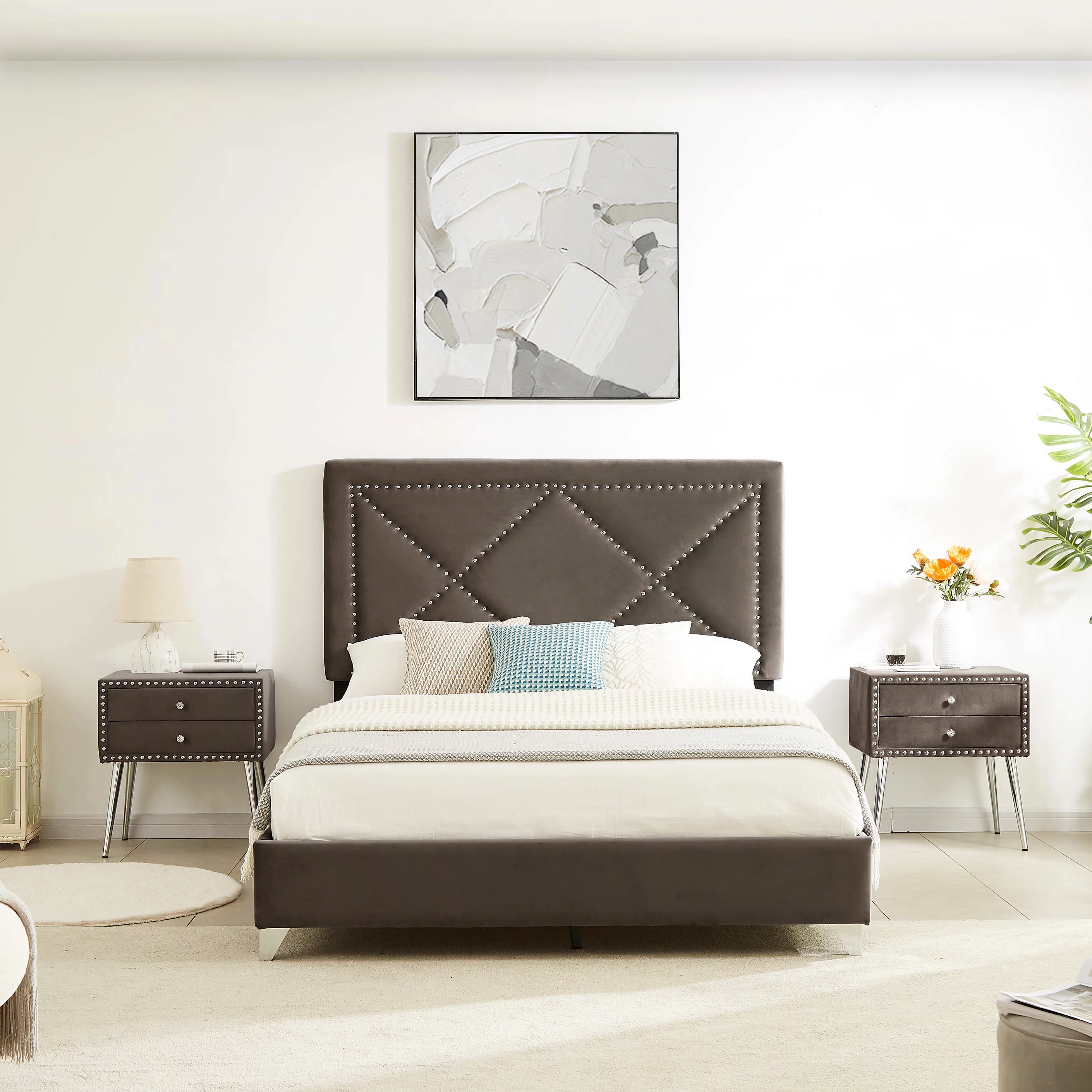 B109 King bed with two nightstands,Beautiful brass studs adorn the headboard, strong wooden slats + metal legs with Electroplate