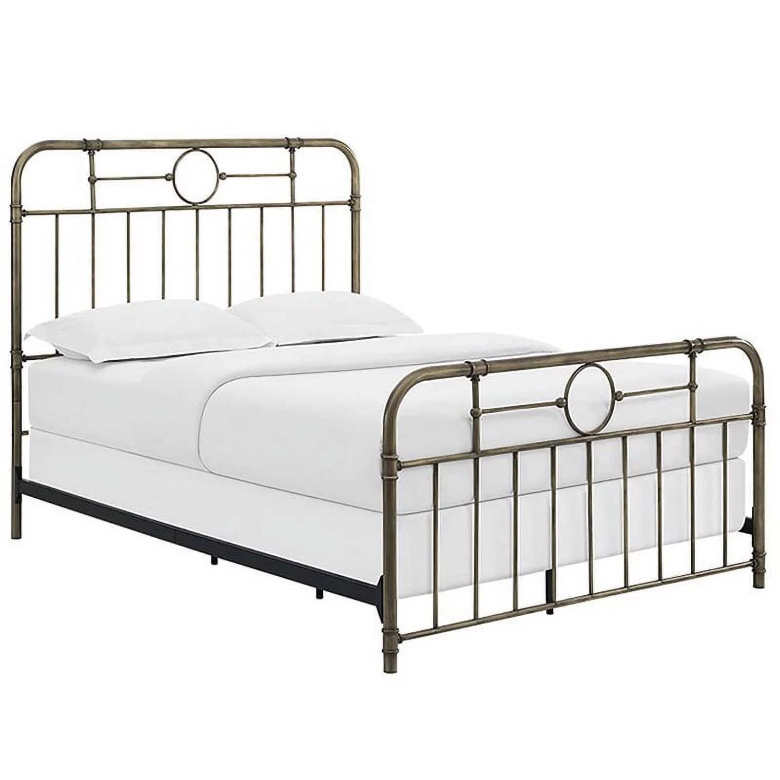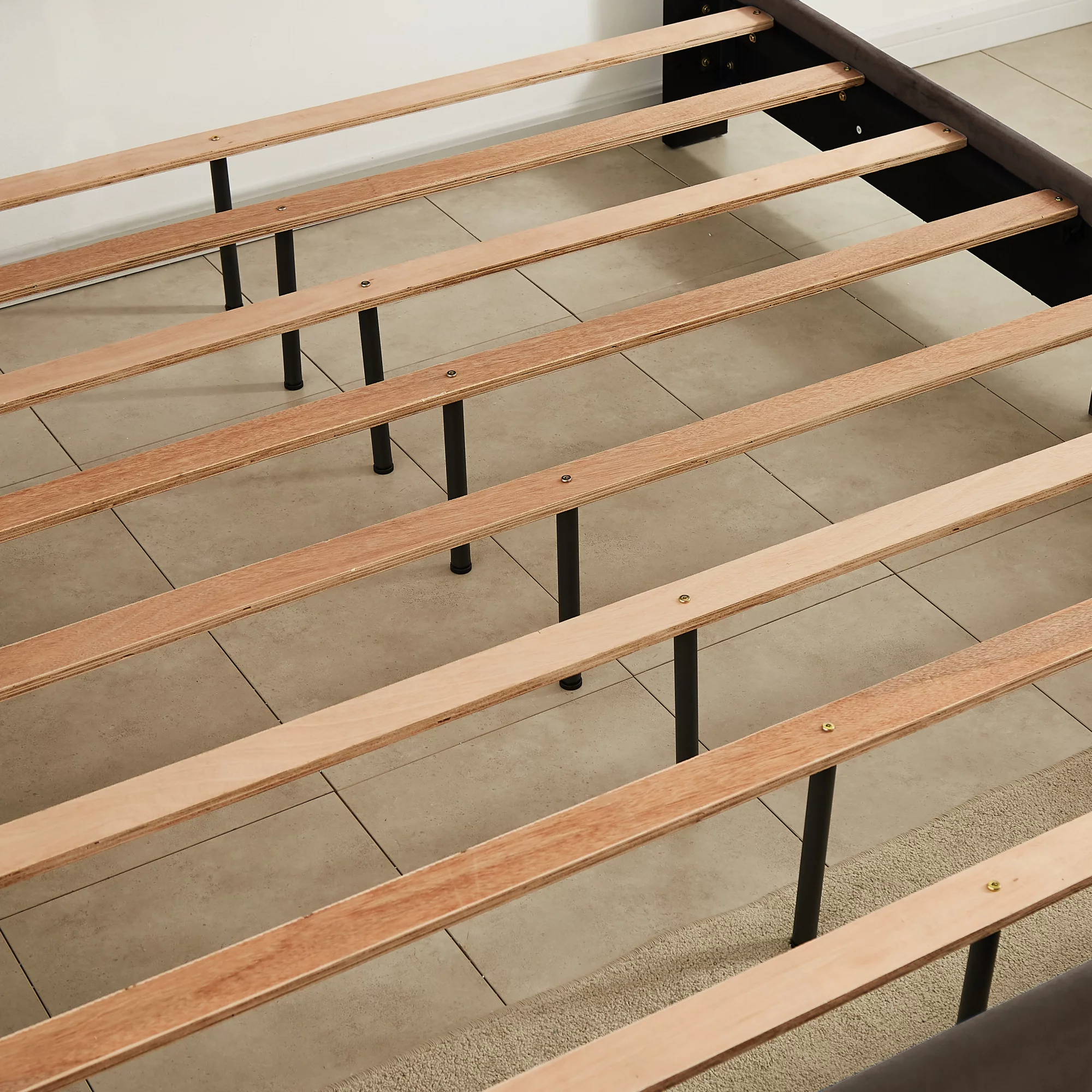 B109 Queen bed .Beautiful brass studs adorn the headboard, strong wooden slats + metal legs with Electroplate