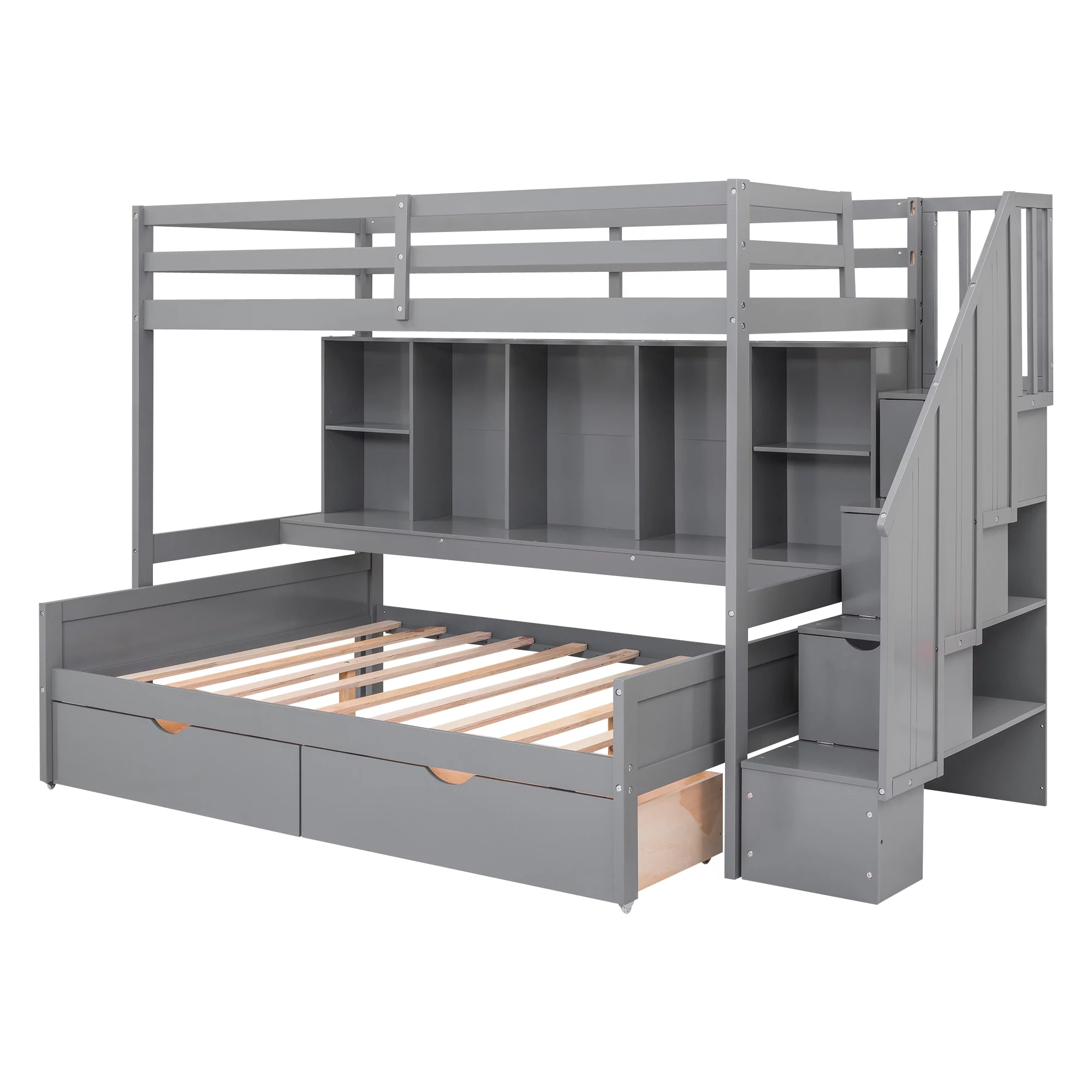 Leadzm Twin XL over Full Bunk Bed with Built-in Storage Shelves, Drawers and Staircase,Gray
