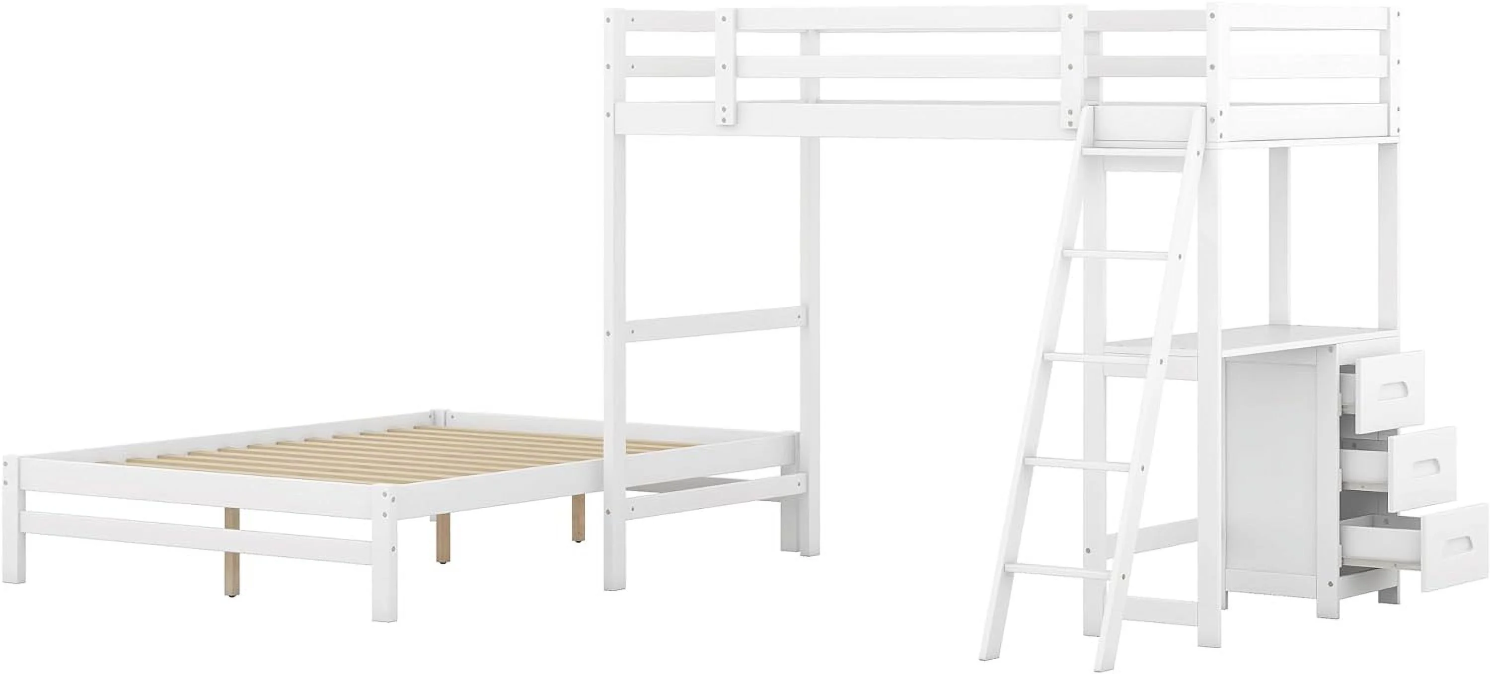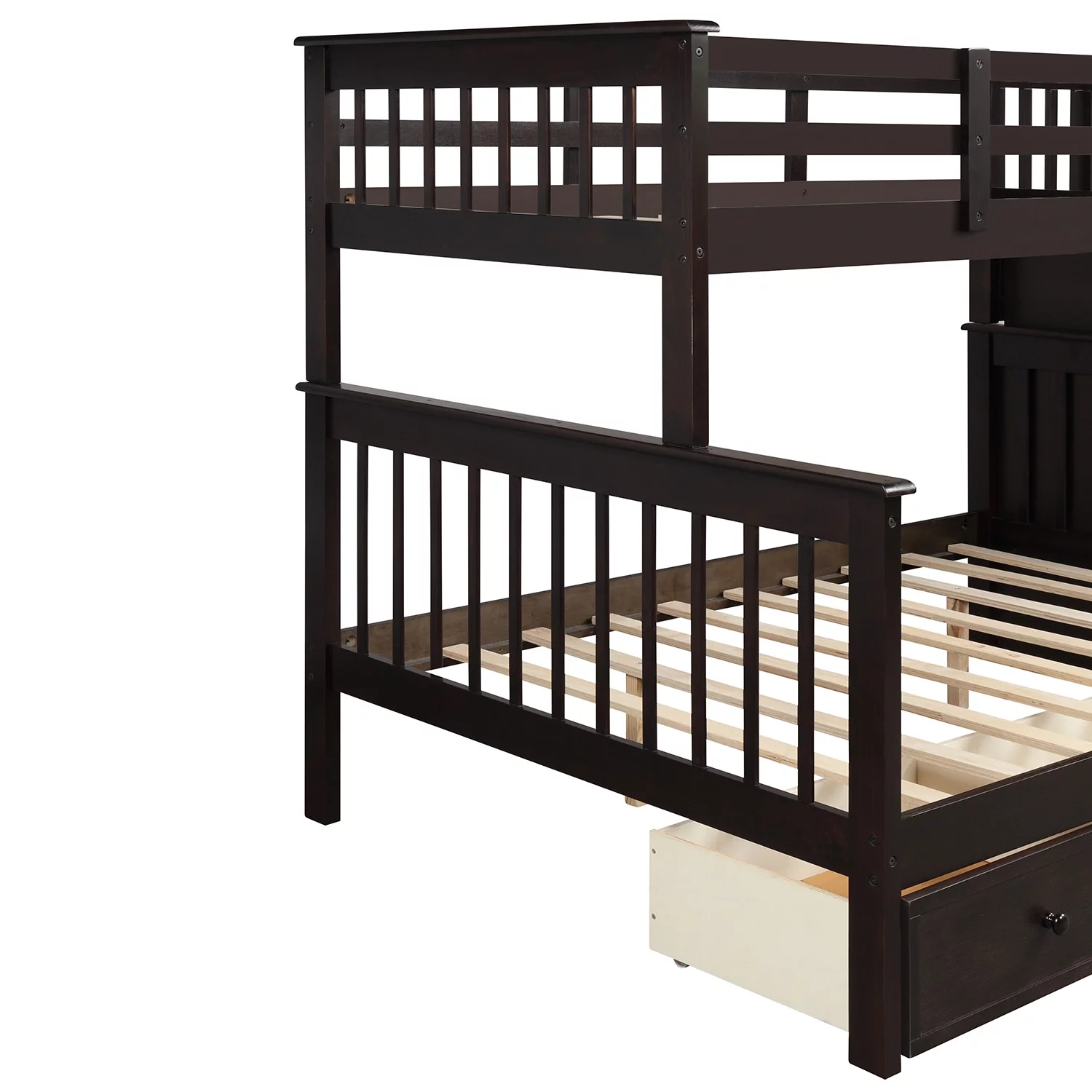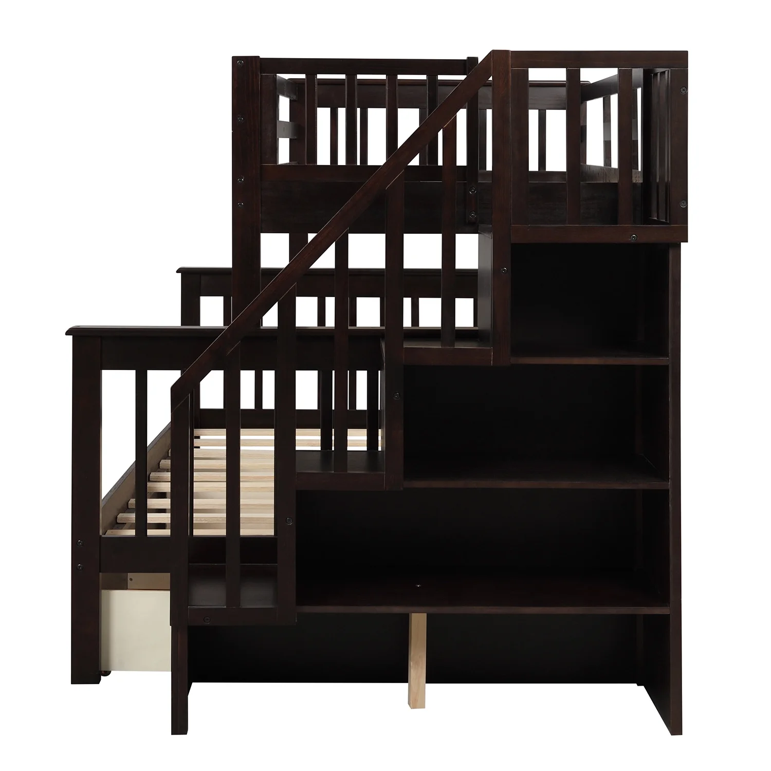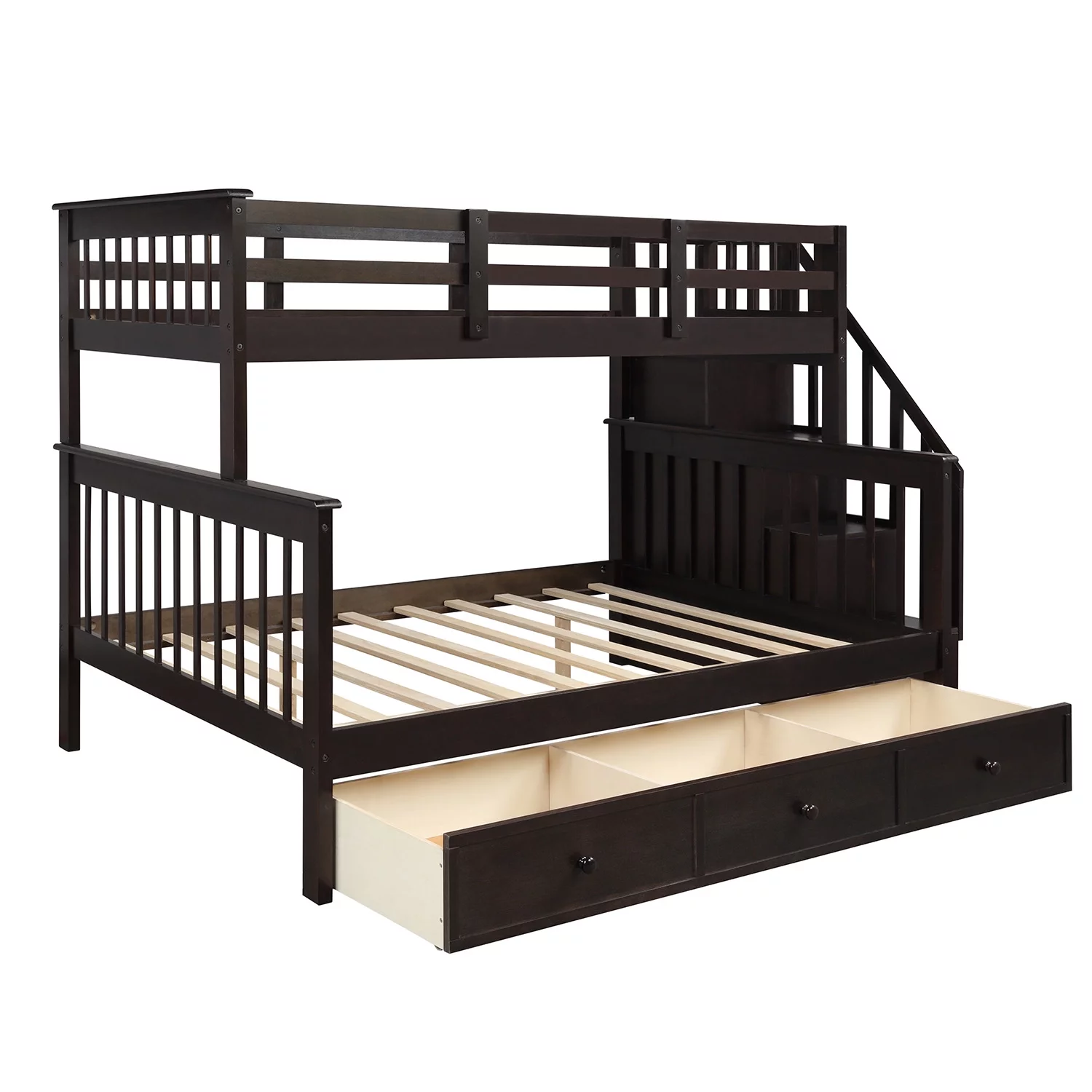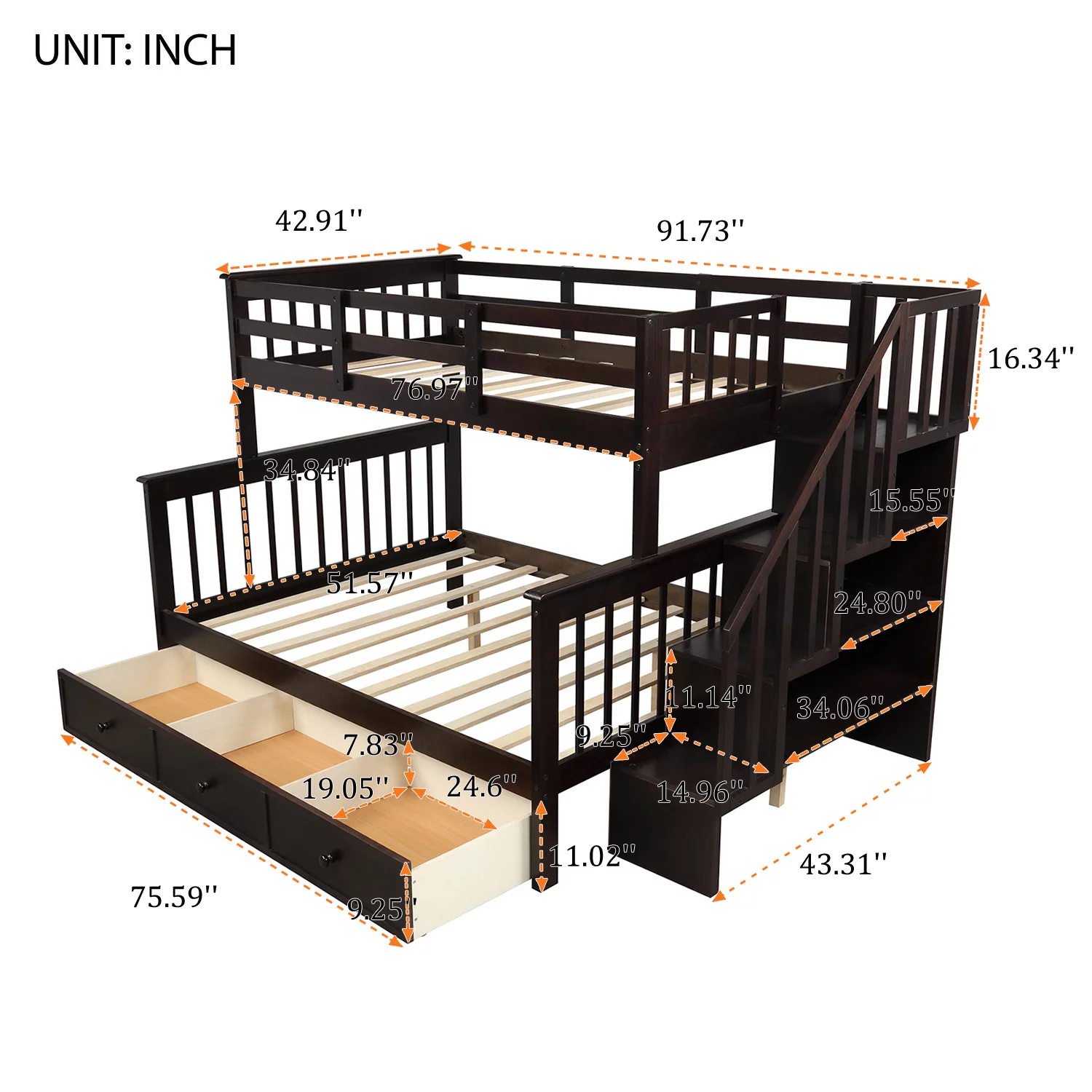 Stairway Bunk Beds Twin Over Full with Drawer, Storage and Guard Rail Twin Over Full Bunk Bed Frame for Kids