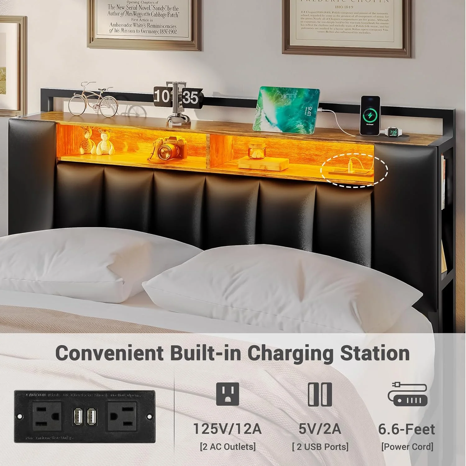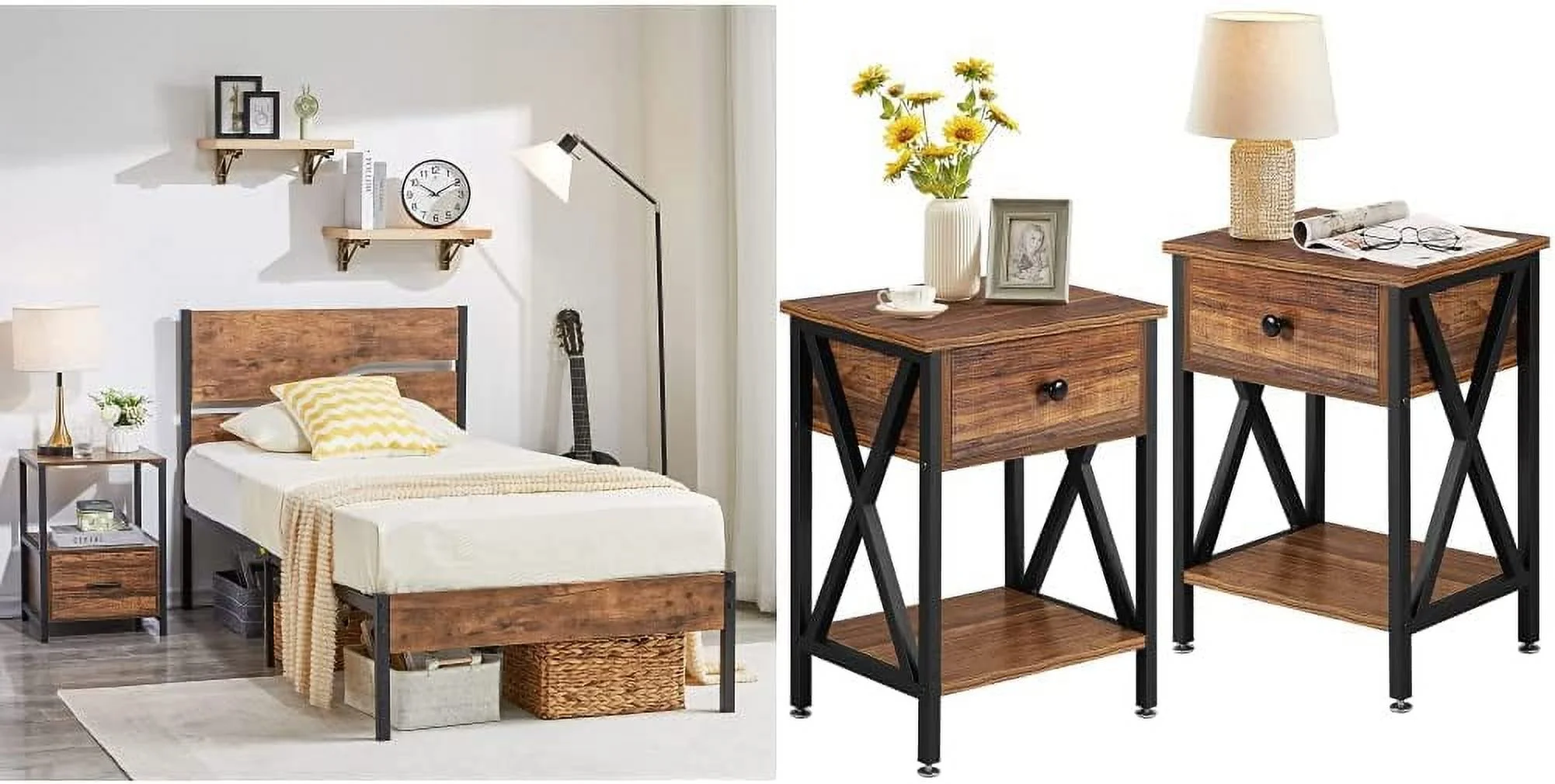 OUWI Platform Bed Frame Twin Size with Rustic Vintage Wood Headboard and Nightstands Set of 2, Modern Bedside End Tables
