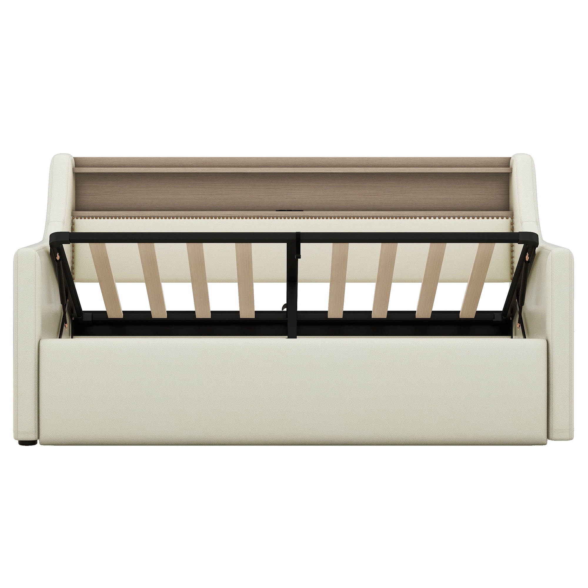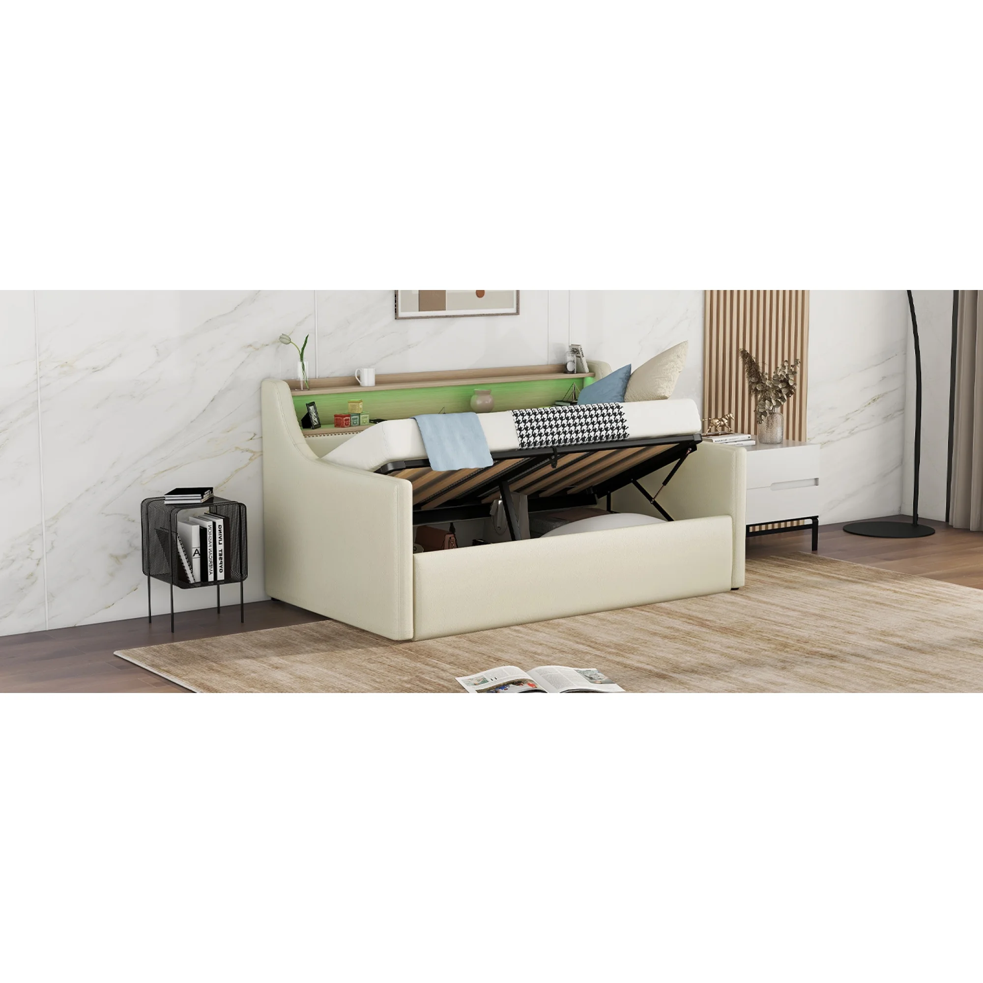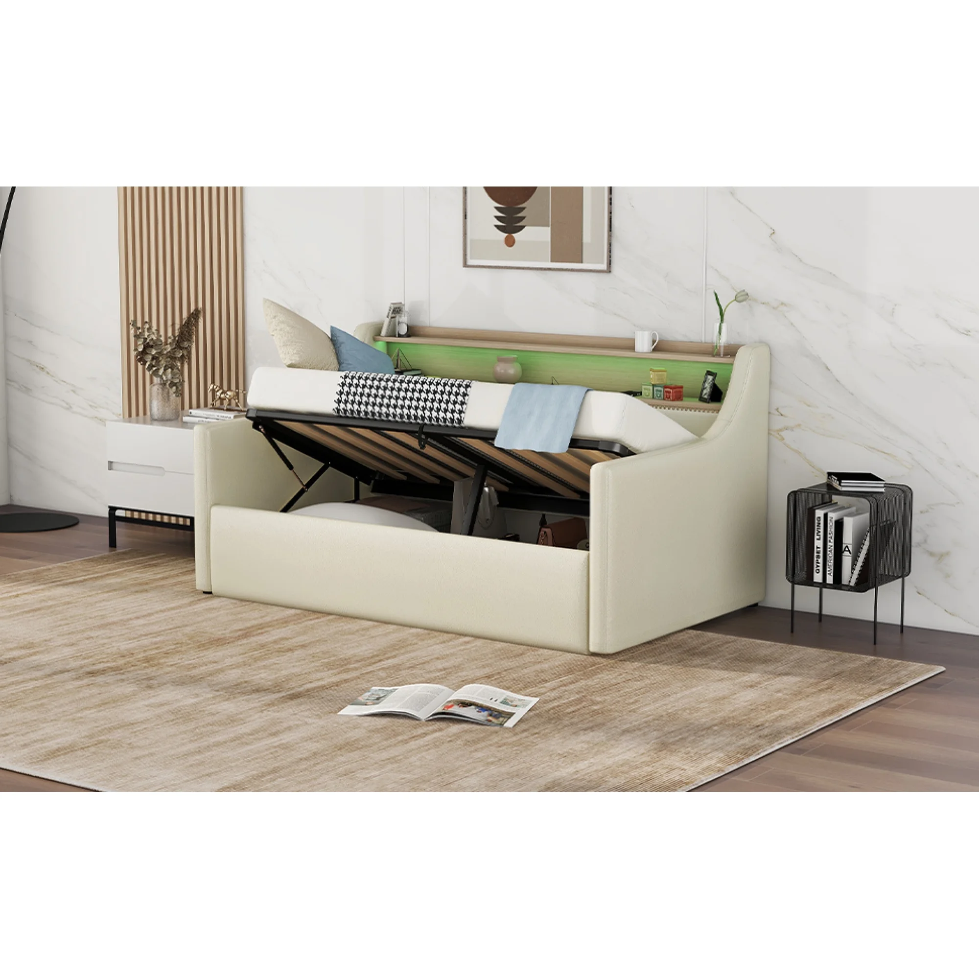 Twin Size Daybed with Hydraulic Storage, Upholstered Daybed with Lift Up Storage, Beige
