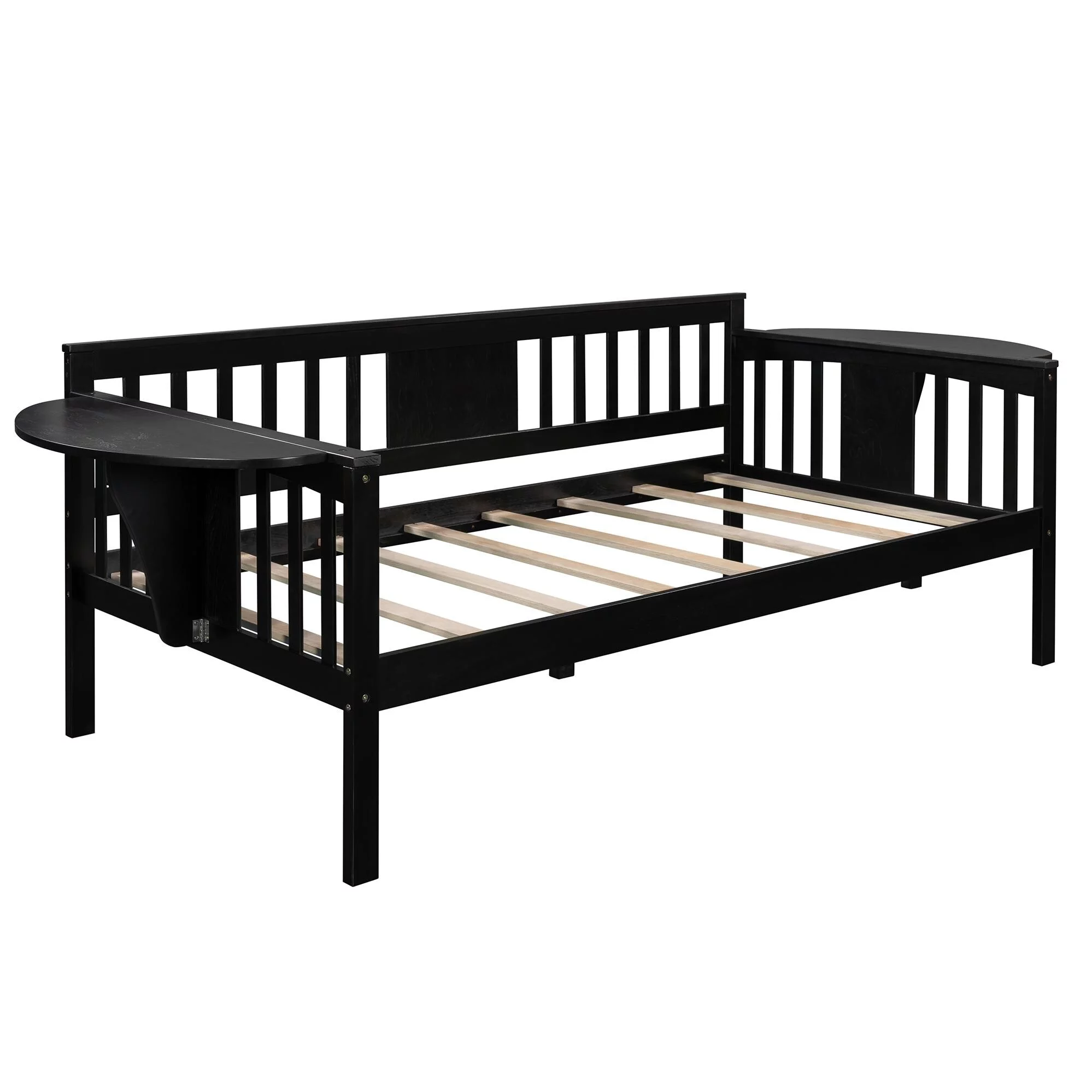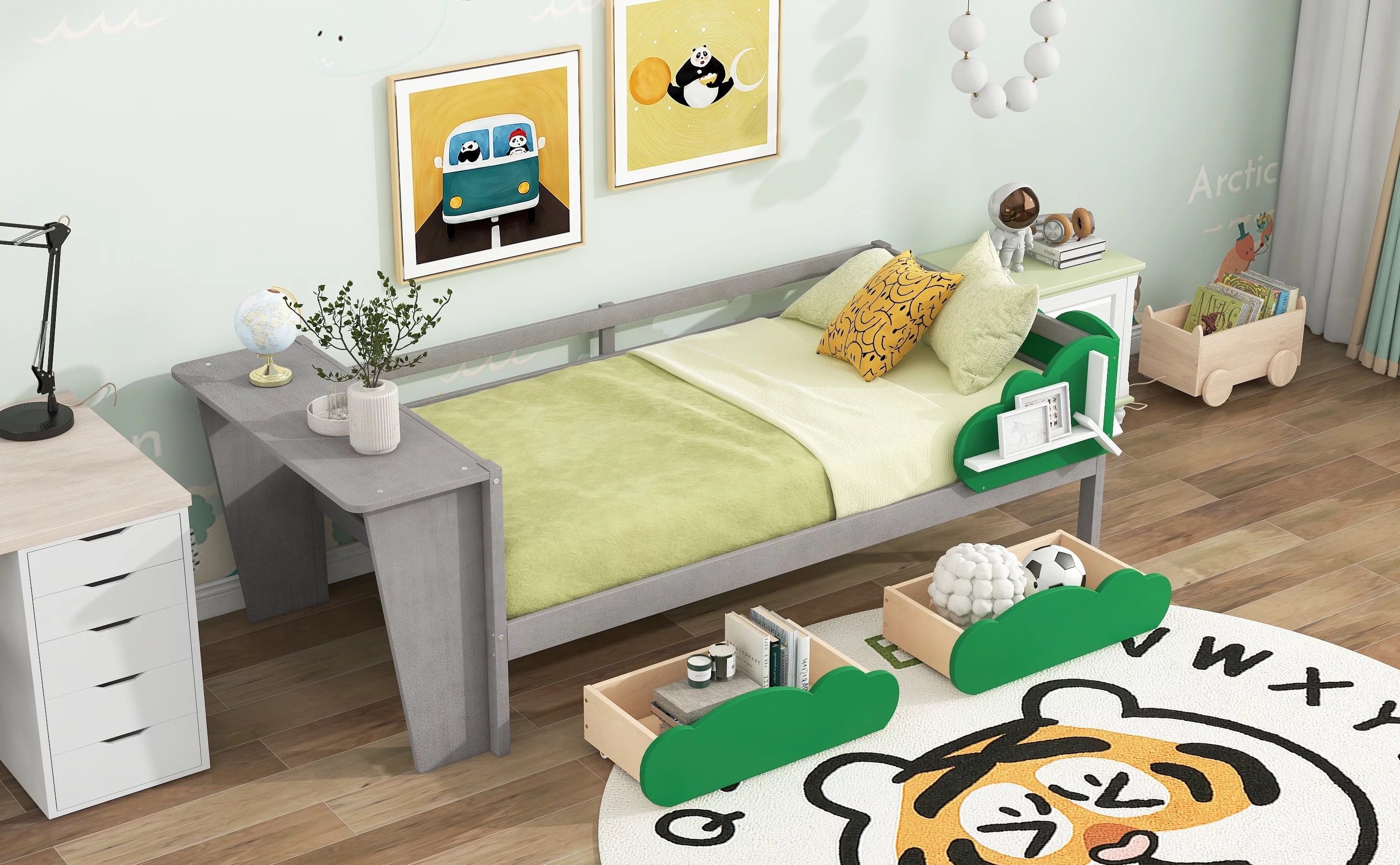 Twin Size Daybed with Desk, Green Leaf Shape Drawers and Shelves, Gray