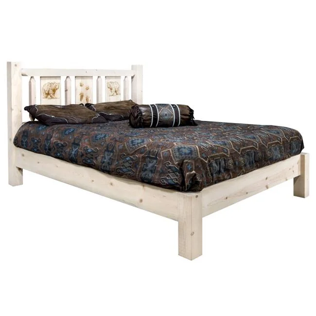 Montana Woodworks Montana Platform Bed with Storage, Queen with Laser Engraved Bear Design, Clear Lacquer
