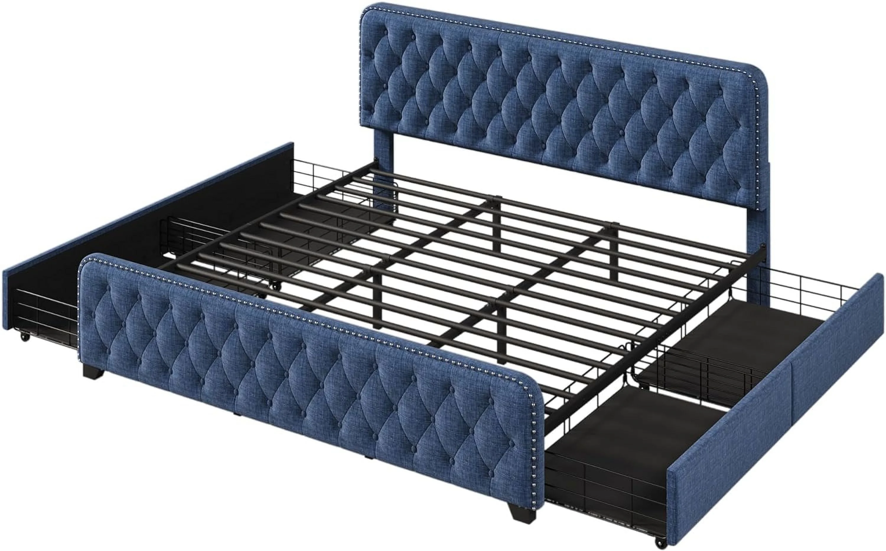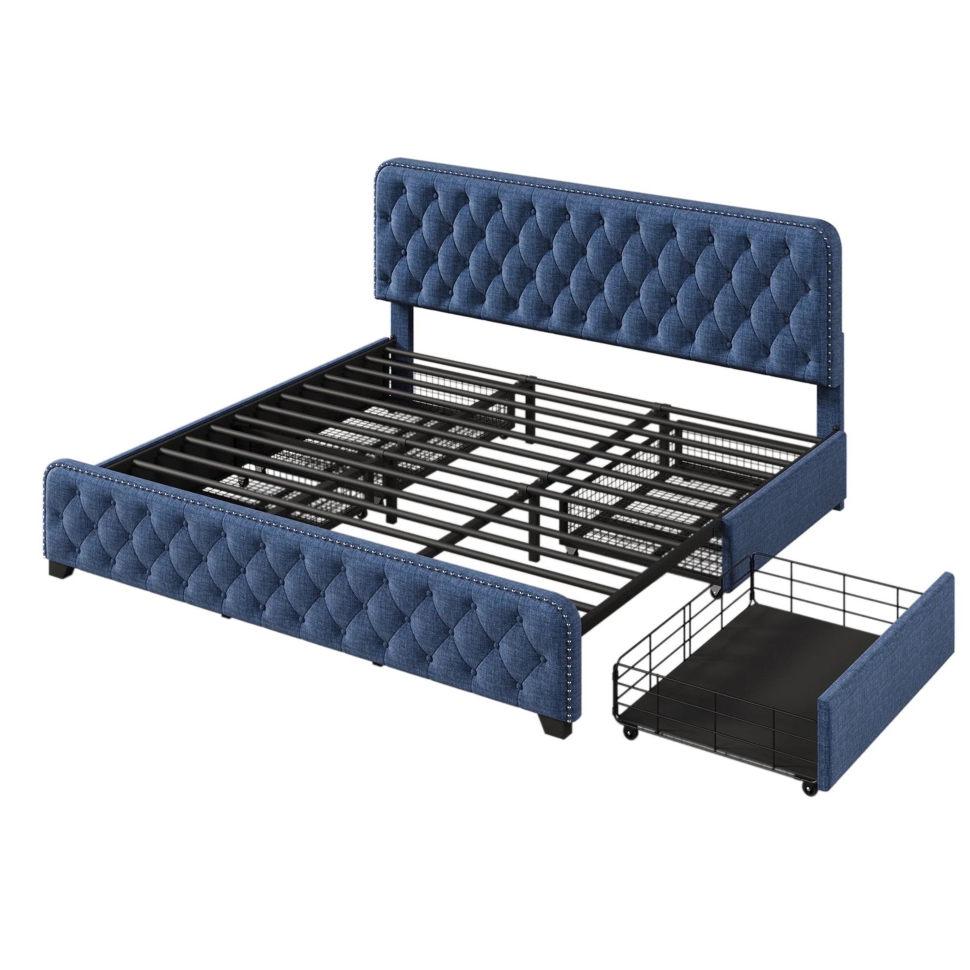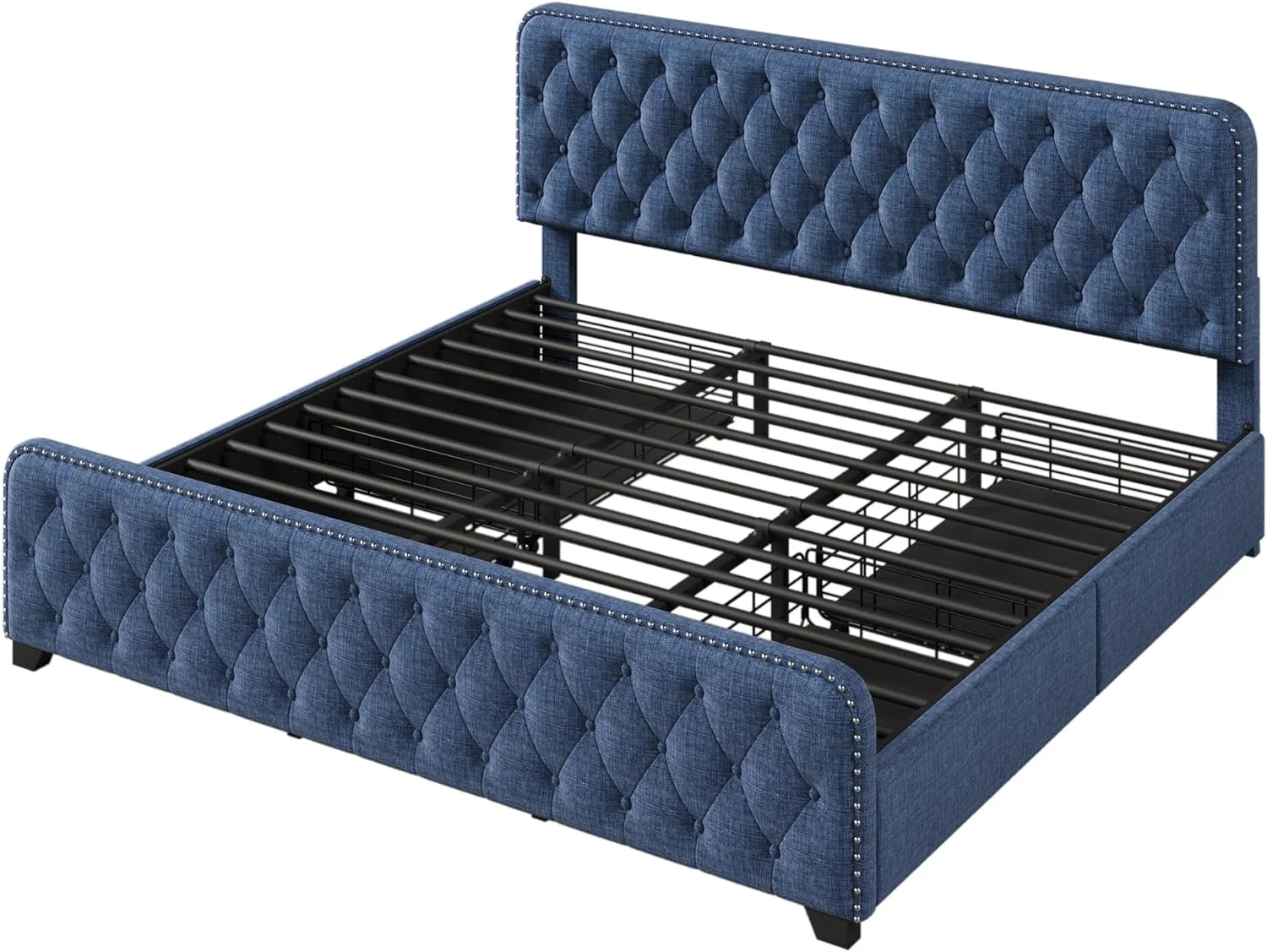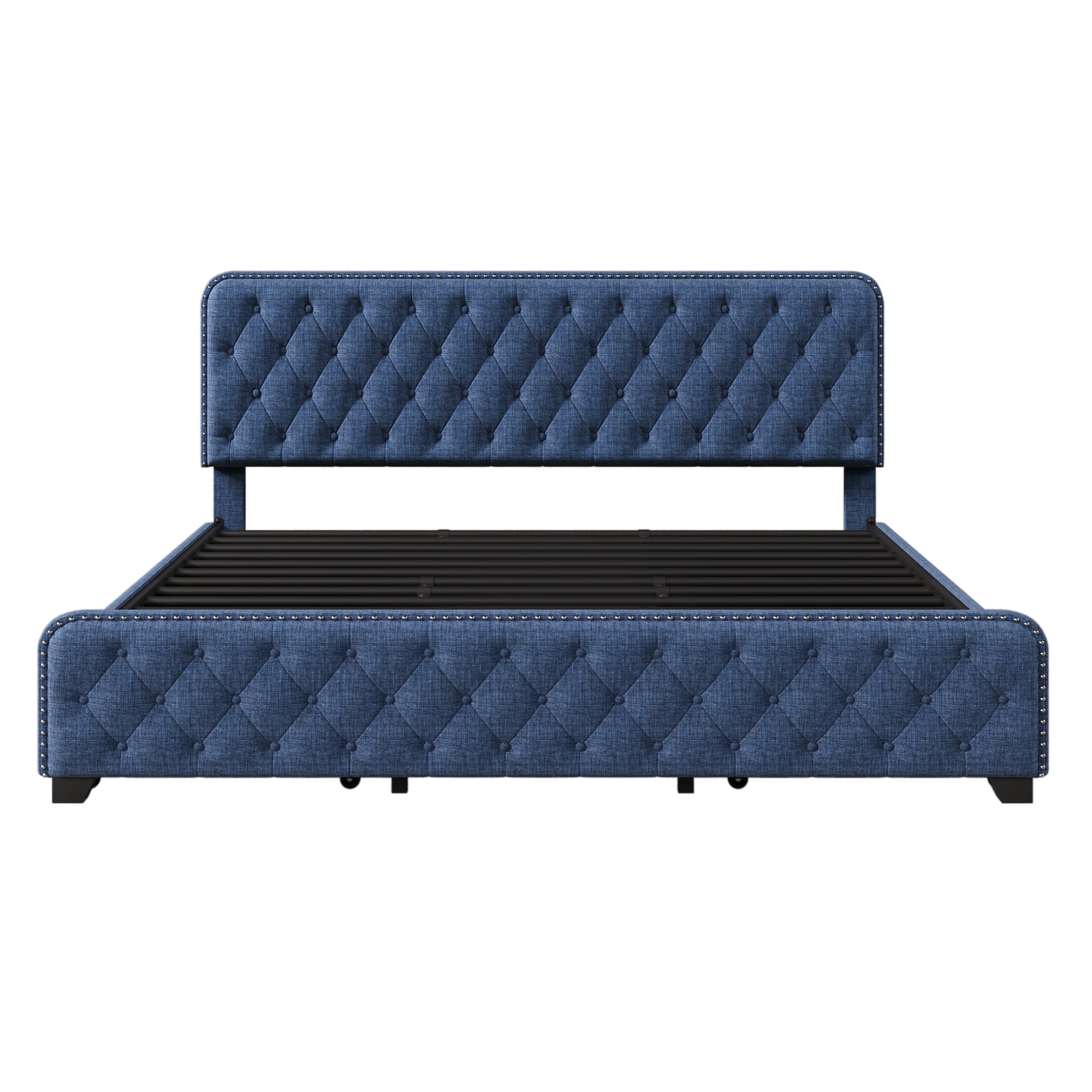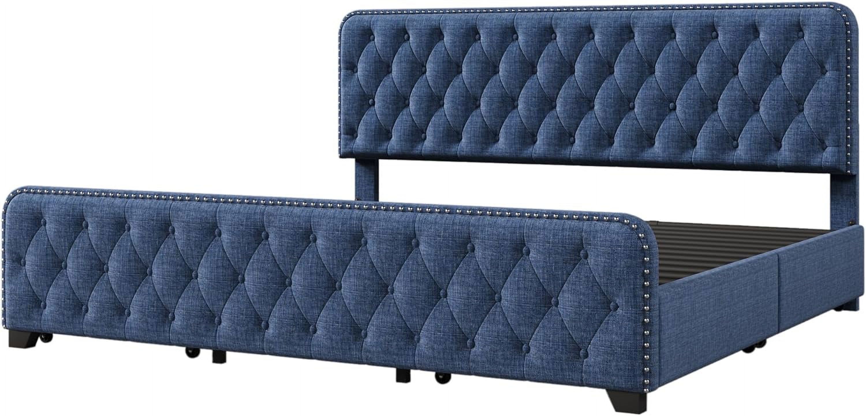 Beige Upholstered Platform Bed Frame with Four Drawers, Button Tufted Headboard and Footboard Sturdy Wood Slat Support, KING