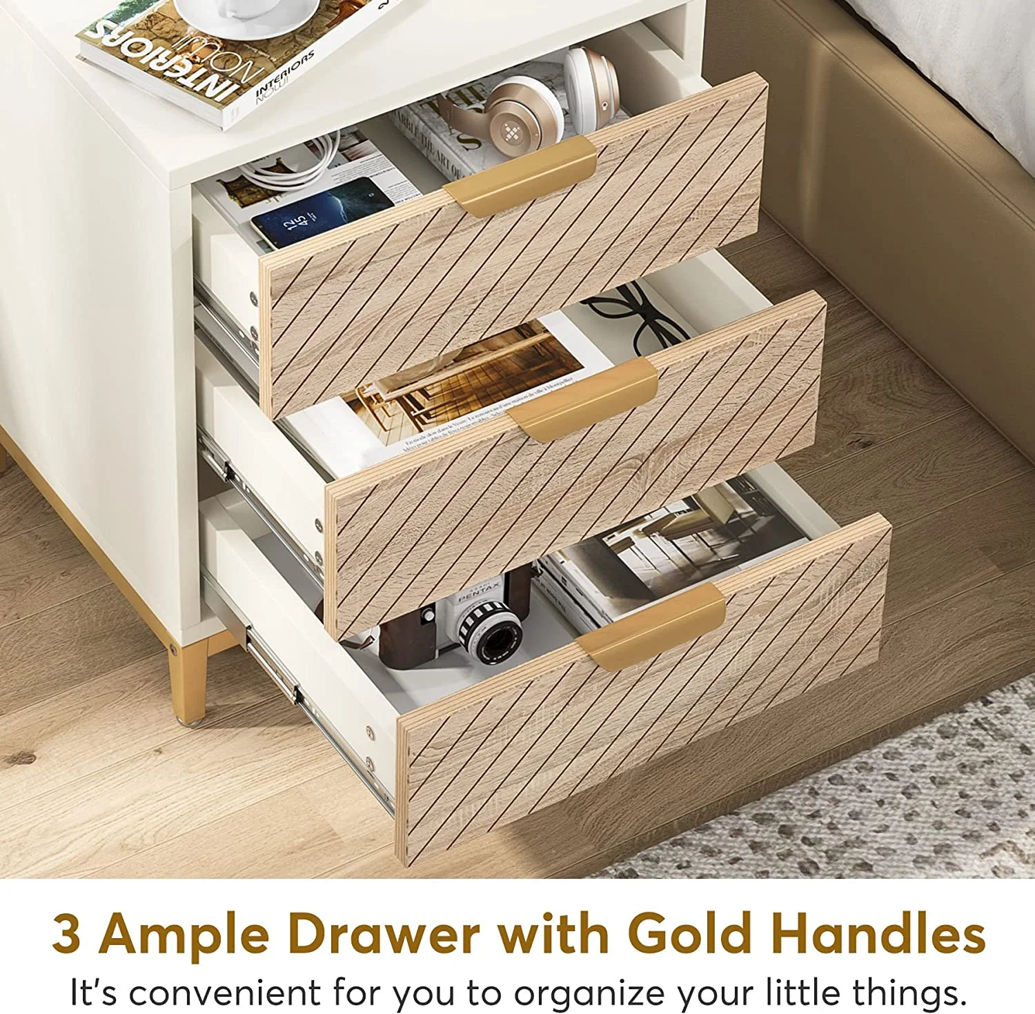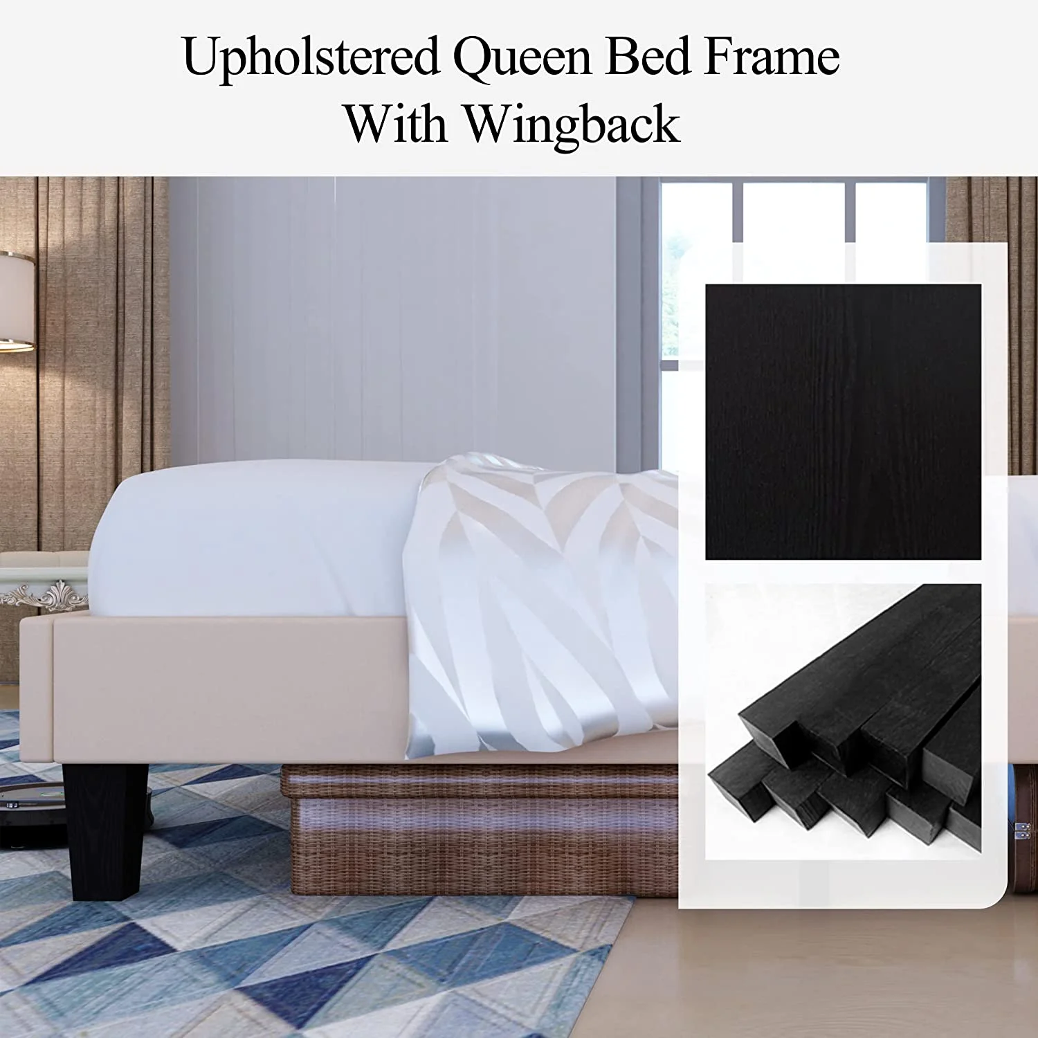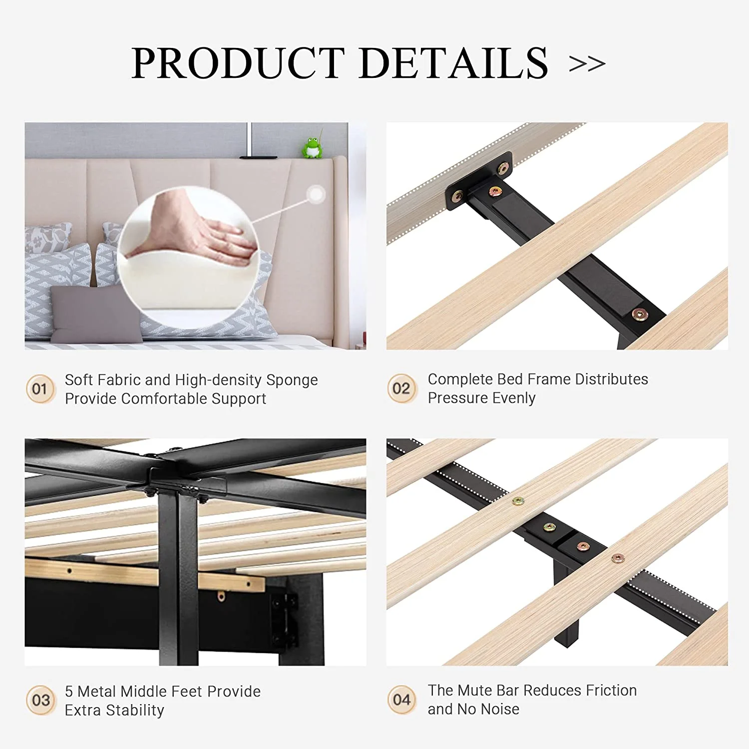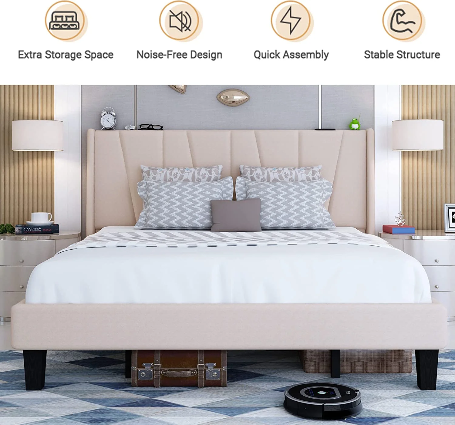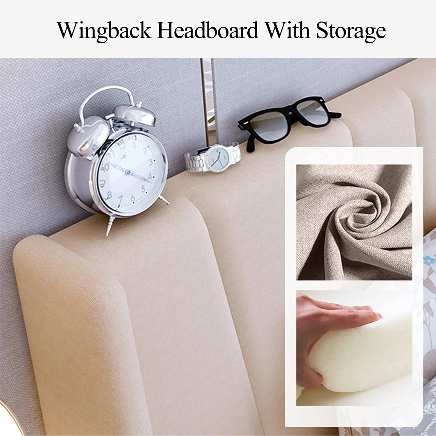 Beige Upholstered Platform Bed Frame with Four Drawers, Button Tufted Headboard and Footboard Sturdy Wood Slat Support, KING