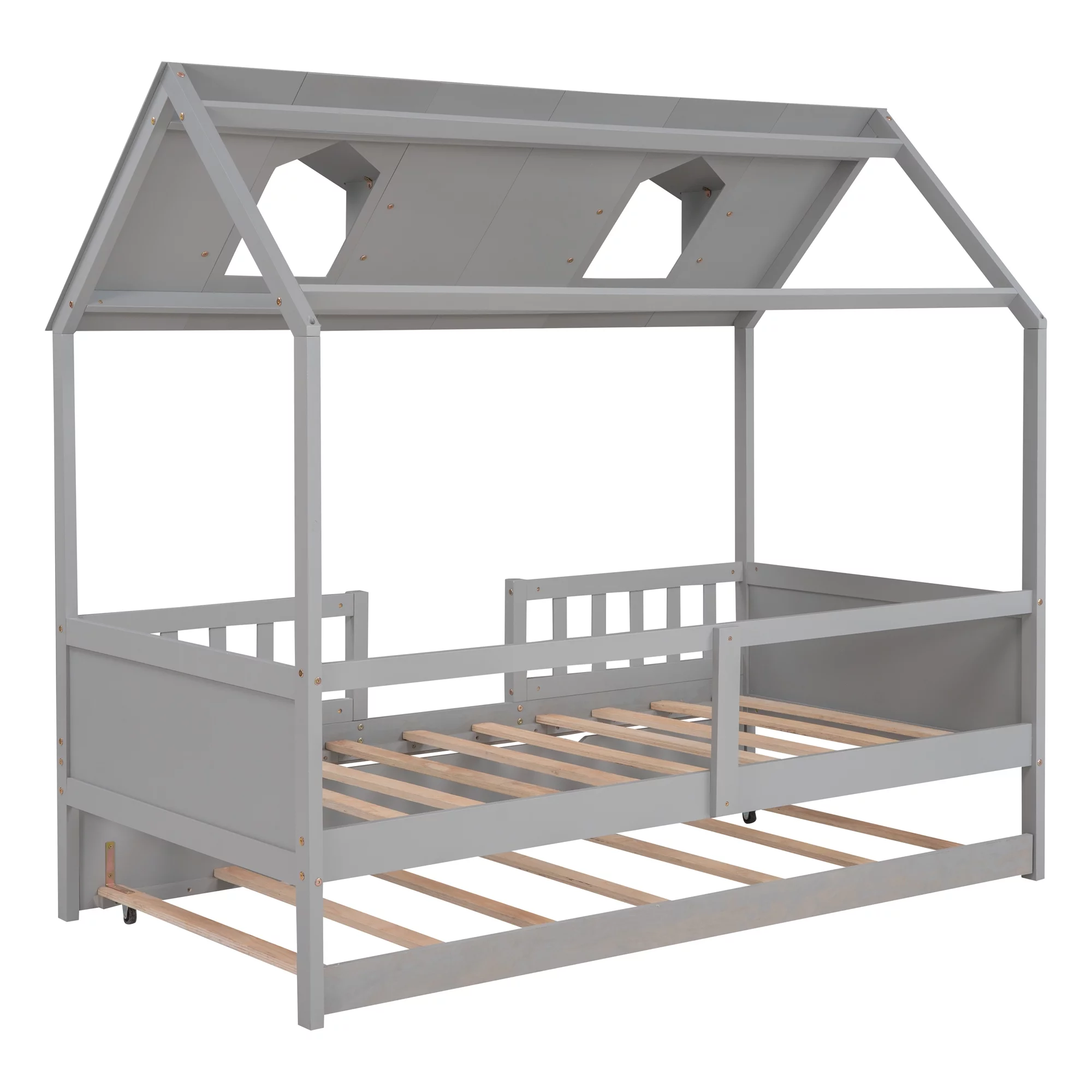 CoSoTower Twin Size House Bed Wood Bed with Twin Size Trundle ( Gray )