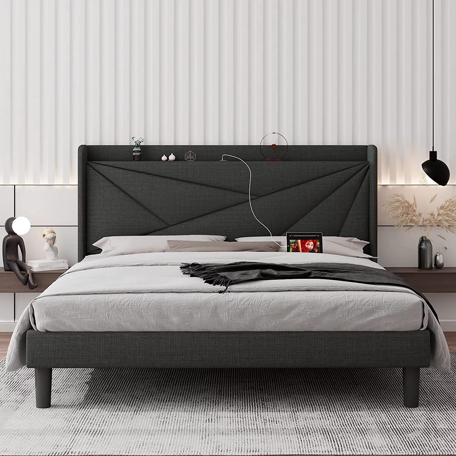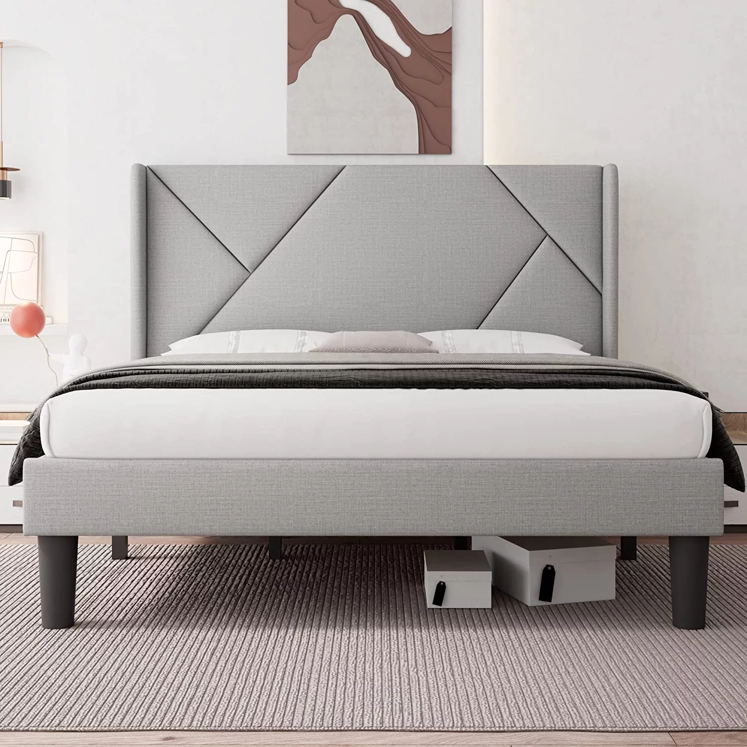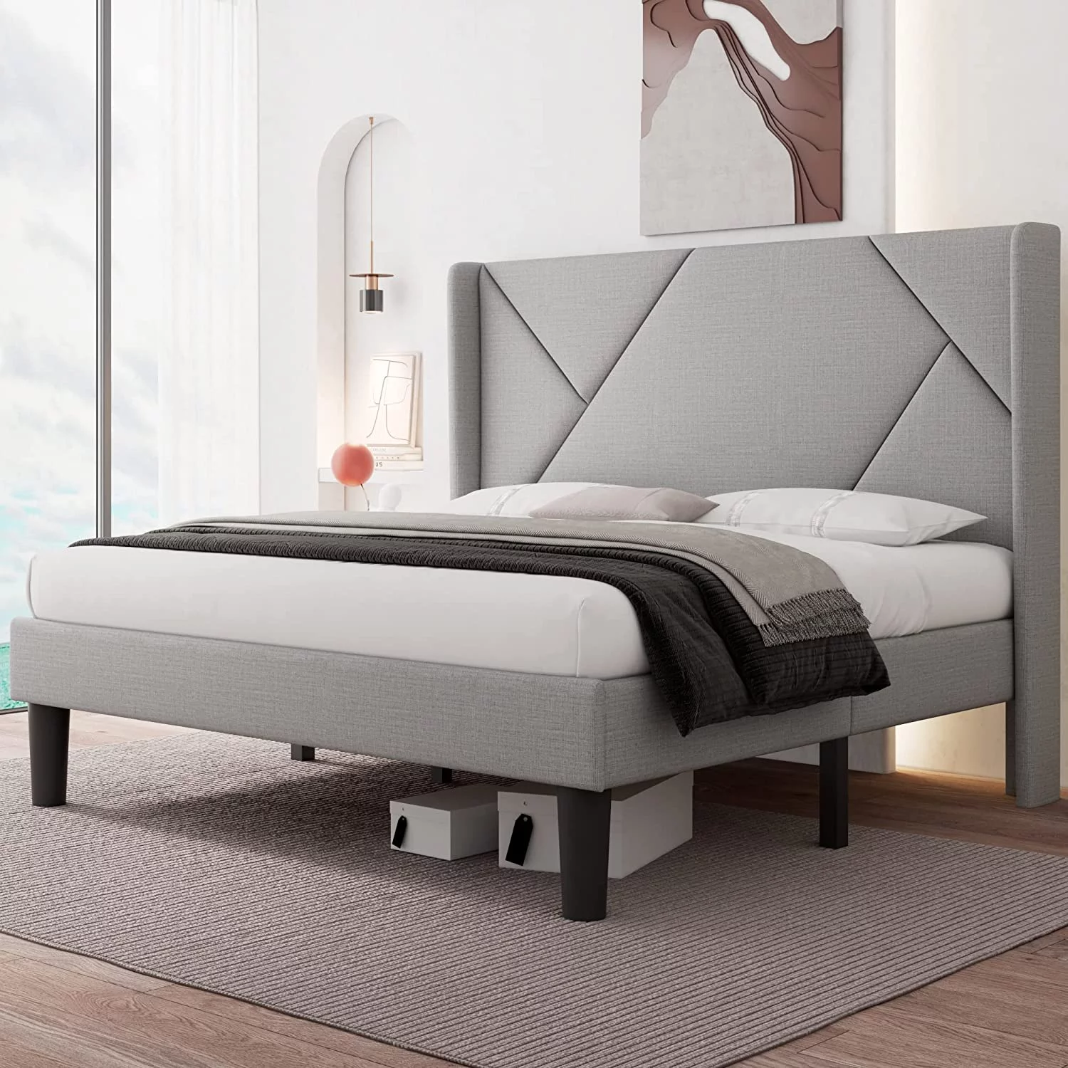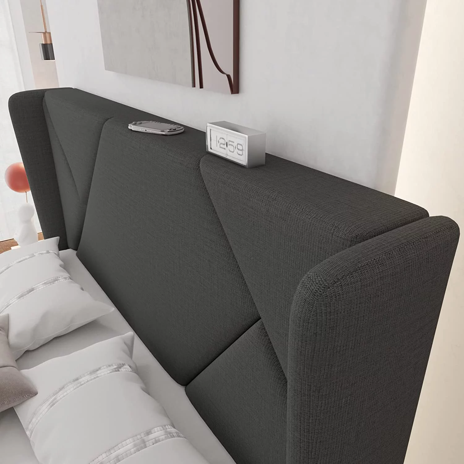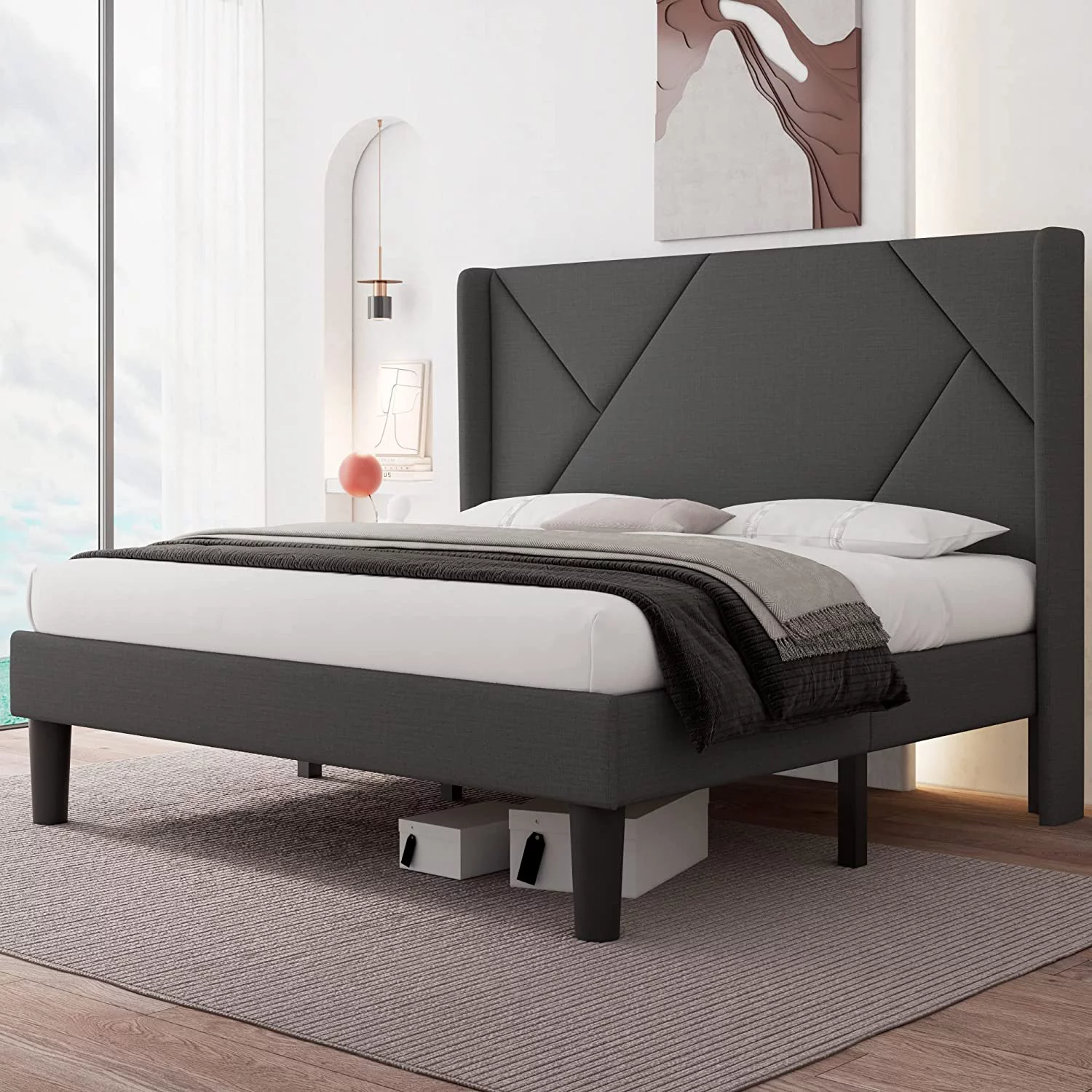 Benjara Asir King Size Bed, Geometric Panel Headboard, Modern Gray Wood Finish