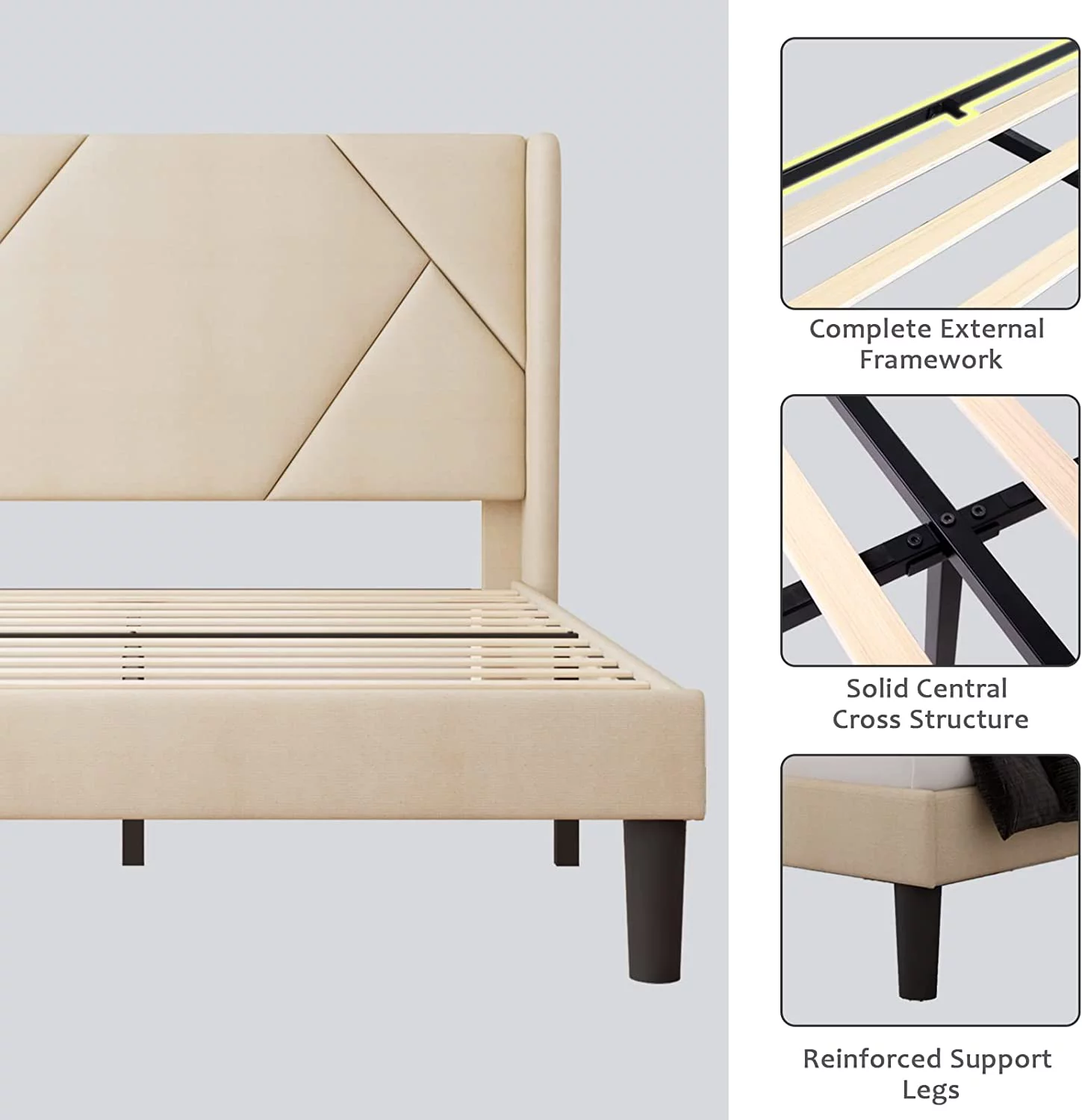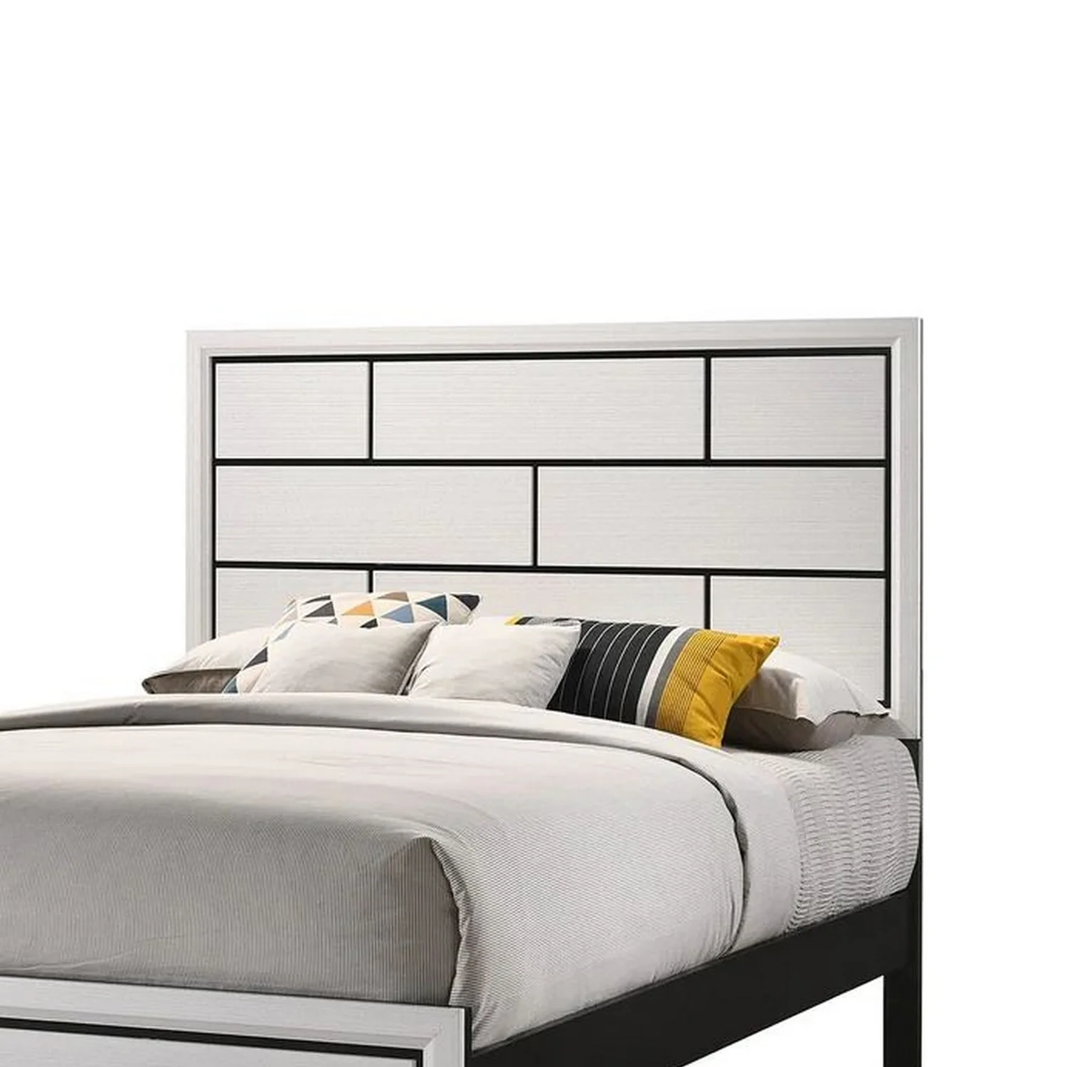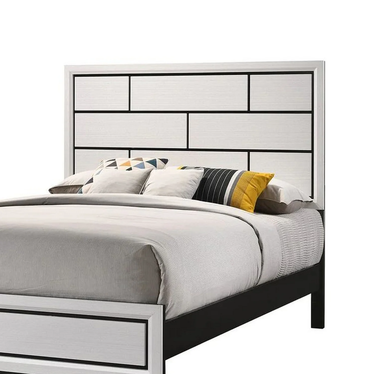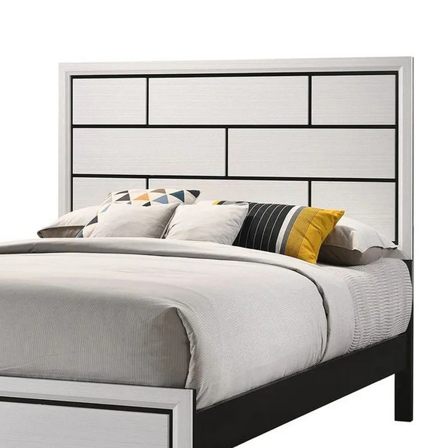 Benjara Asir Queen Size Bed, Geometric Panel Headboard, Modern White Wood Finish