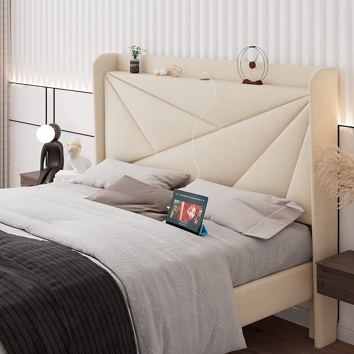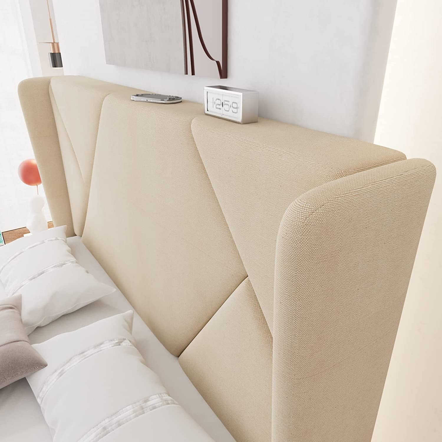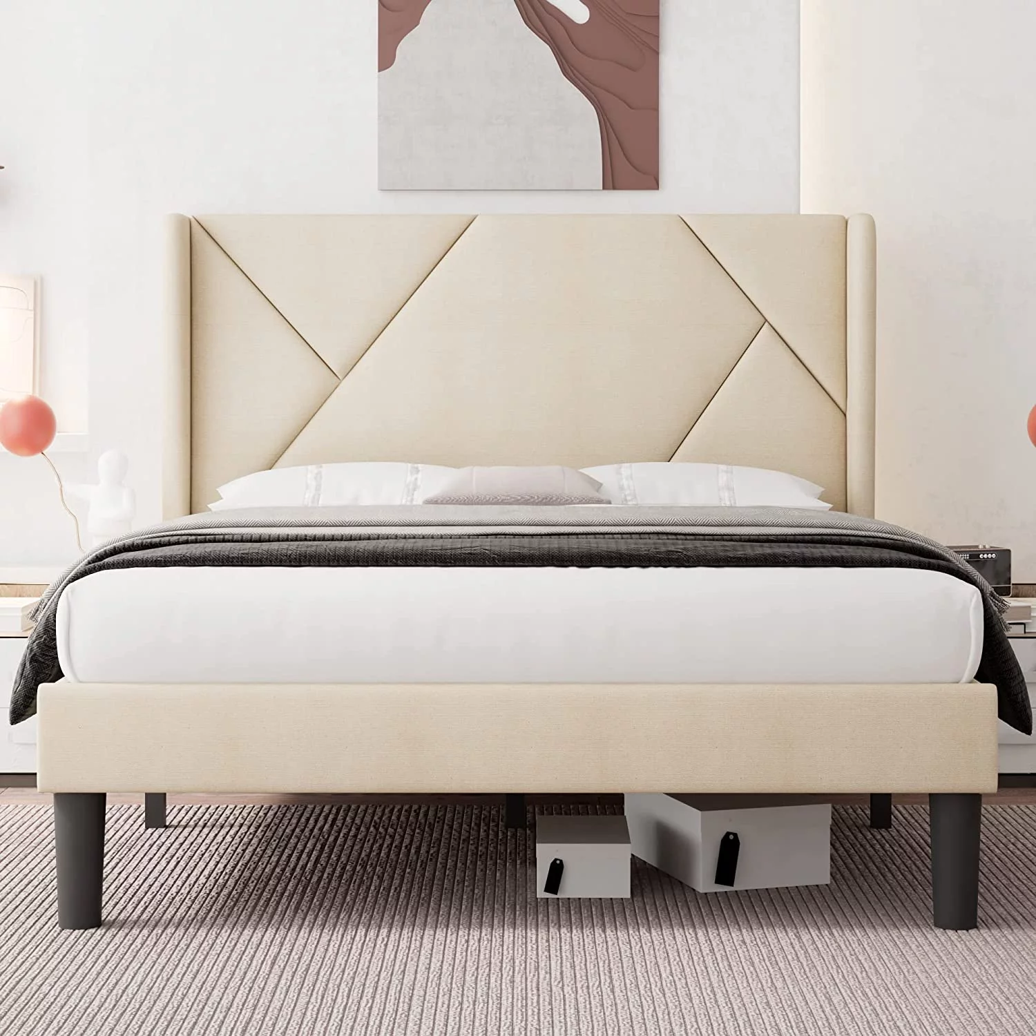 Benjara Asir Queen Size Bed, Geometric Panel Headboard, Modern White Wood Finish
