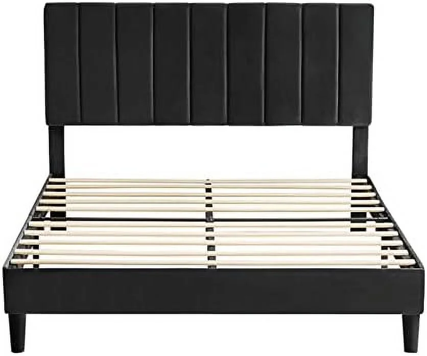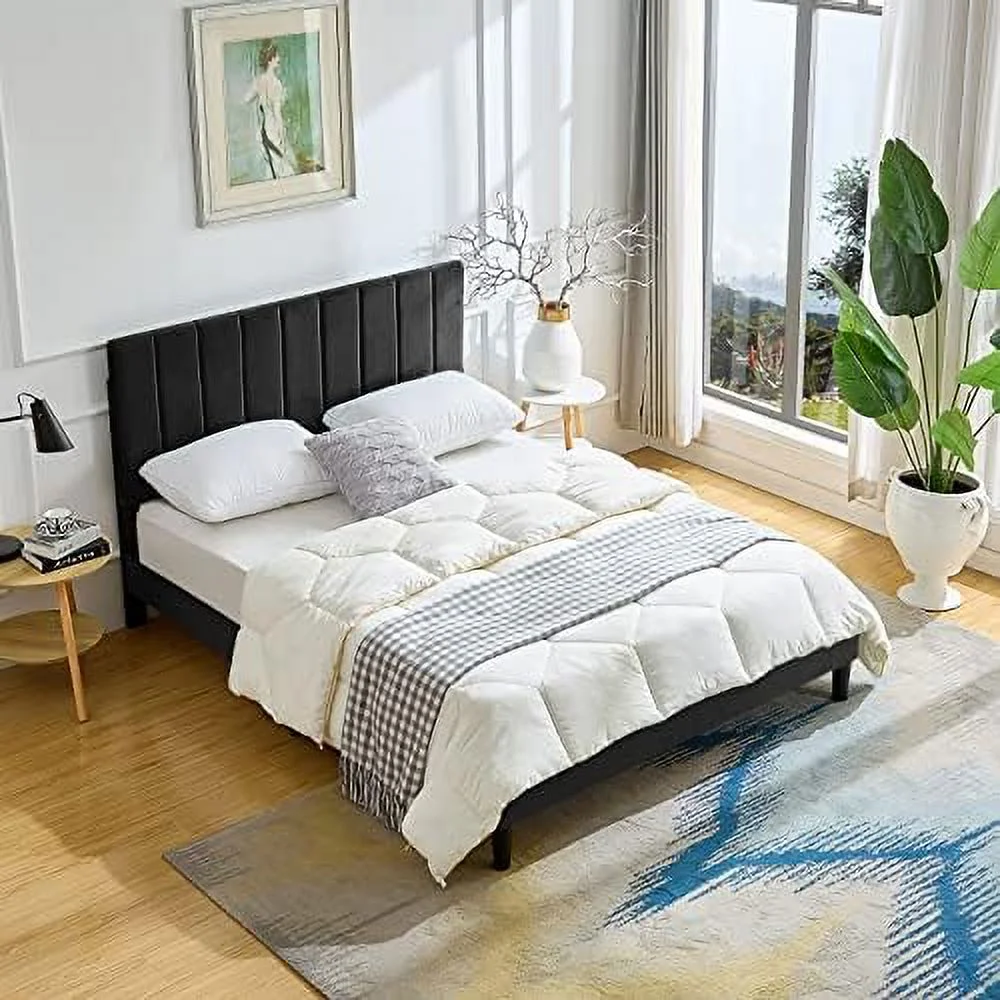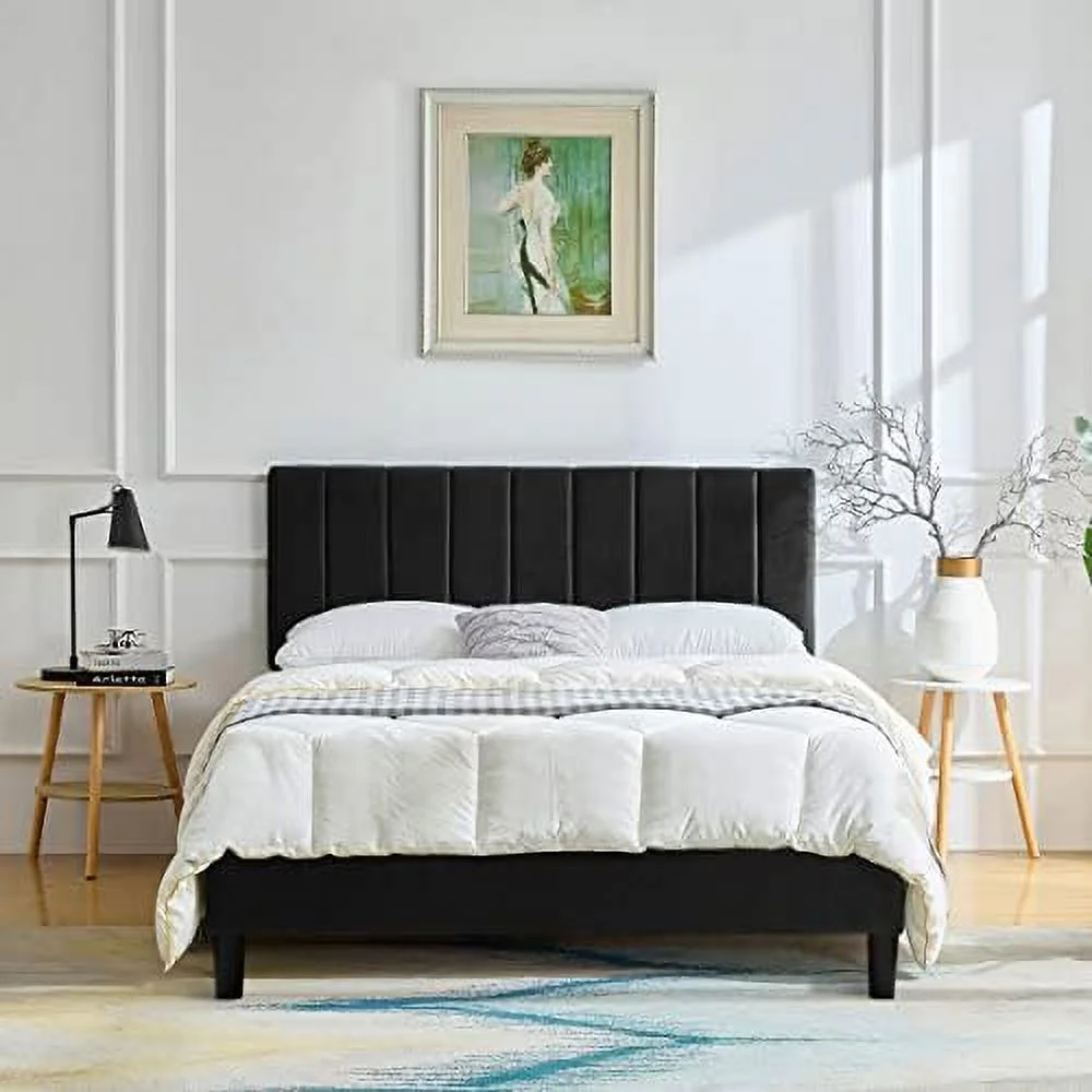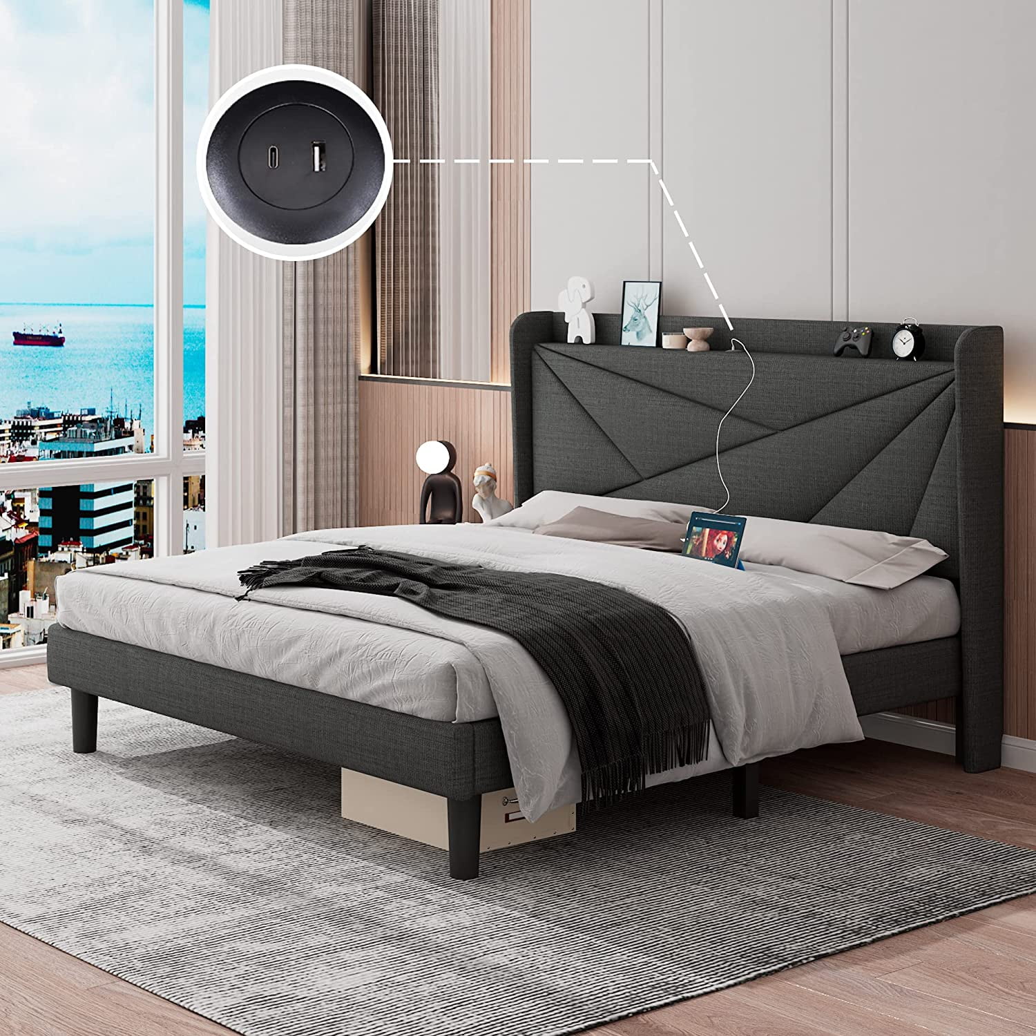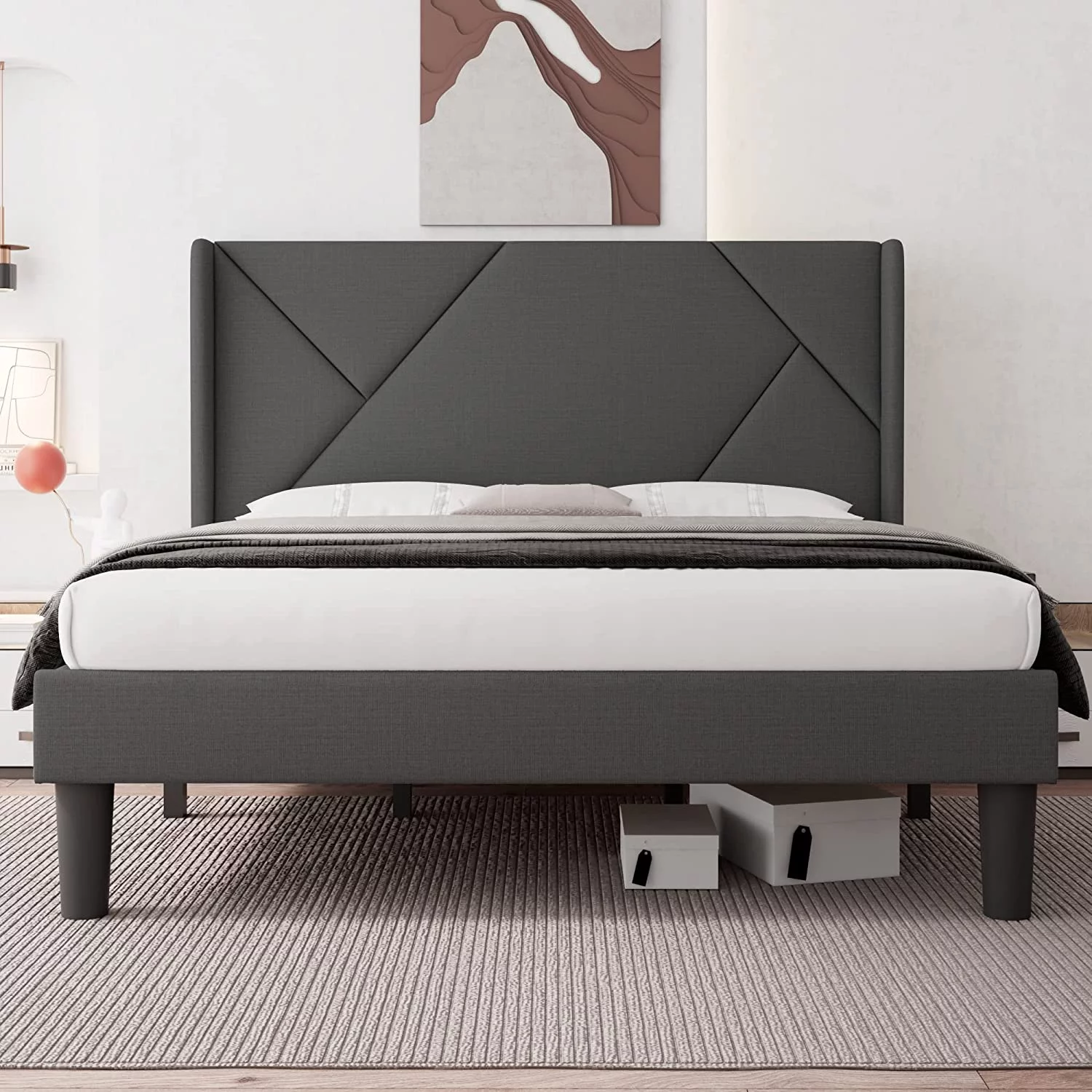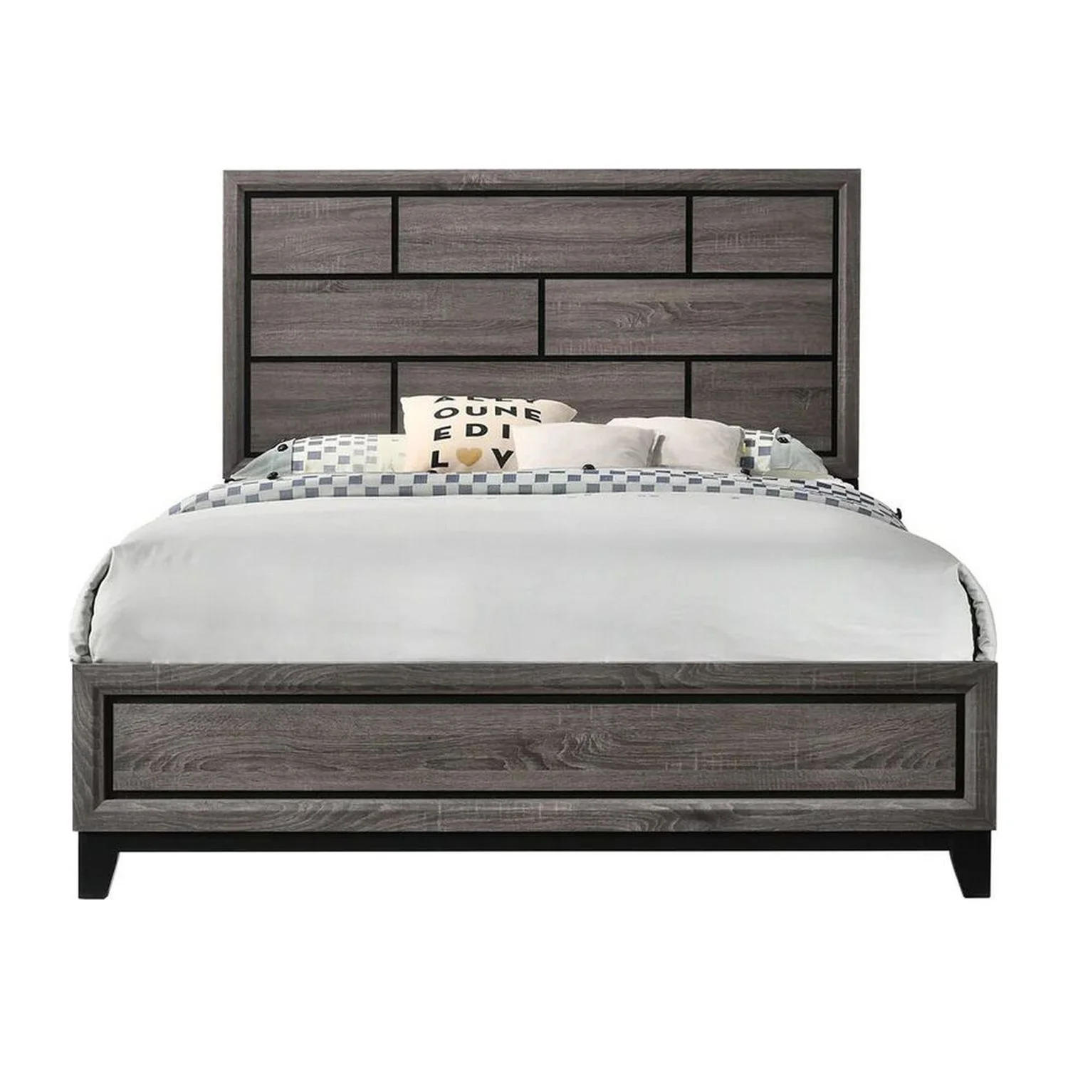 Benjara Asir Full Size Bed, Geometric Panel Headboard, Modern Gray Wood Finish