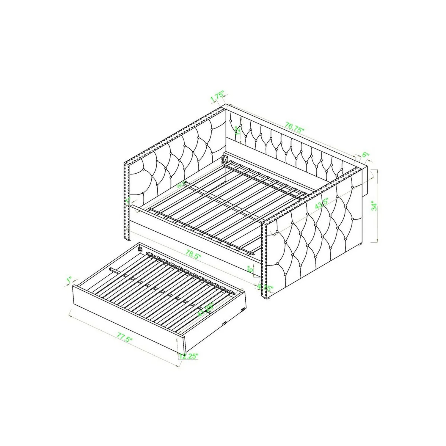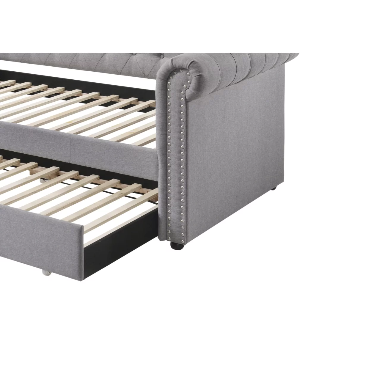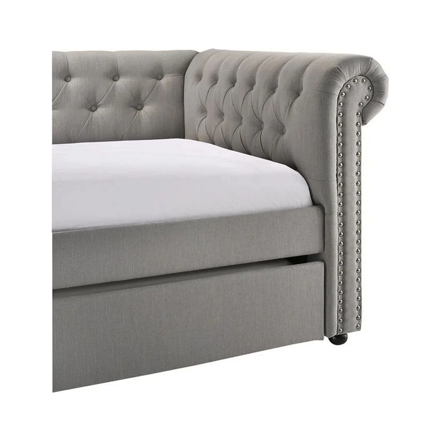 Benjara Trace Trundle Daybed, Gray Fabric Upholstery, Chesterfield, Nailhead Trim