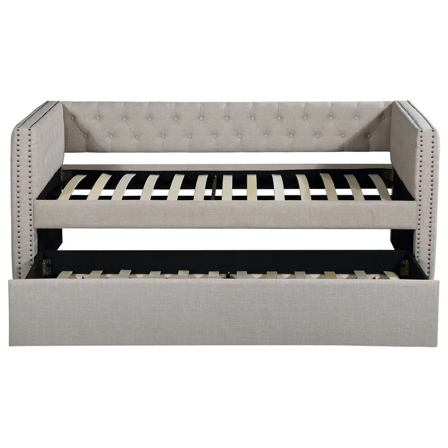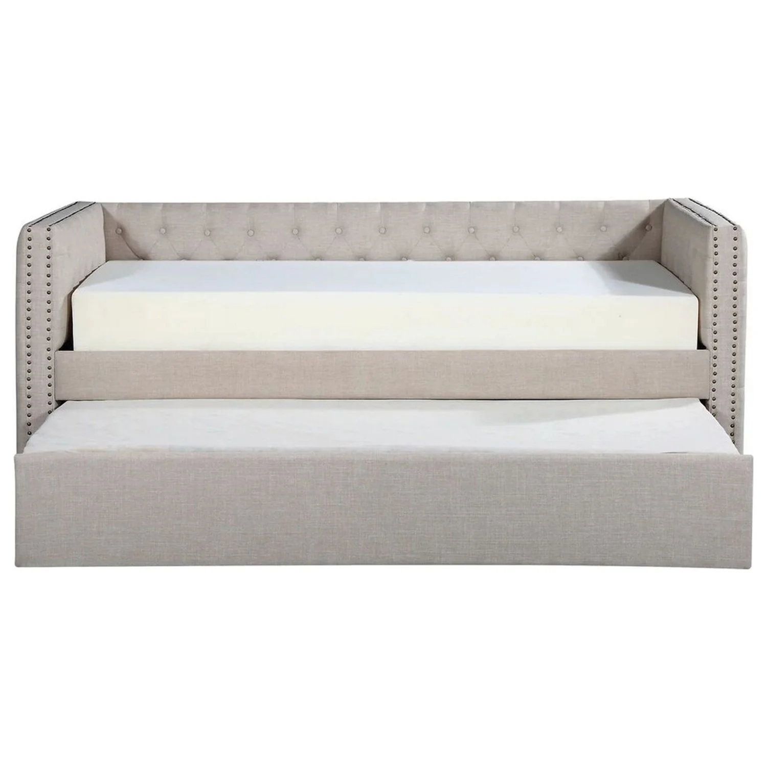 Benjara Trace Trundle Daybed, White Fabric Upholstery, Chesterfield, Nailhead Trim