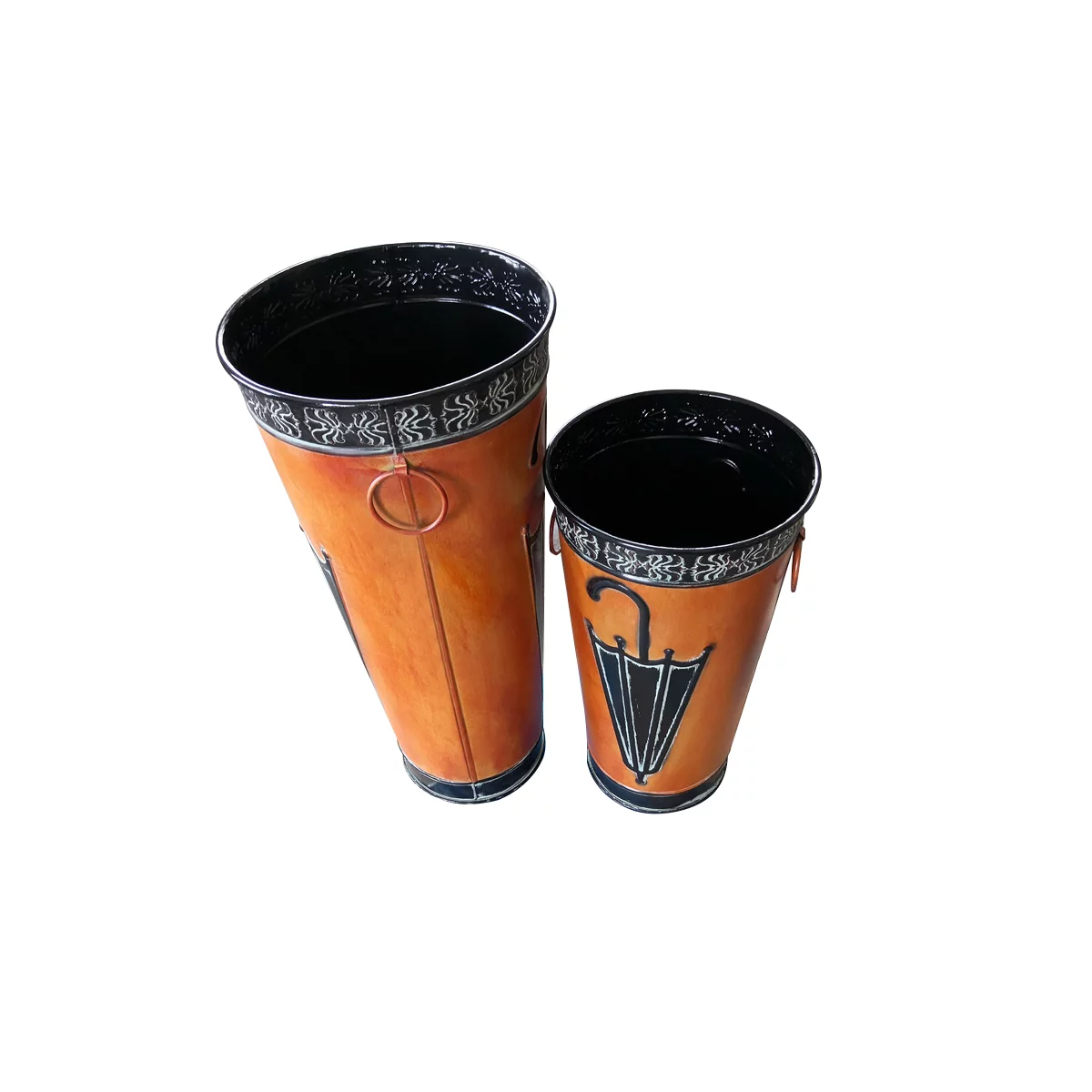 21, 16 Inch Metal Umbrella Stands, Engraved Artwork, Set of 2, Antique Brown, Black