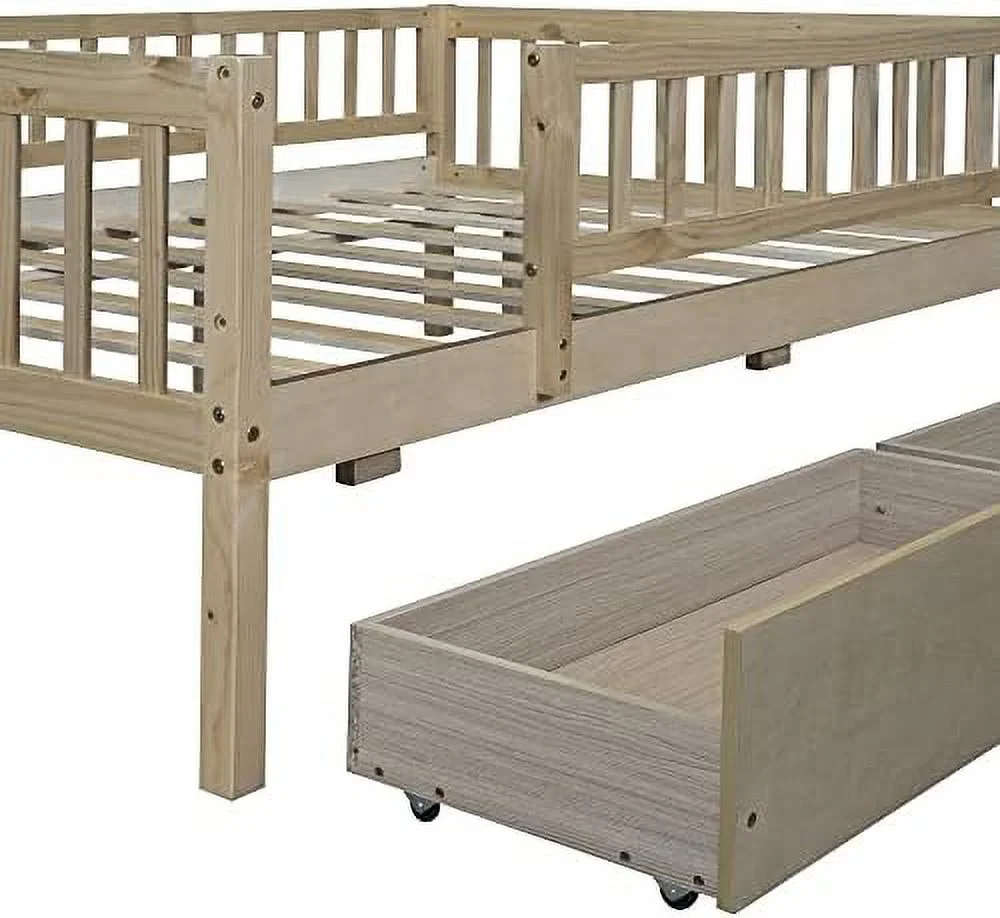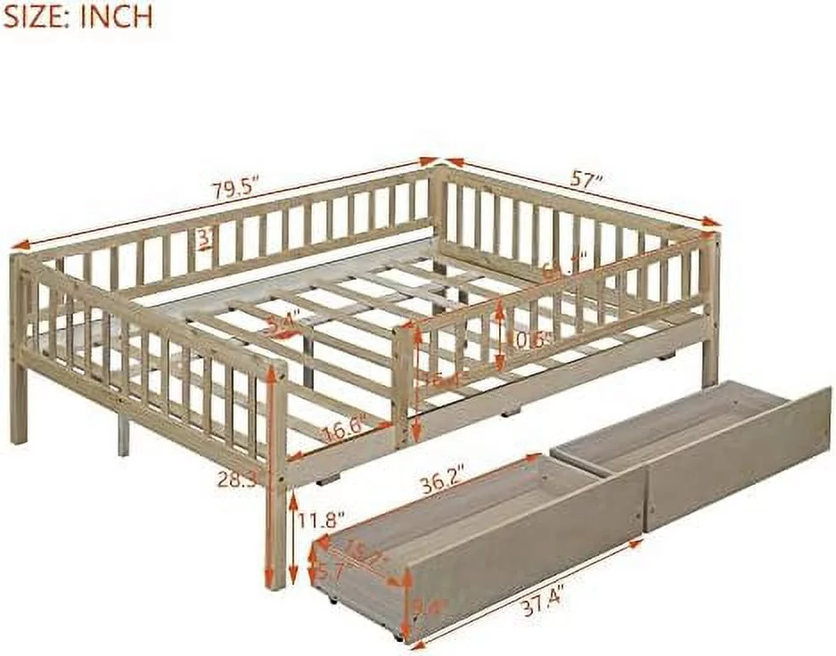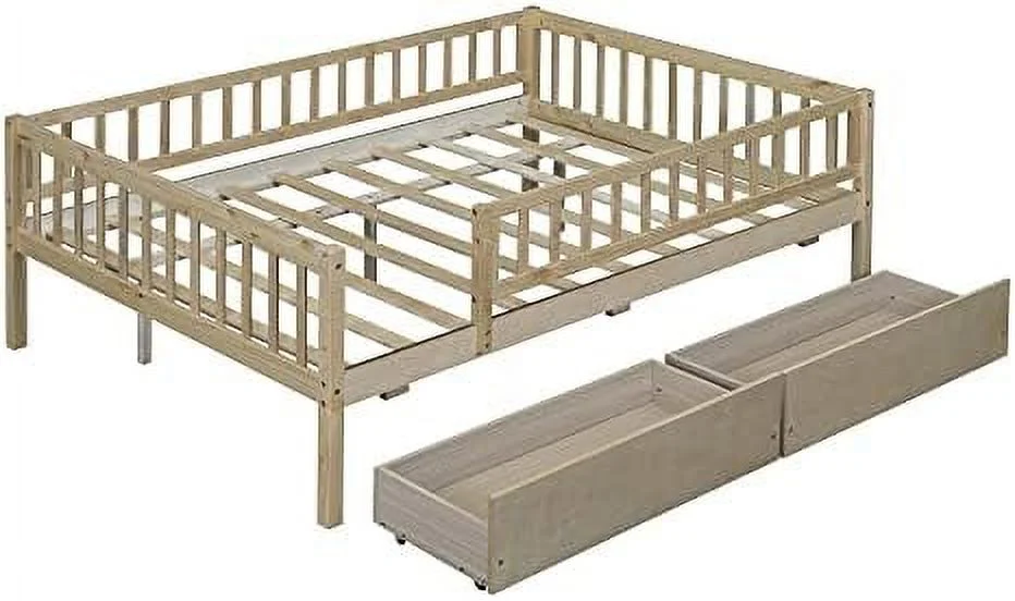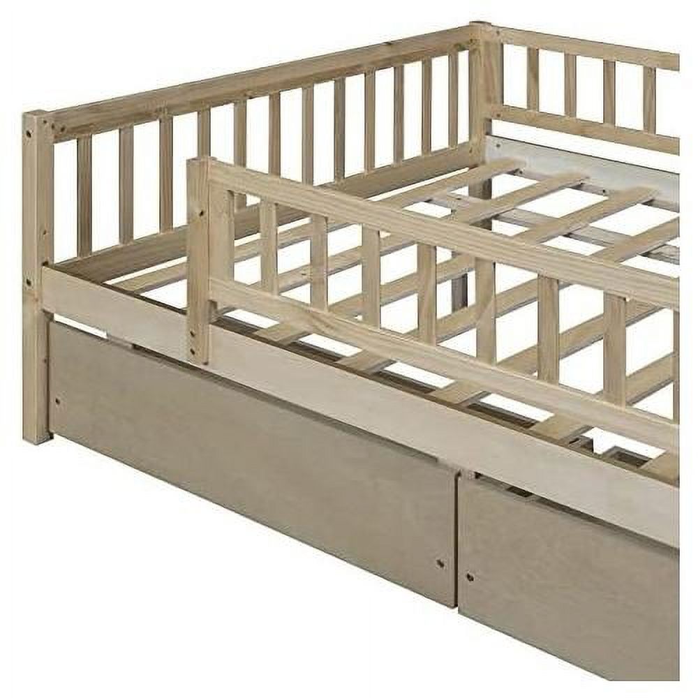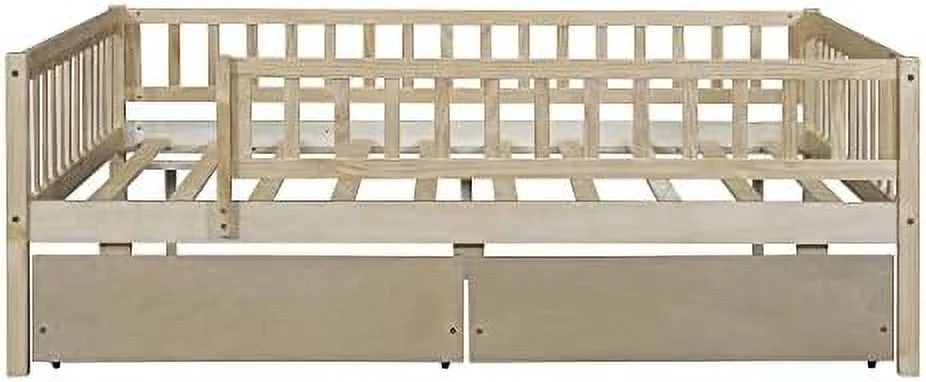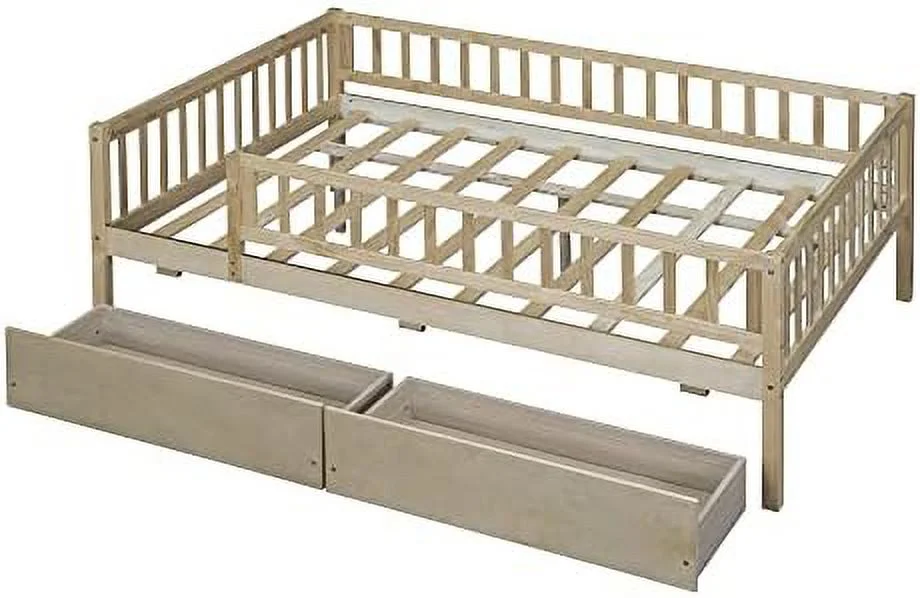 Full Size Daybed With Drawers, Wood Full Bed Frame, No Box Spring Needed, Natural