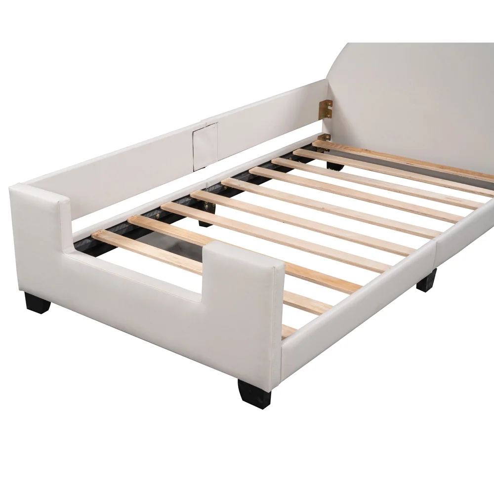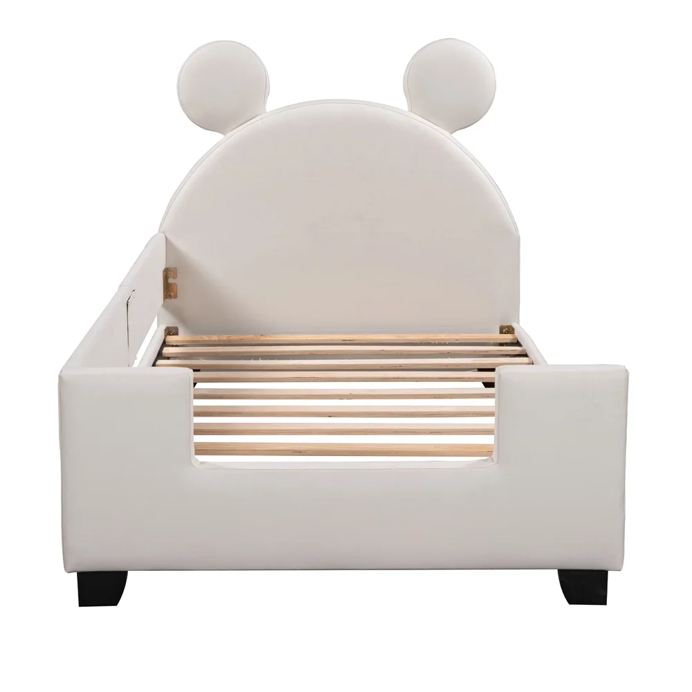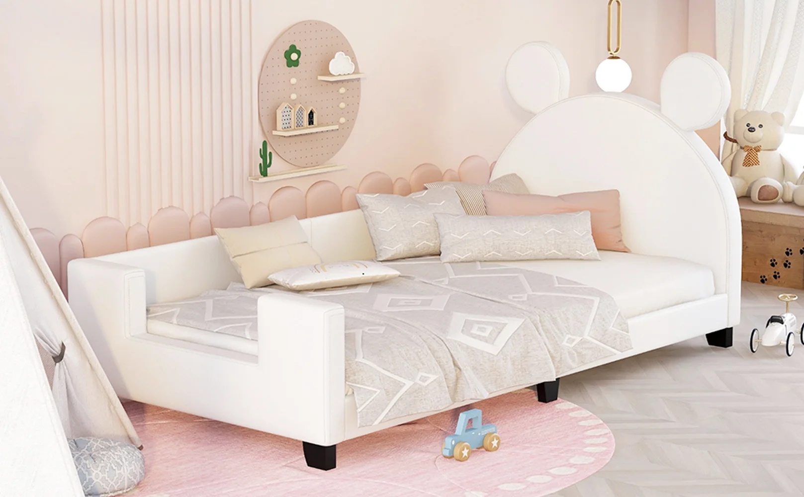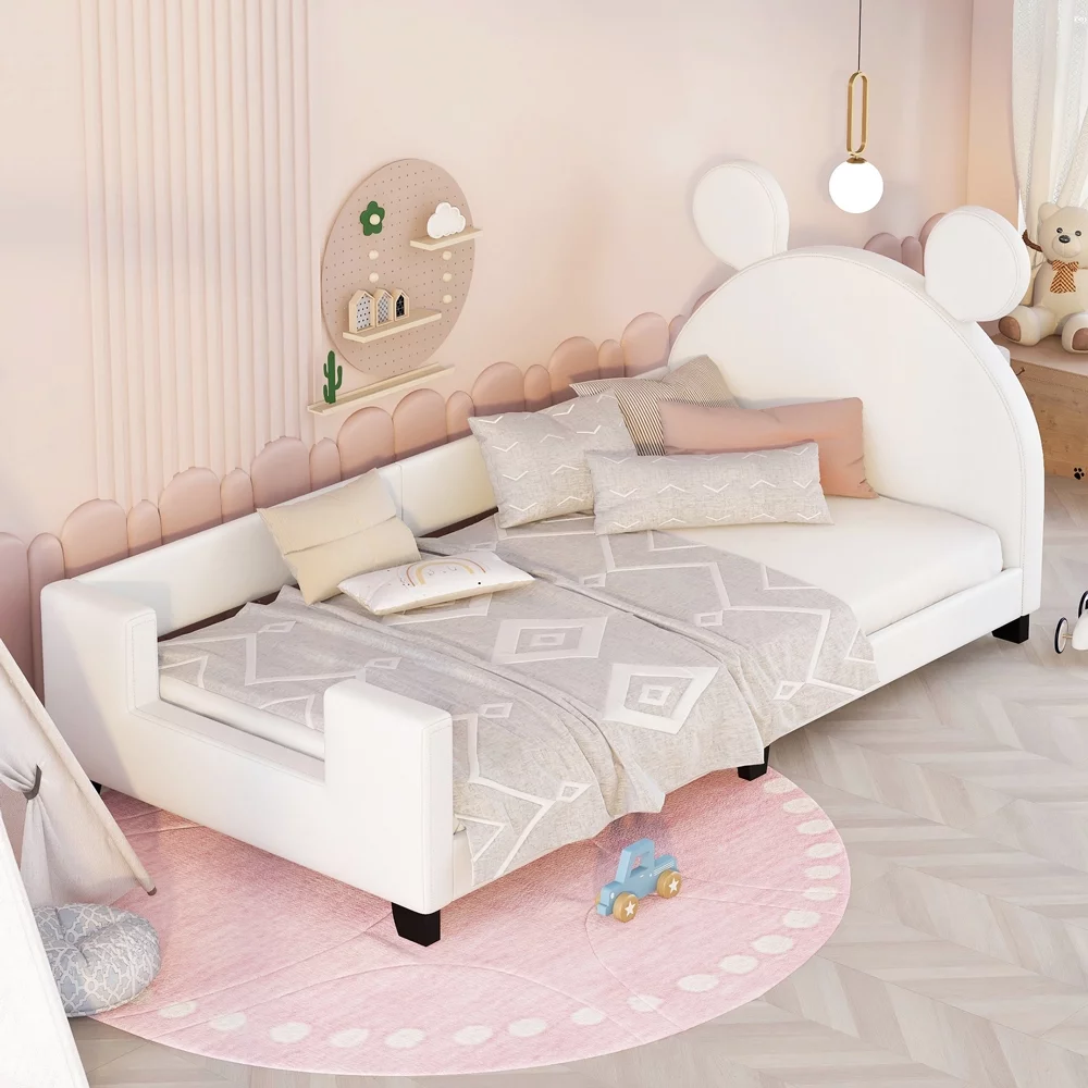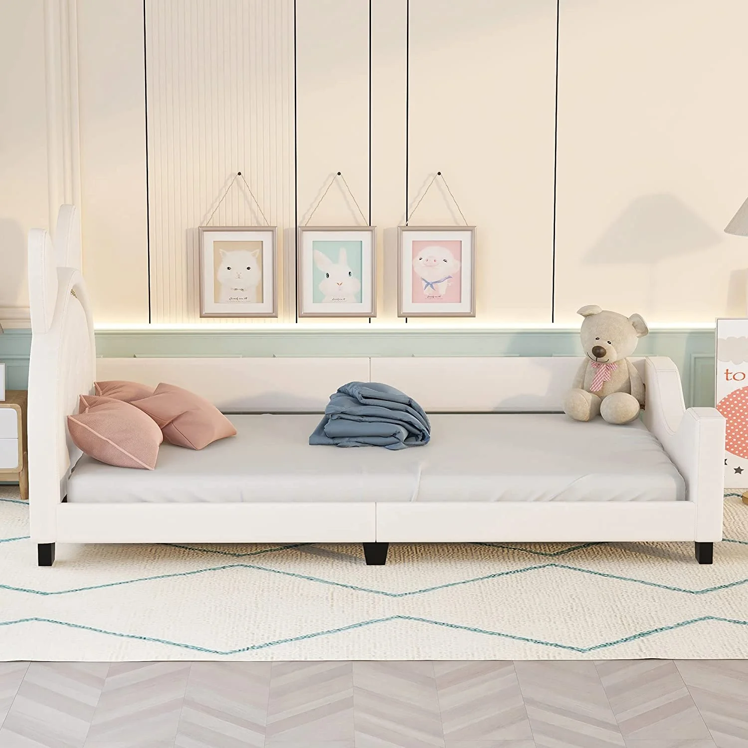 Twin Size Upholstered Daybed with Carton Ears Shaped Headboard for Kids Boys Girls, White