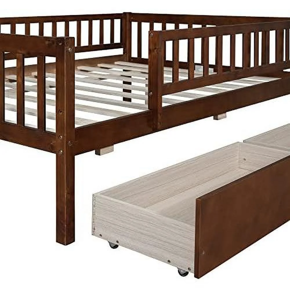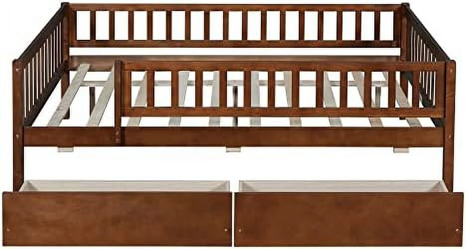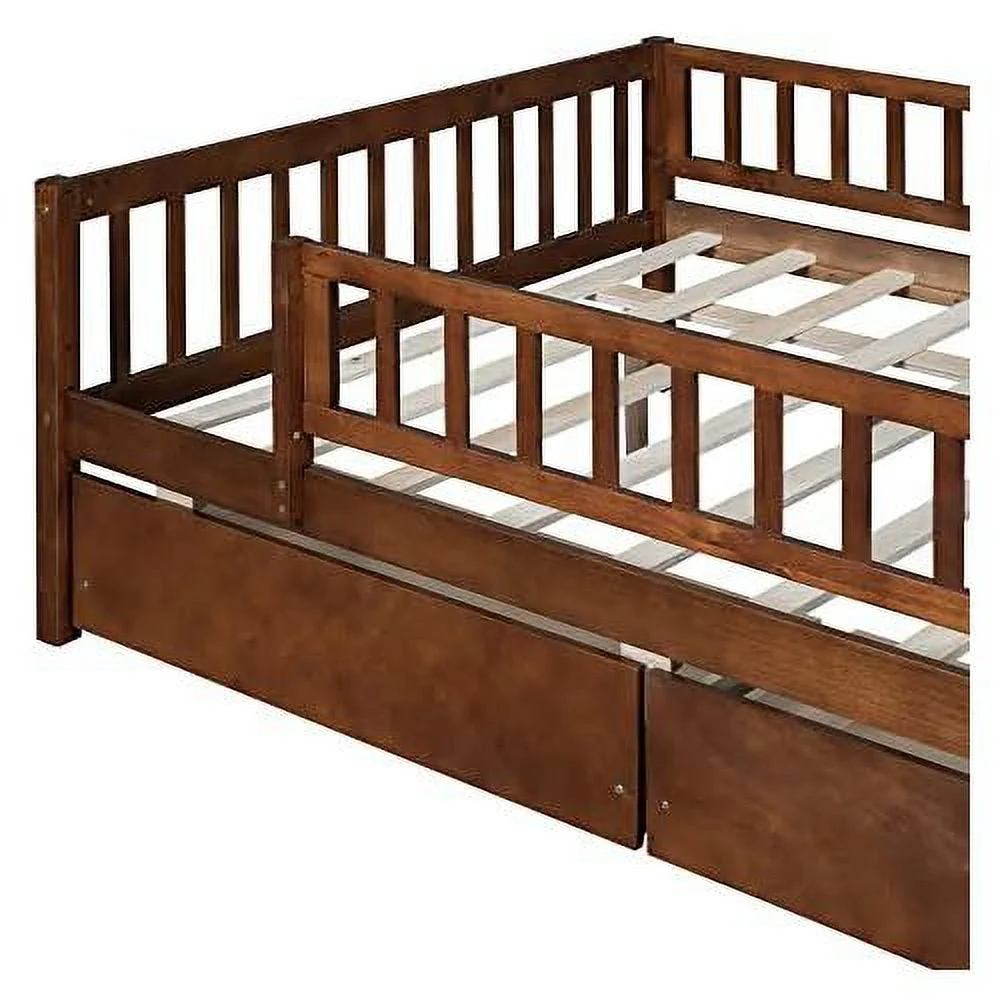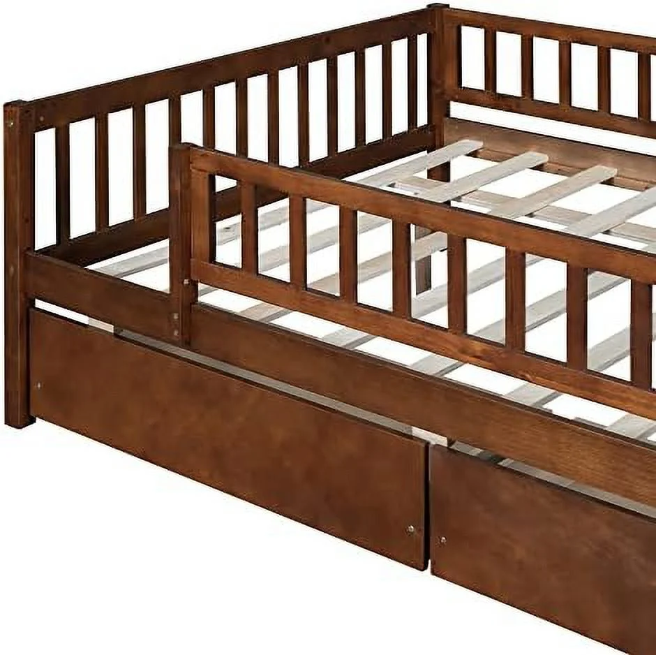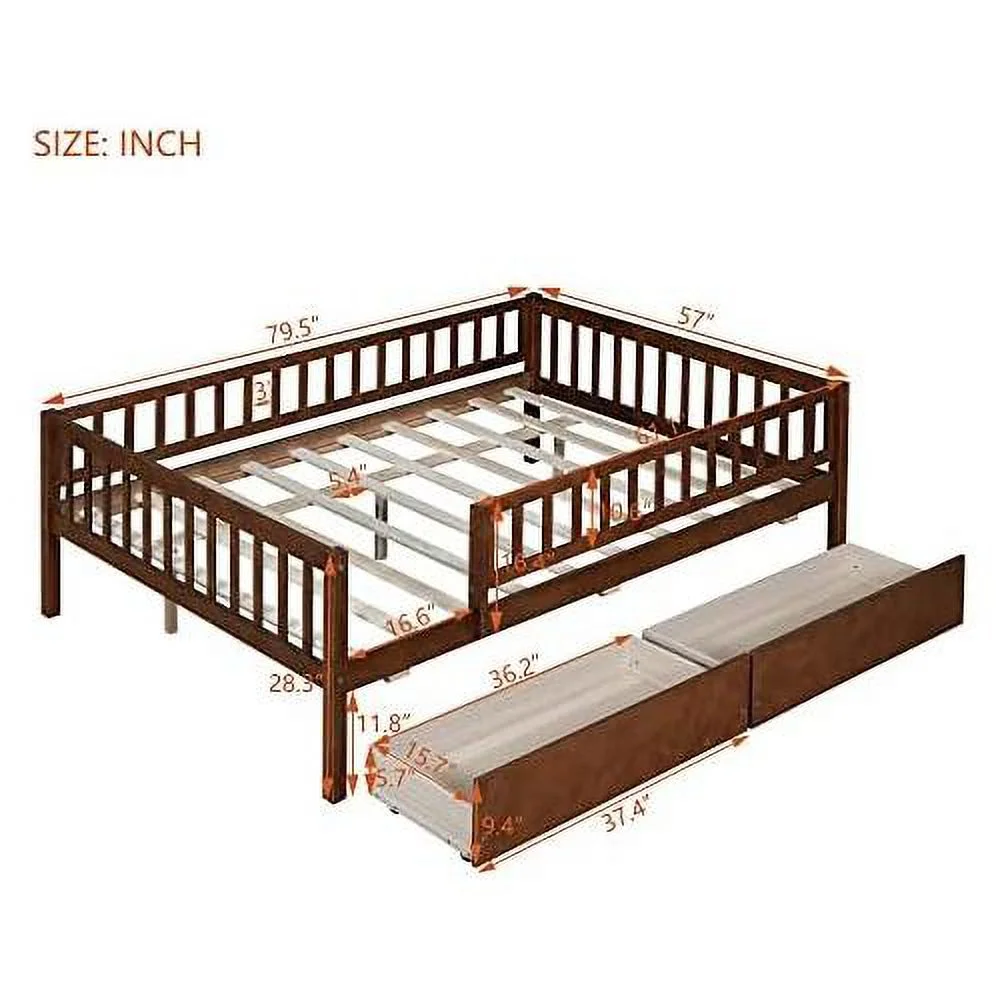 Full Size Daybed With Drawers, Wood Full Bed Frame, No Box Spring Needed, Walnut