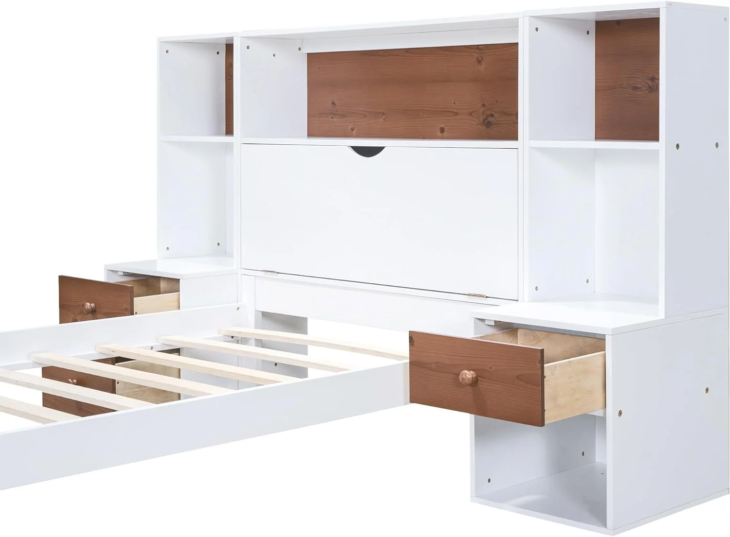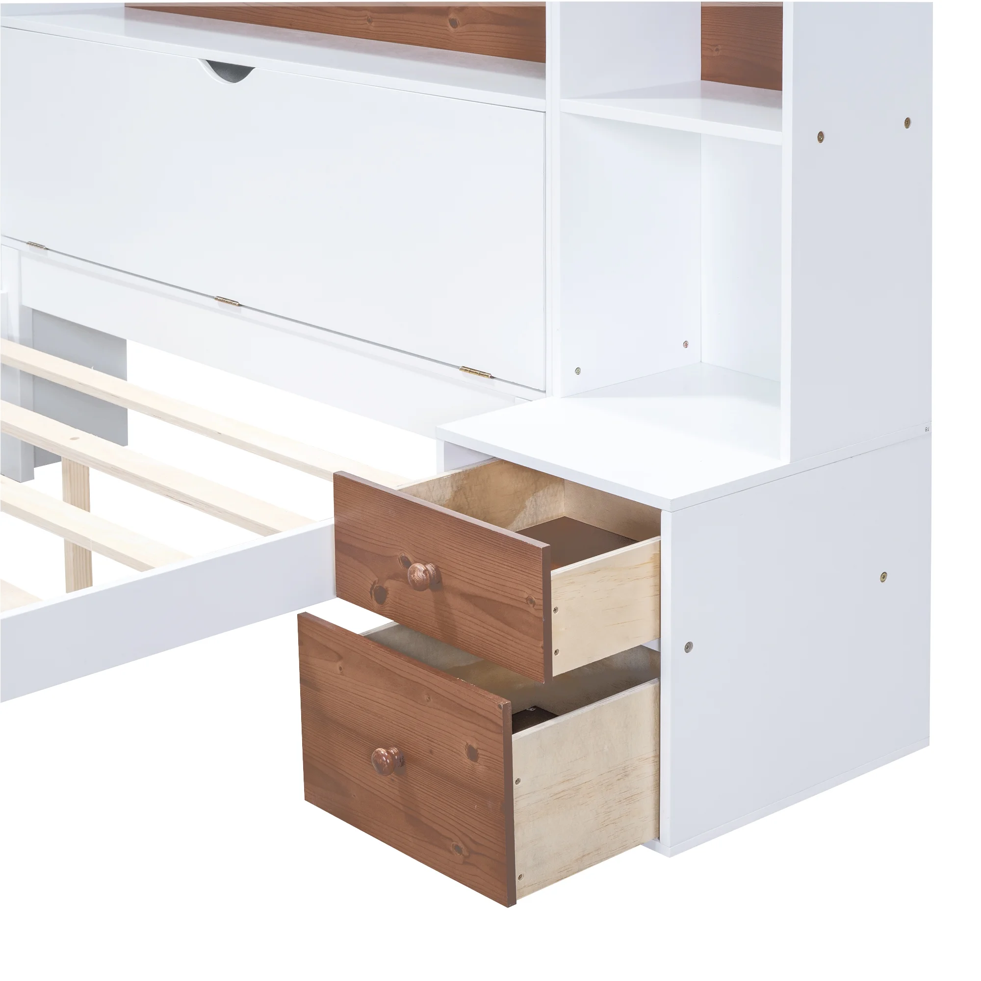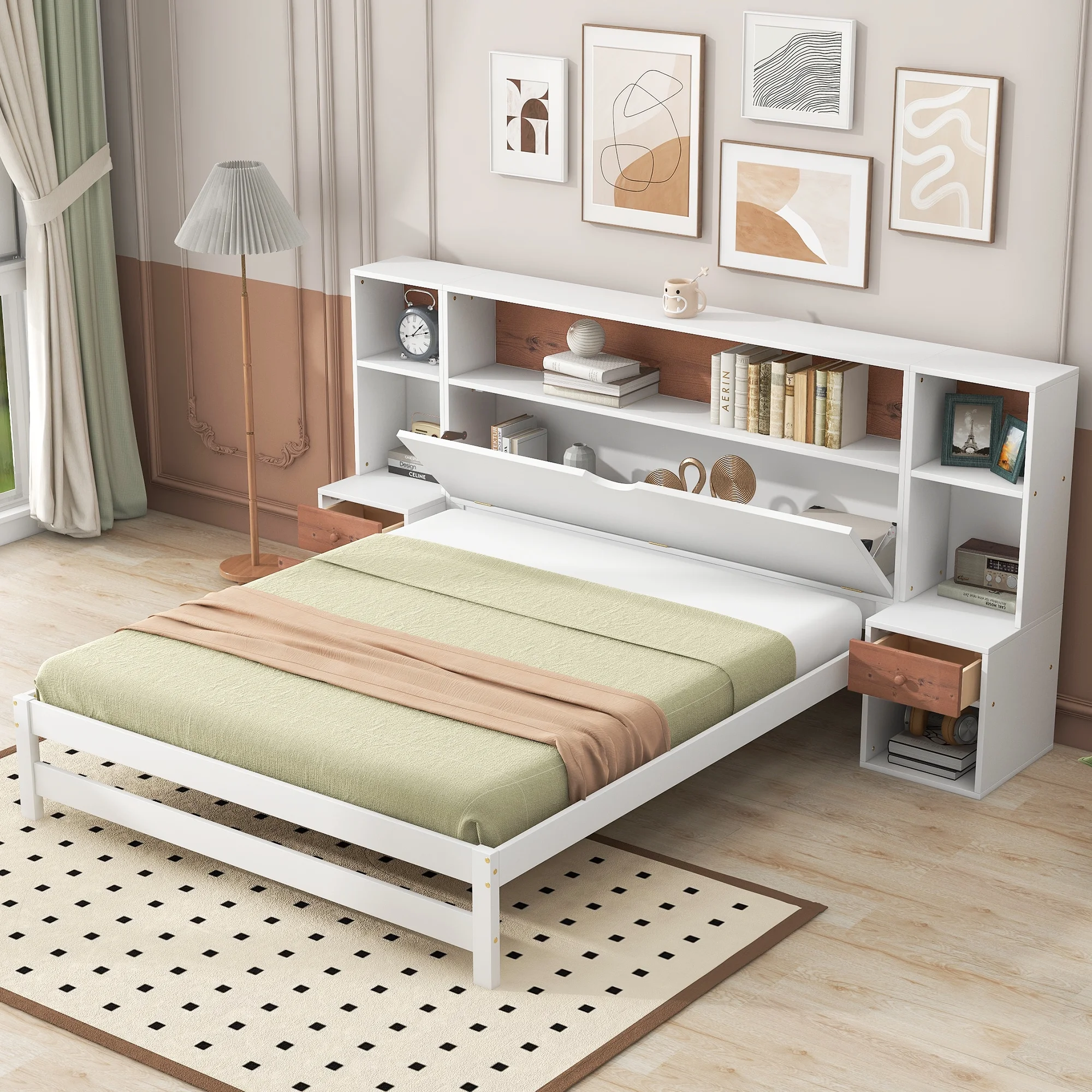 Size Platform Bed With Storage Headboard Ad Drawers, Bookcase Bed For Bedroom,Livig Room,White