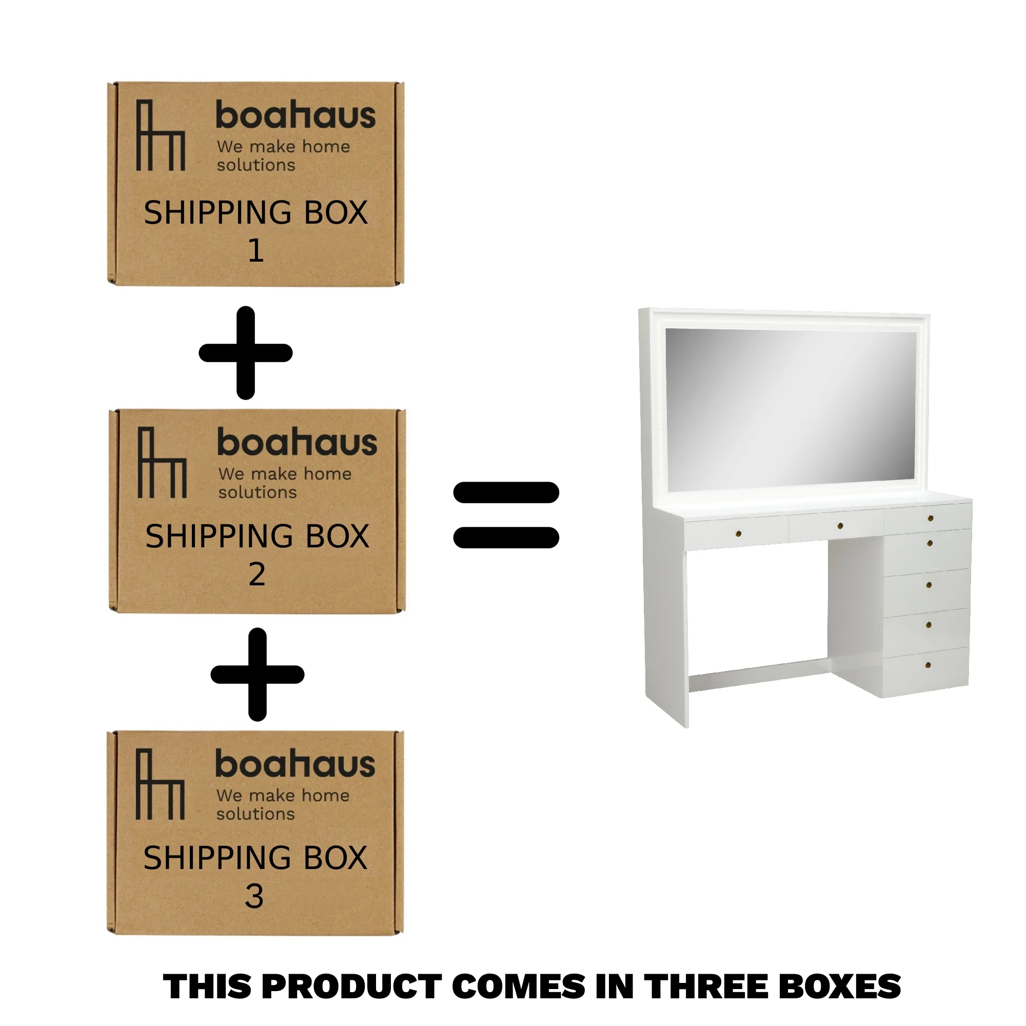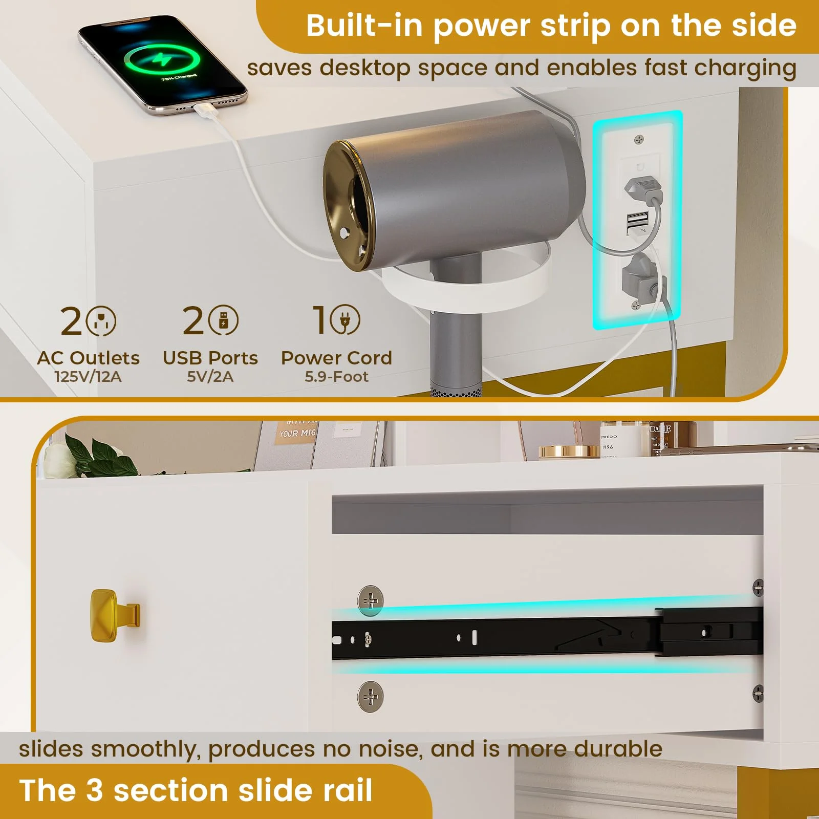 Boahaus Modern White Makeup Vanity Table with LED Lights, Golden Knobs, for Bedroom