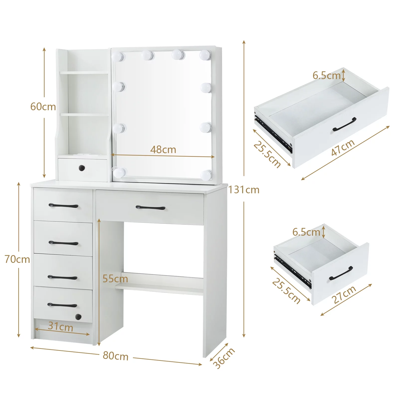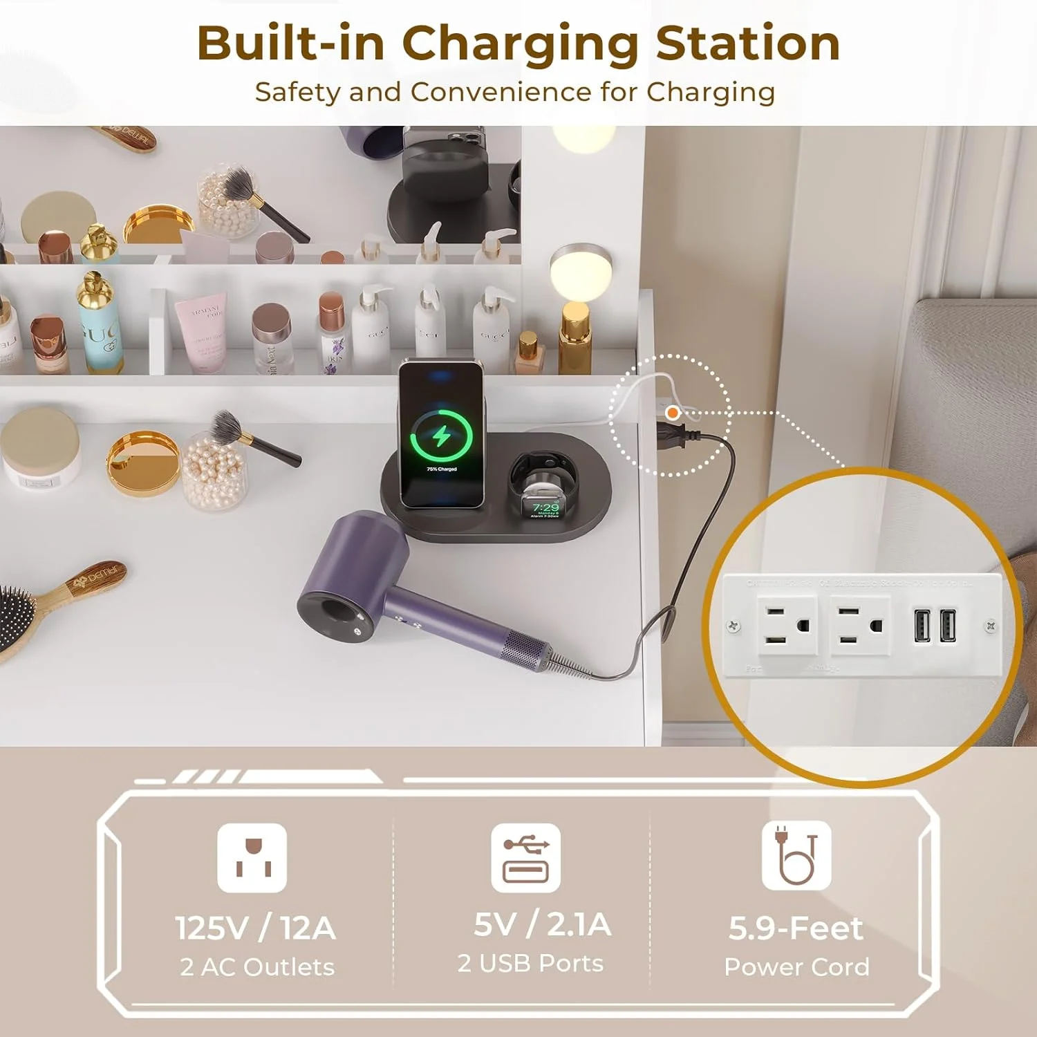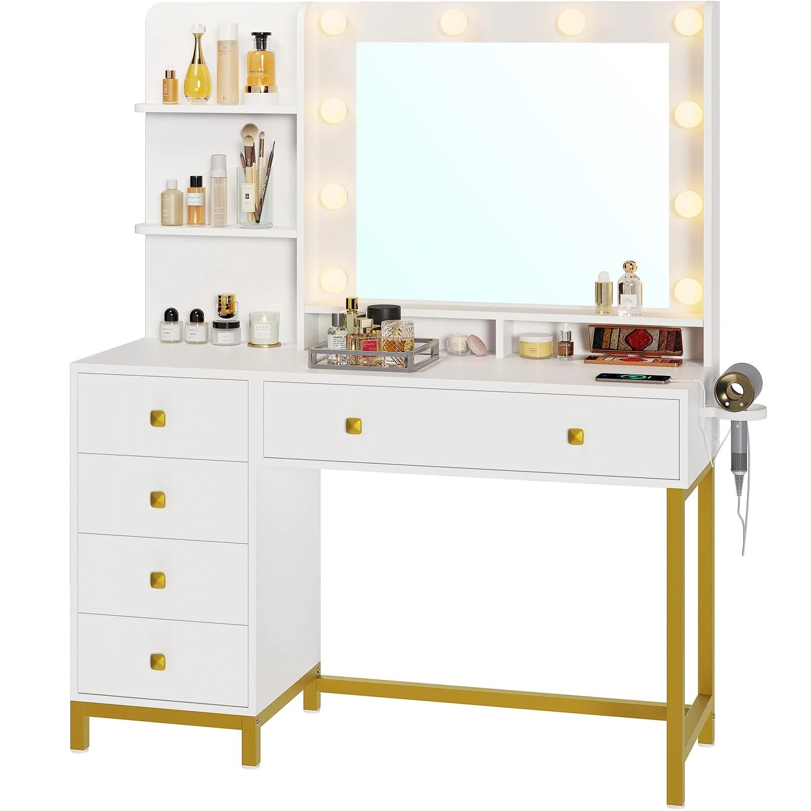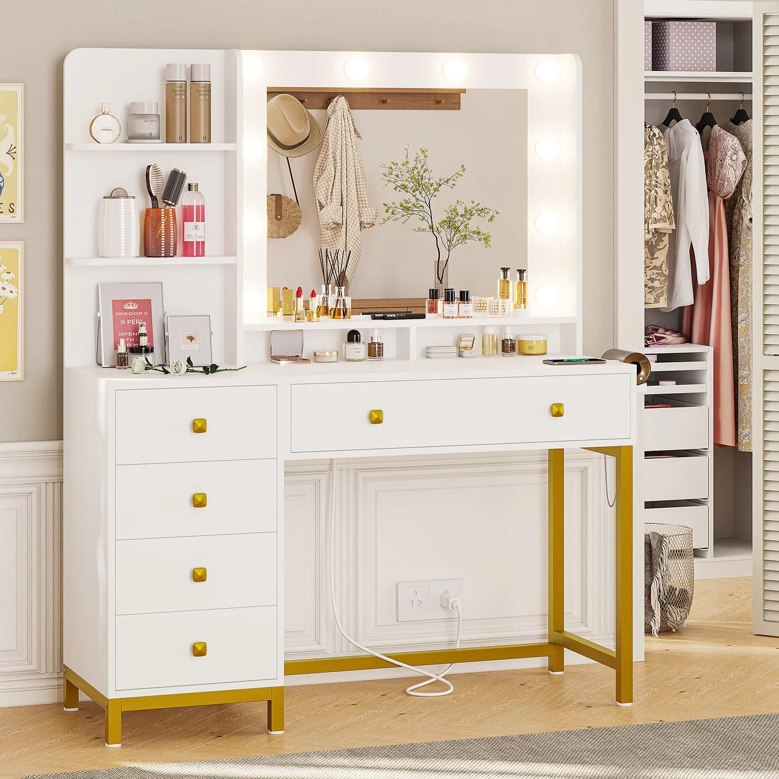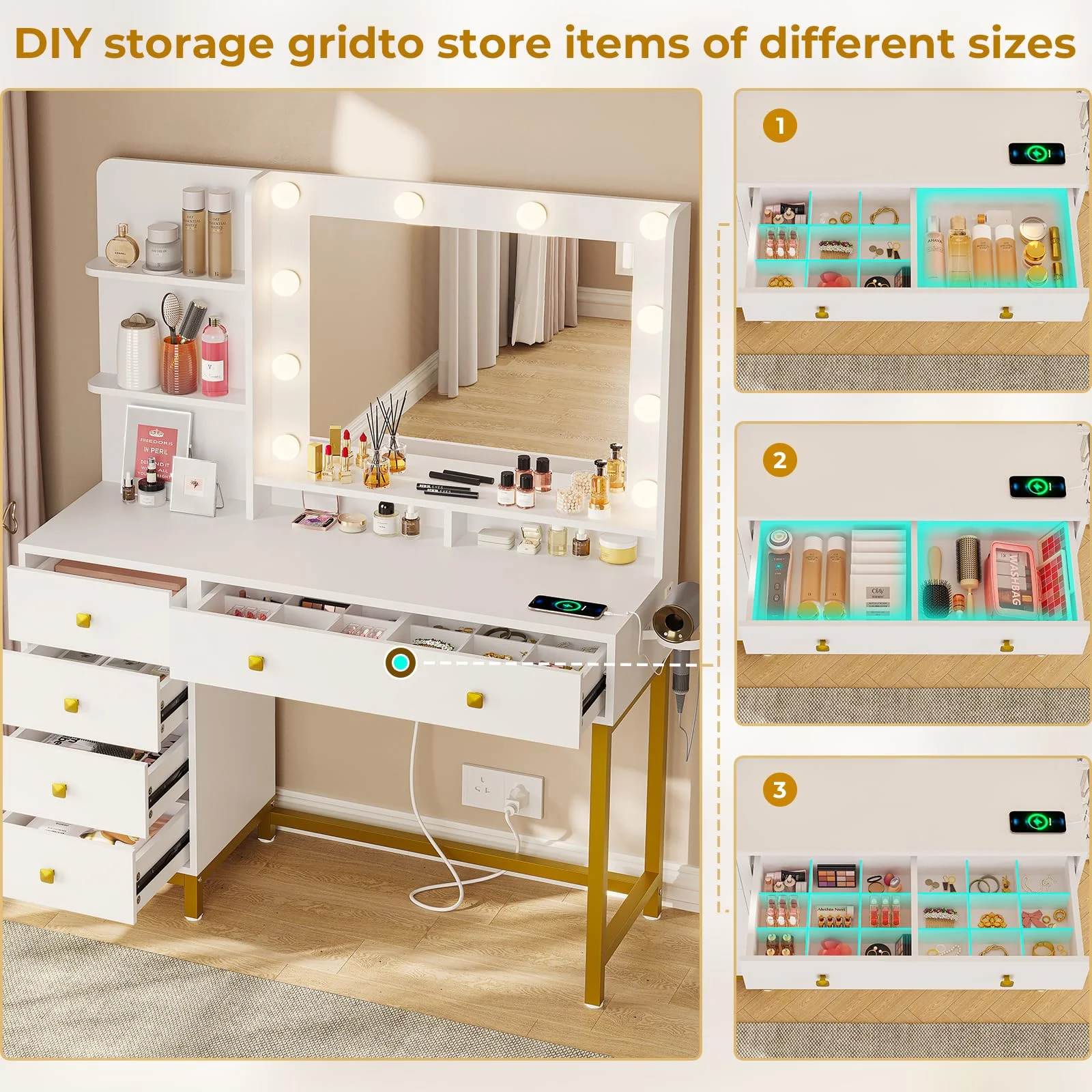 Afuhokles Vanity Desk with Lighted Mirror and Charging Station, Makeup Vanity Table with 5 Drawers, Visual Drawer, White