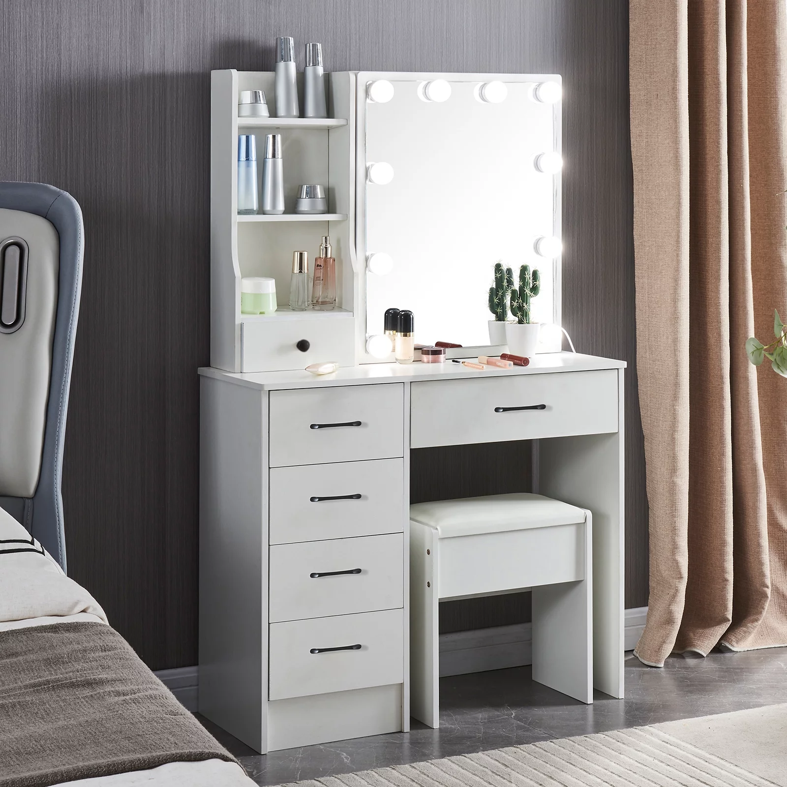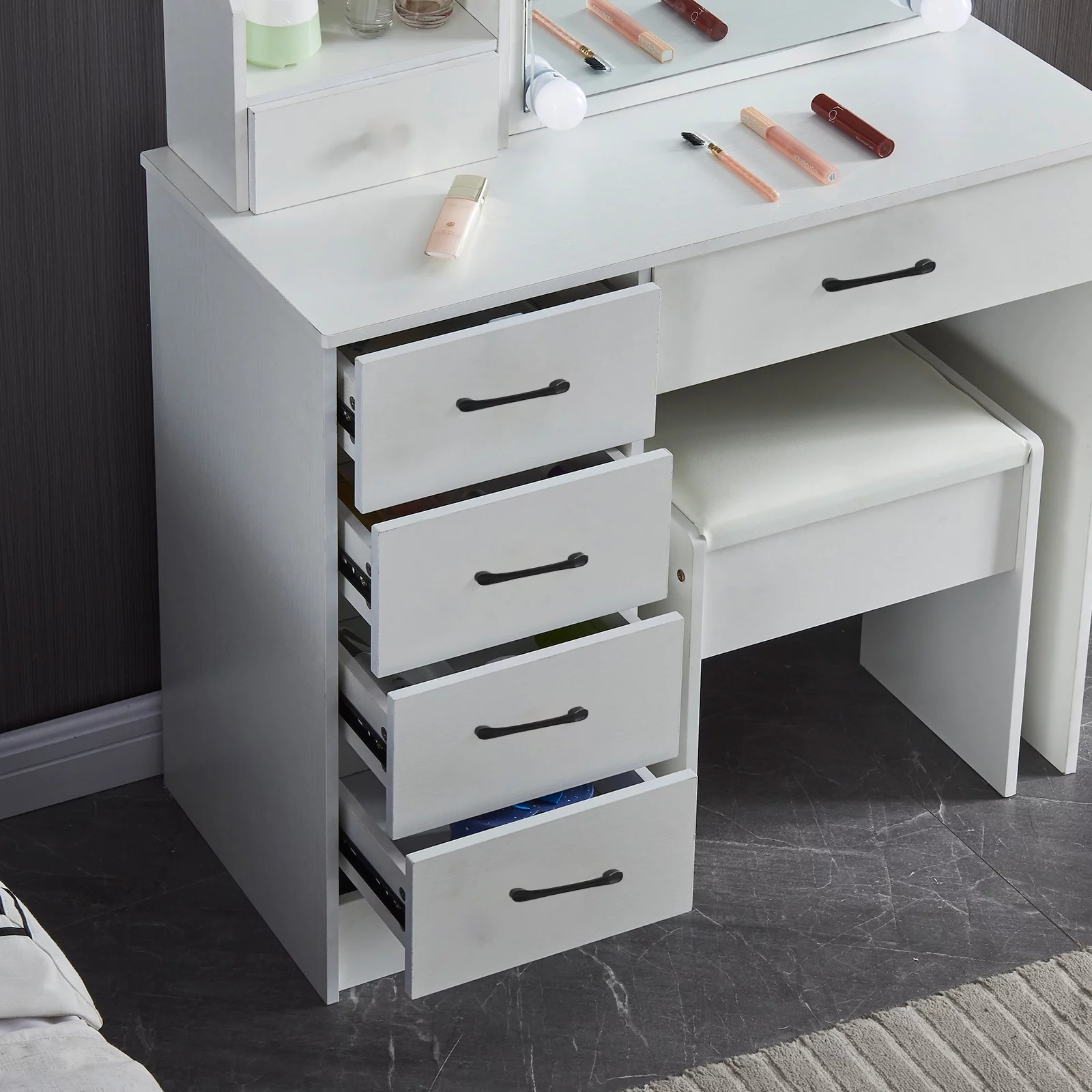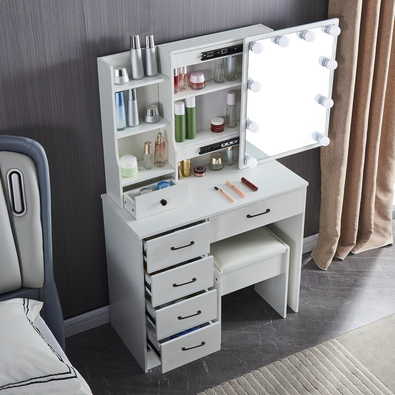 Modern Vanity Table w/ 10LED Lighted Sliding Mirror, Drawers and Cabinet and Stool, Vanity Desk for Girls, White