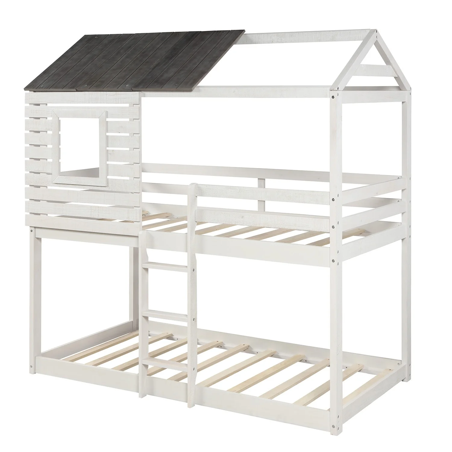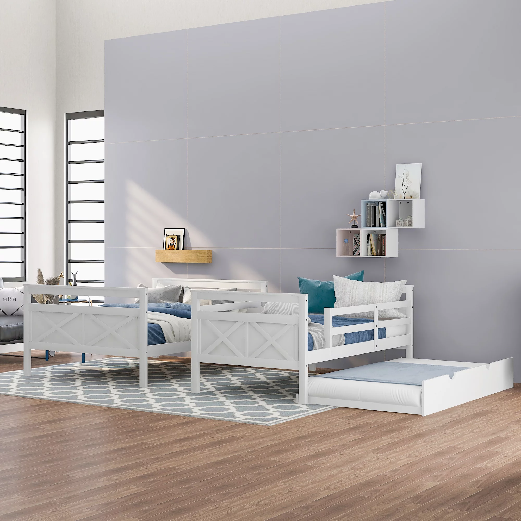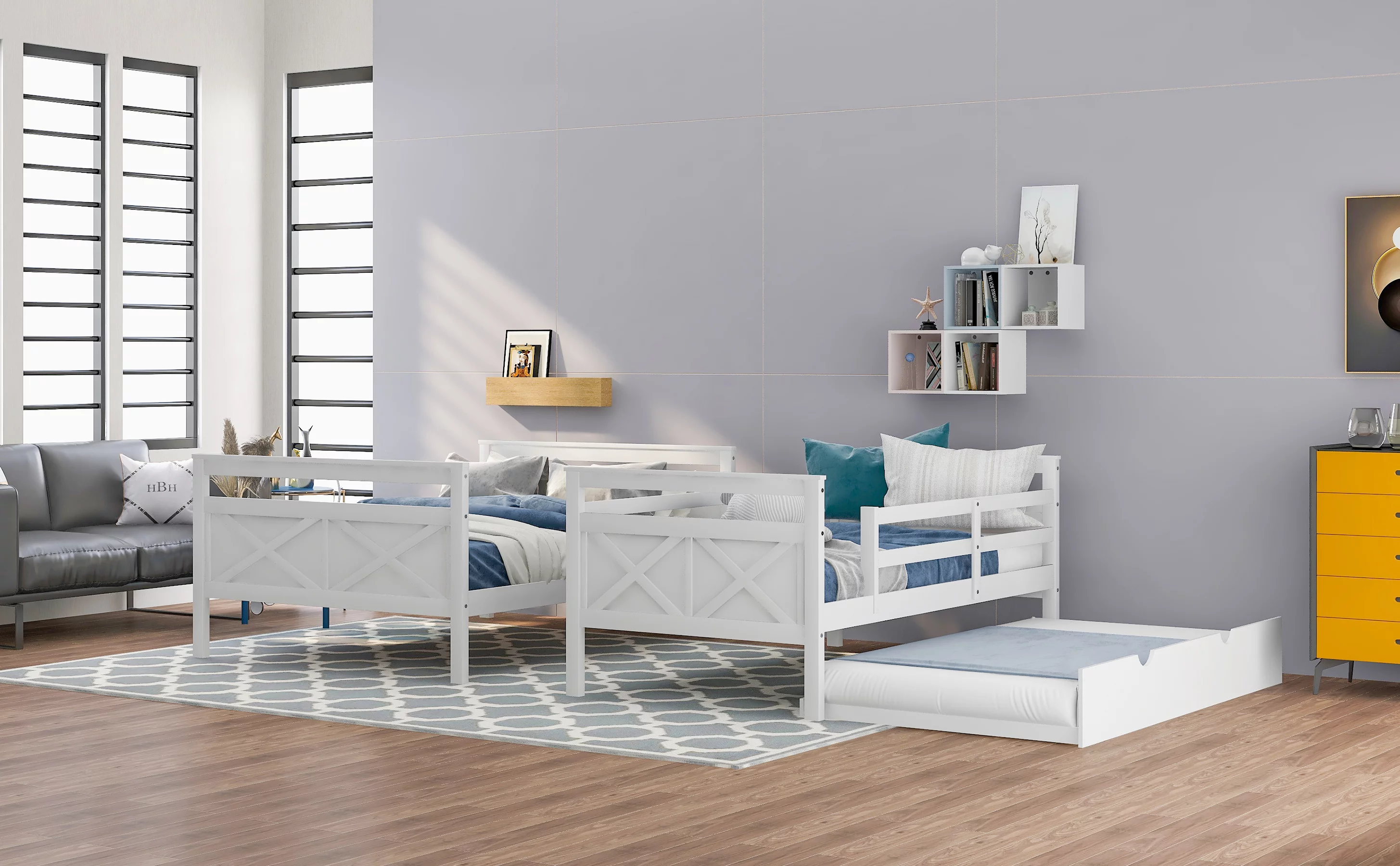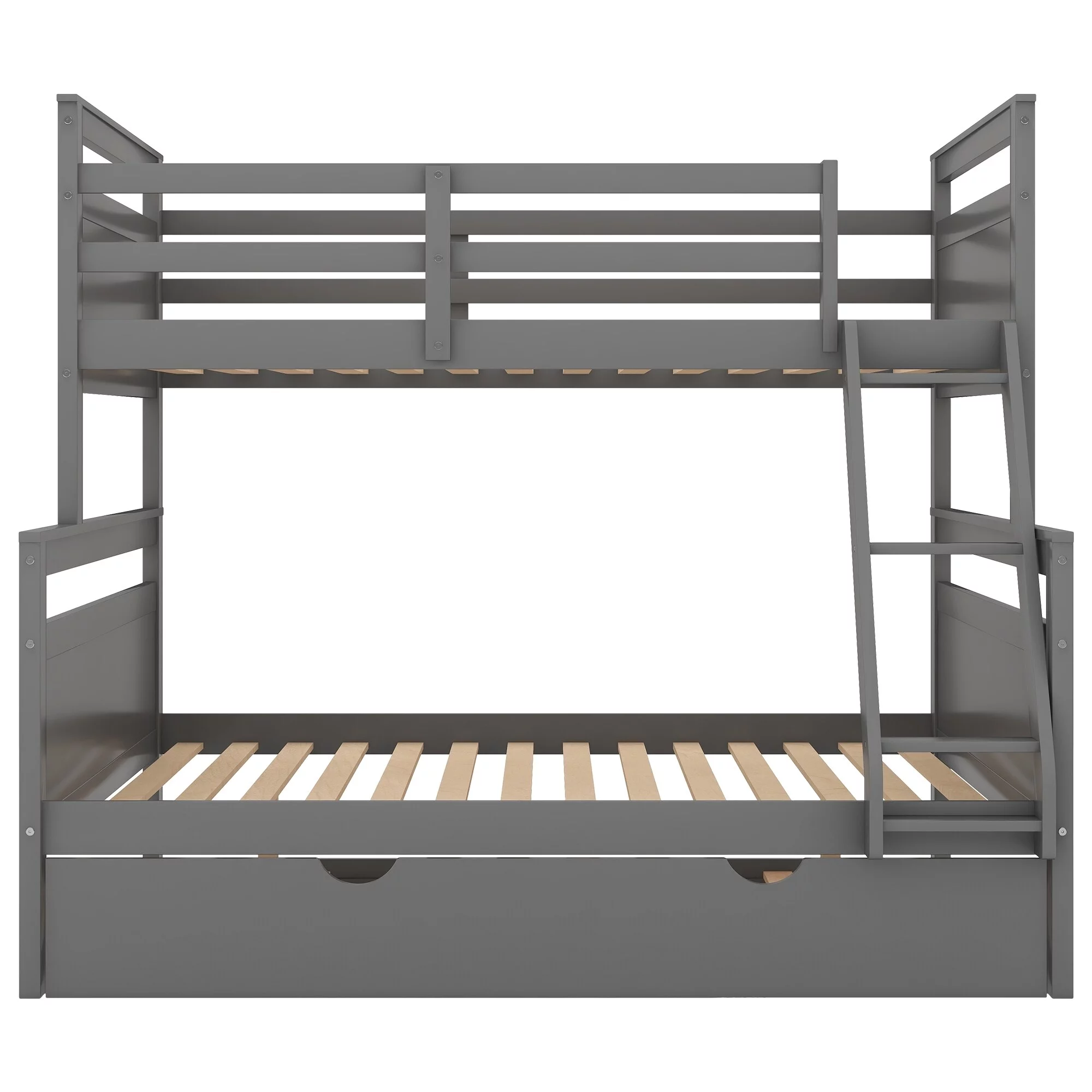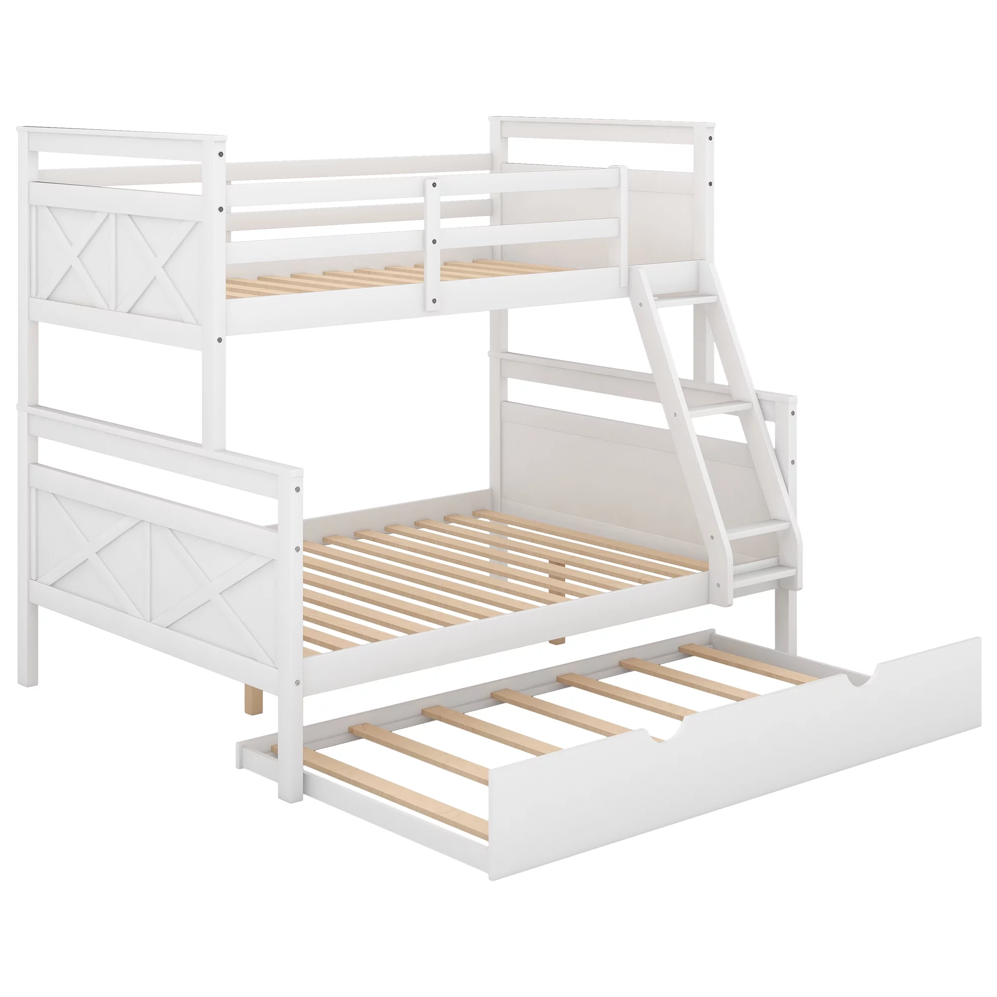Leadzm Twin over Full Bunk Bed with Ladder, Twin Size Trundle, Safety Guardrail, White