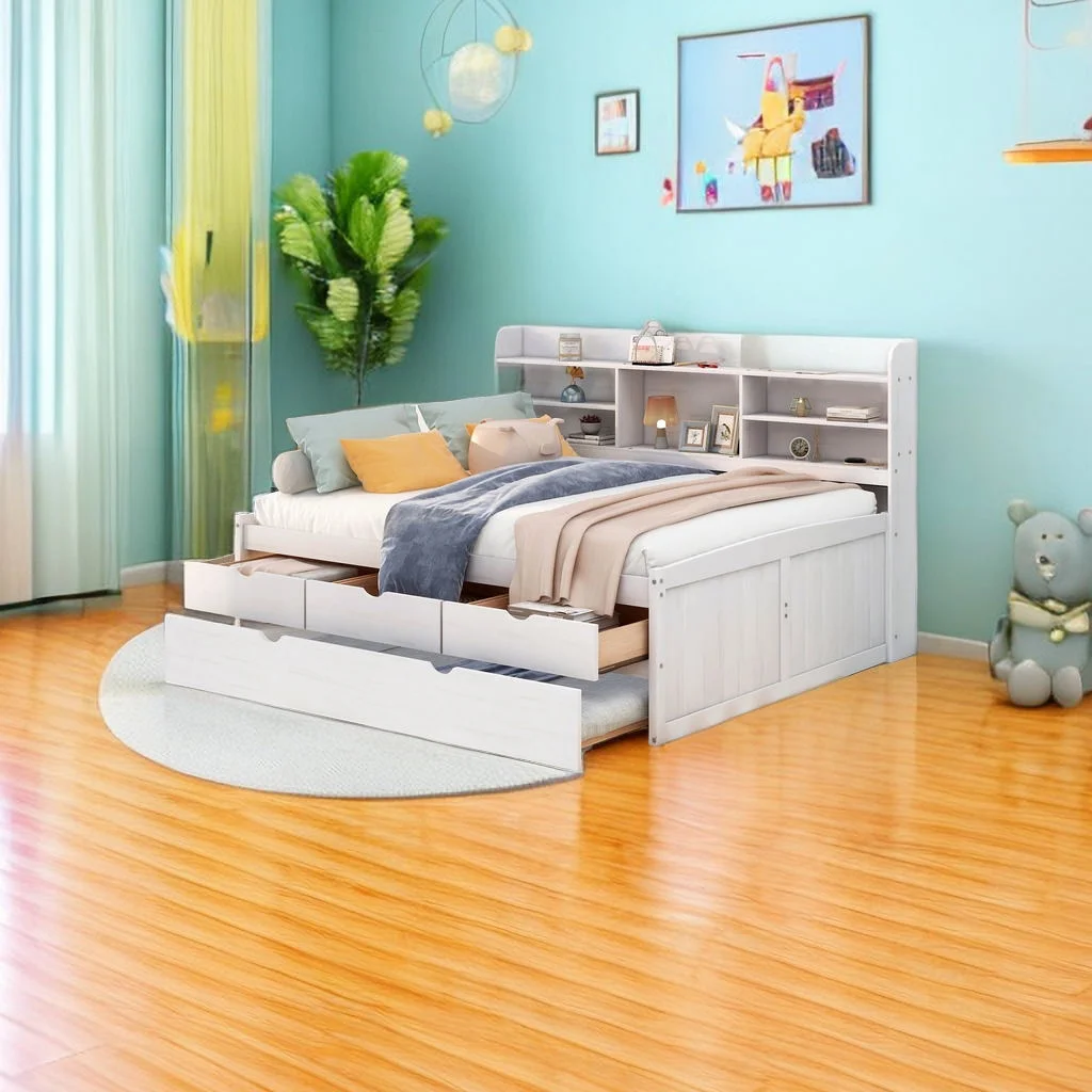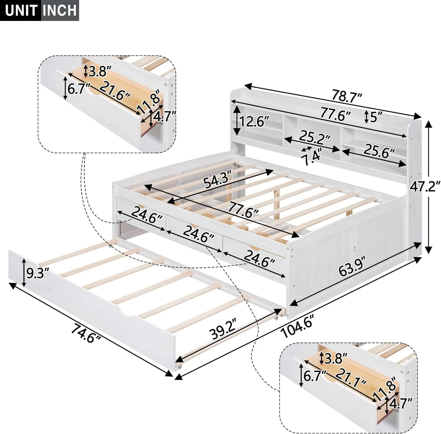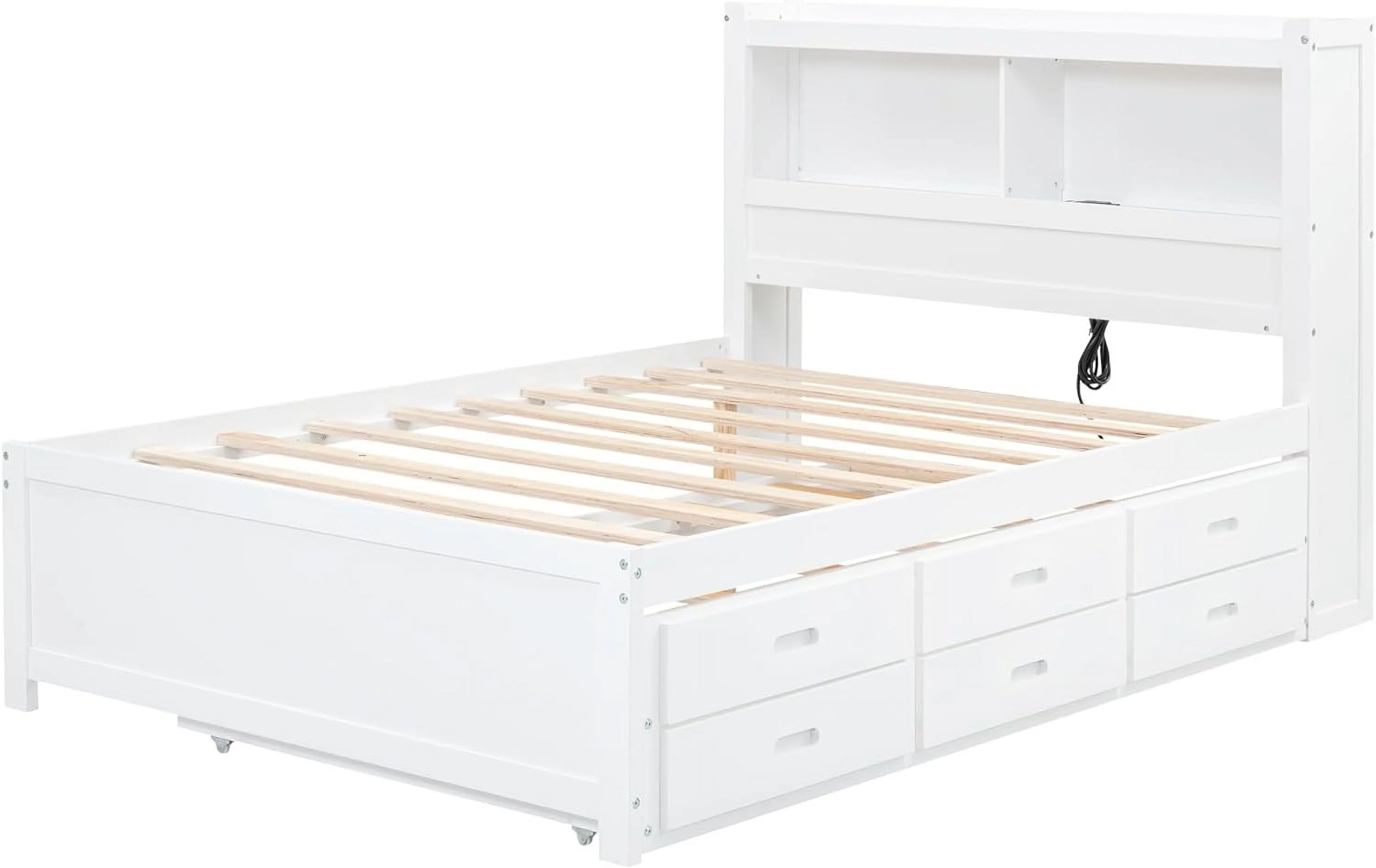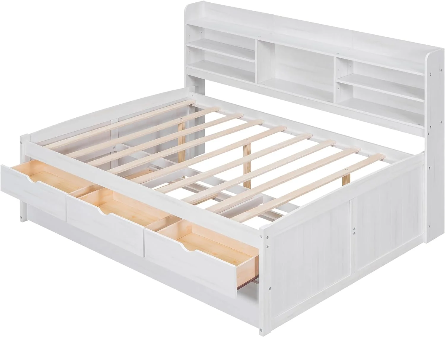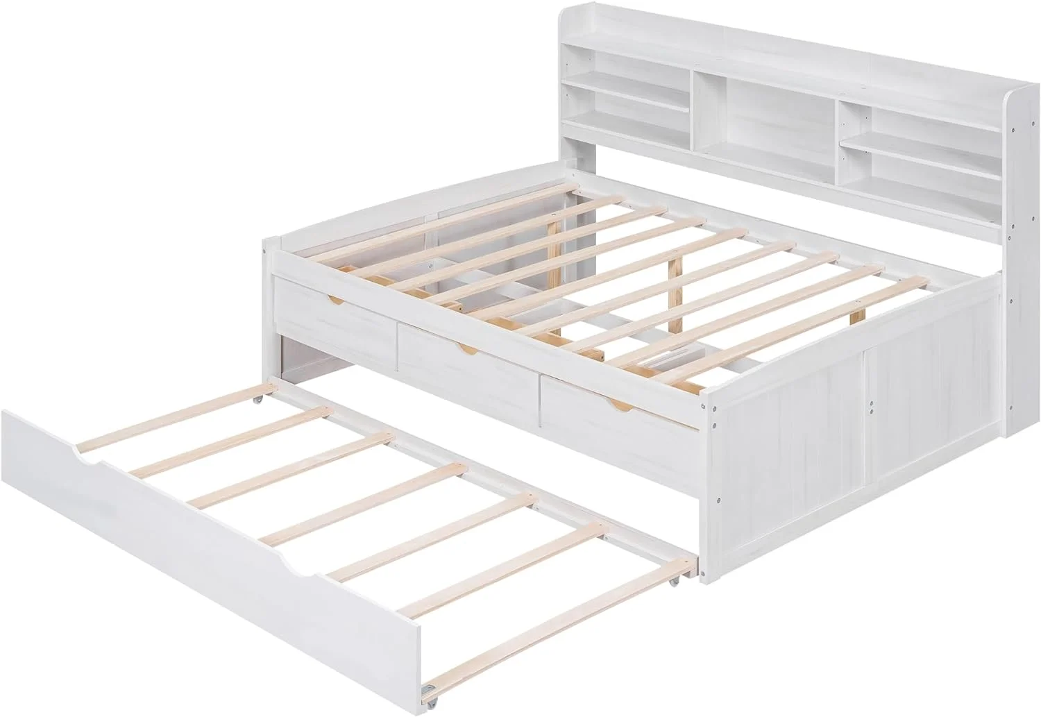 Full Size Wooden Captain Bed Built-in Bookshelves,Wood Platform Bedframe with Three Storage Drawers and Trundle
