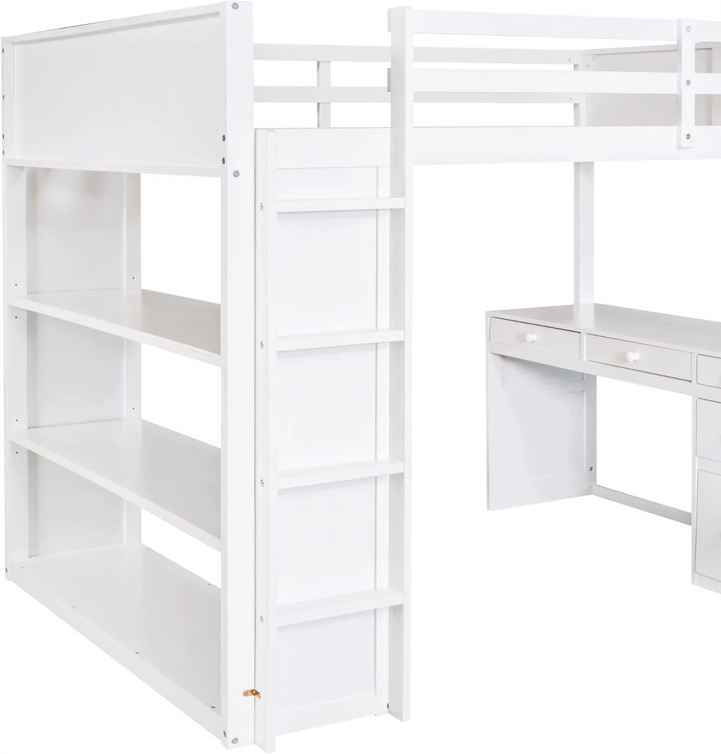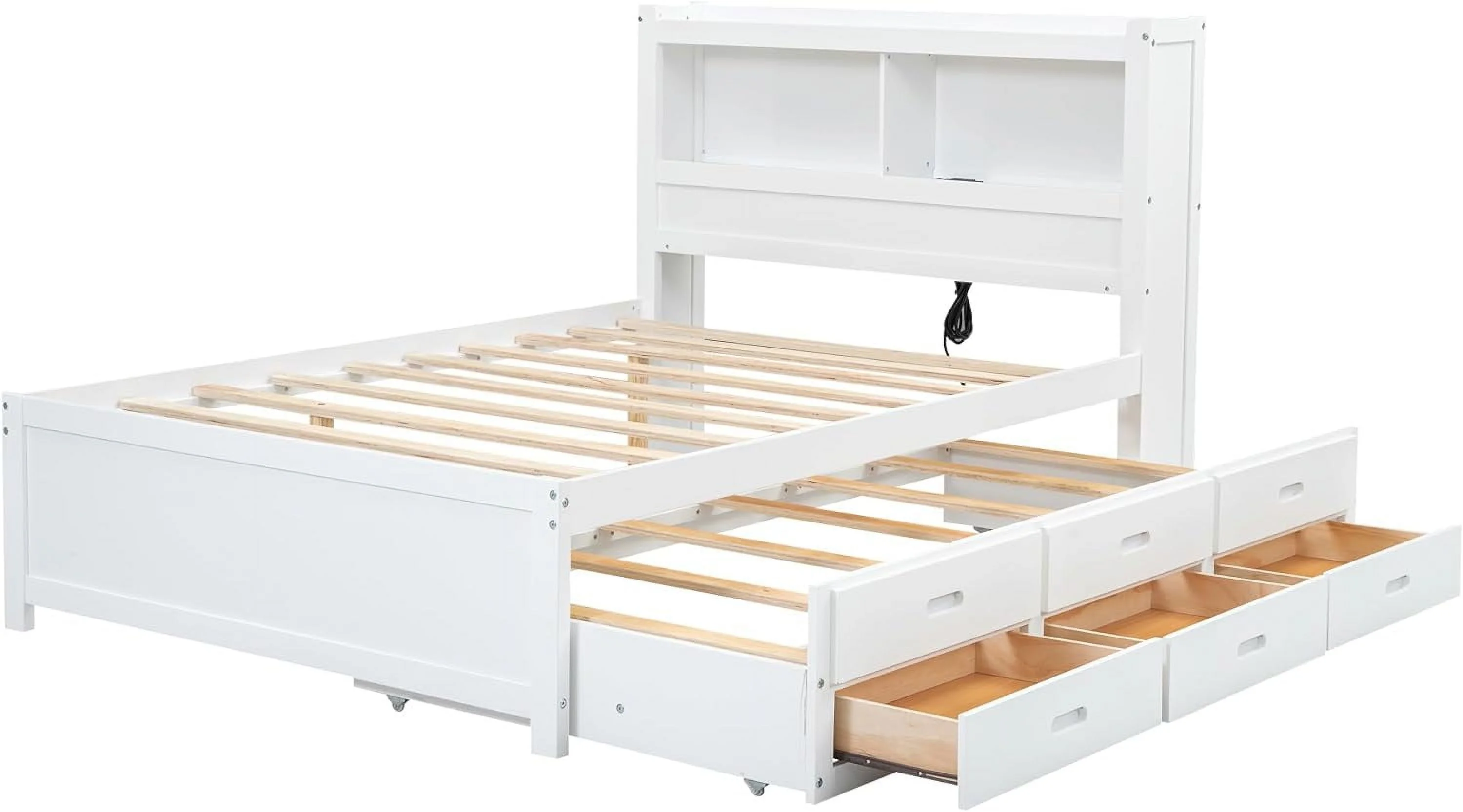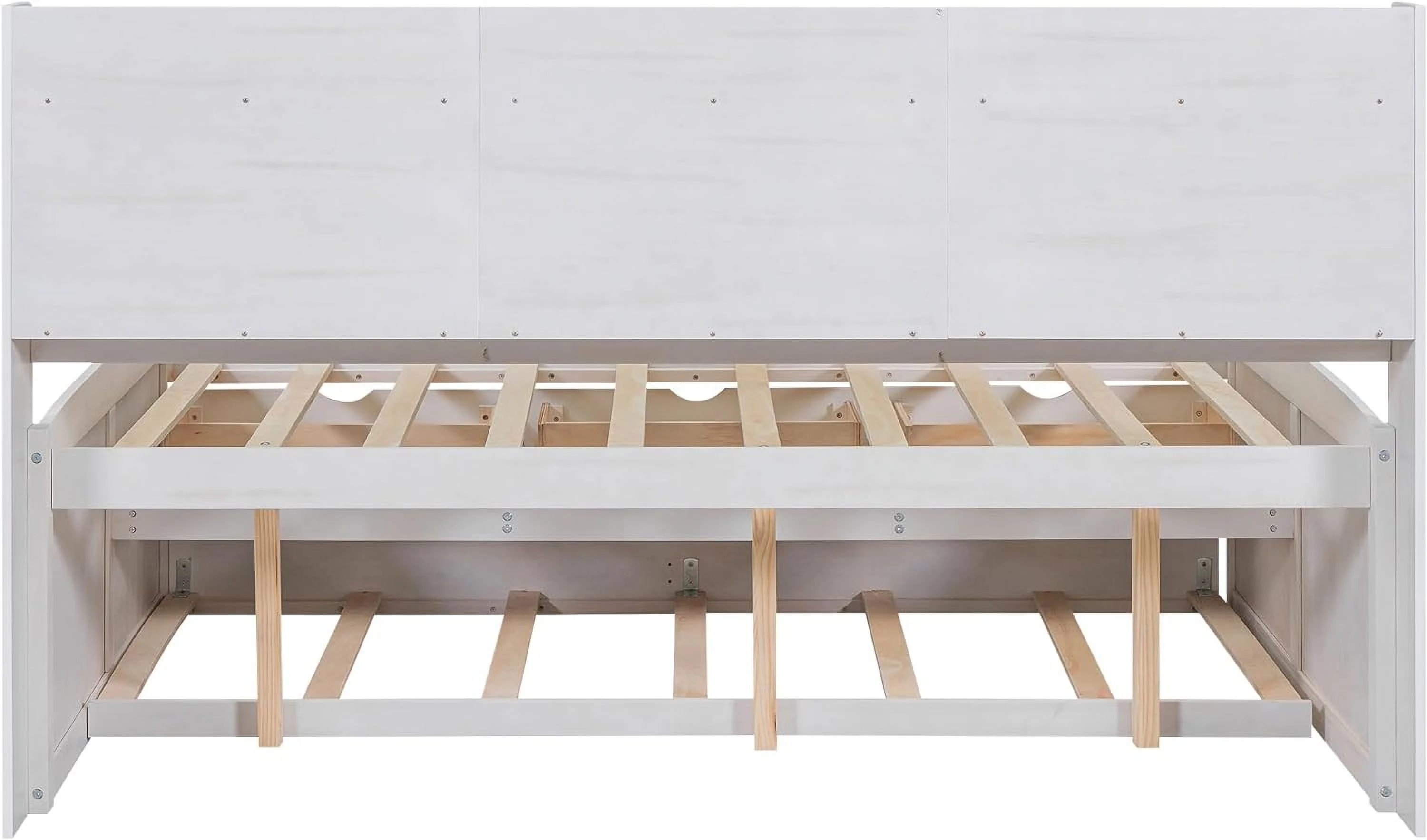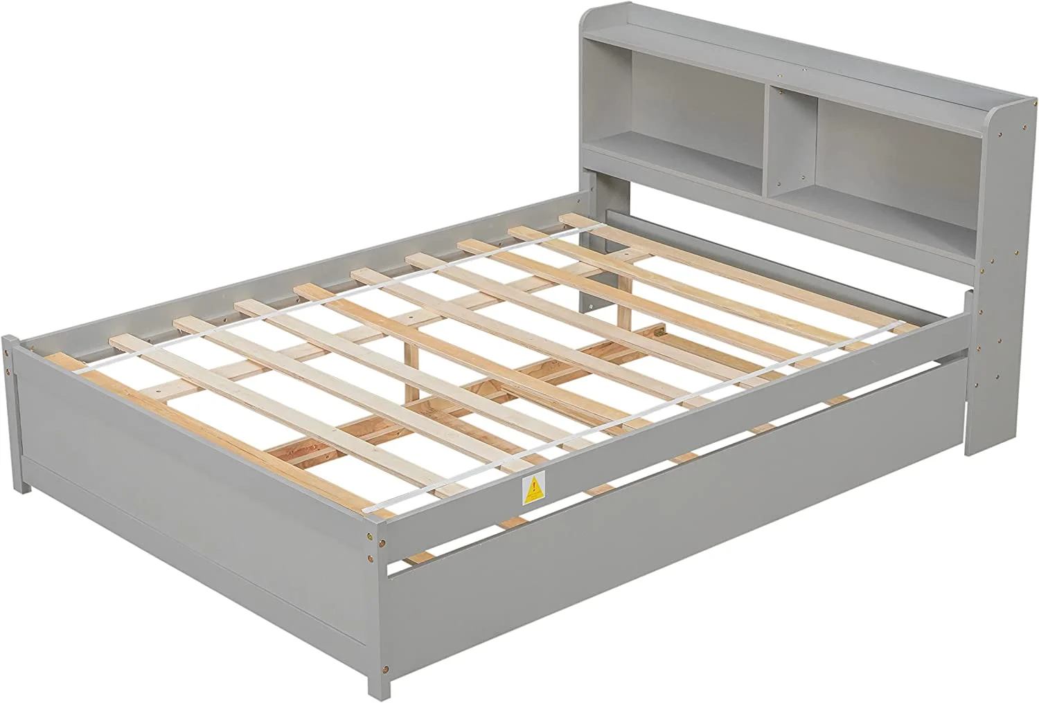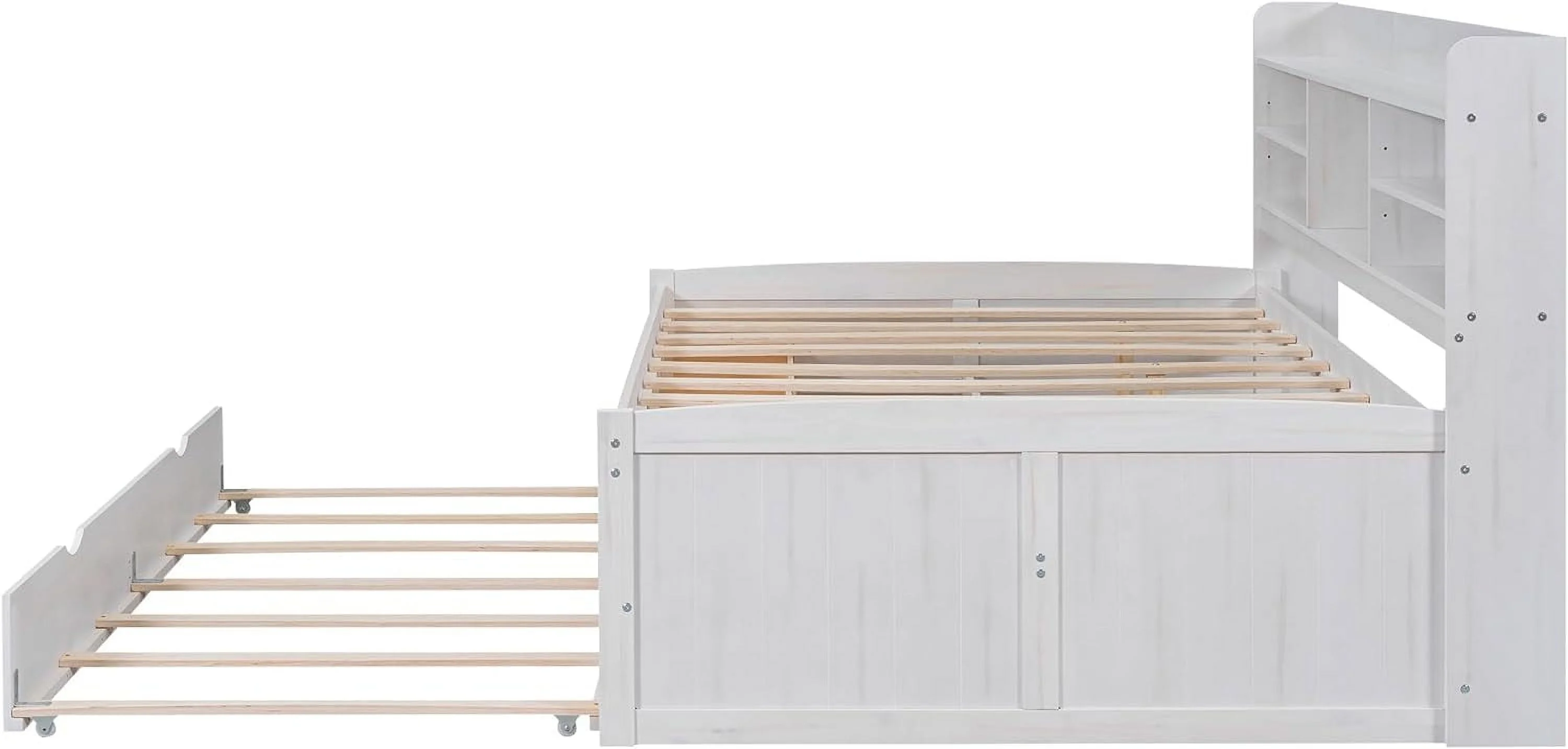 Full Size Wooden Captain Bed Built-in Bookshelves,Wood Platform Bedframe with Three Storage Drawers and Trundle
