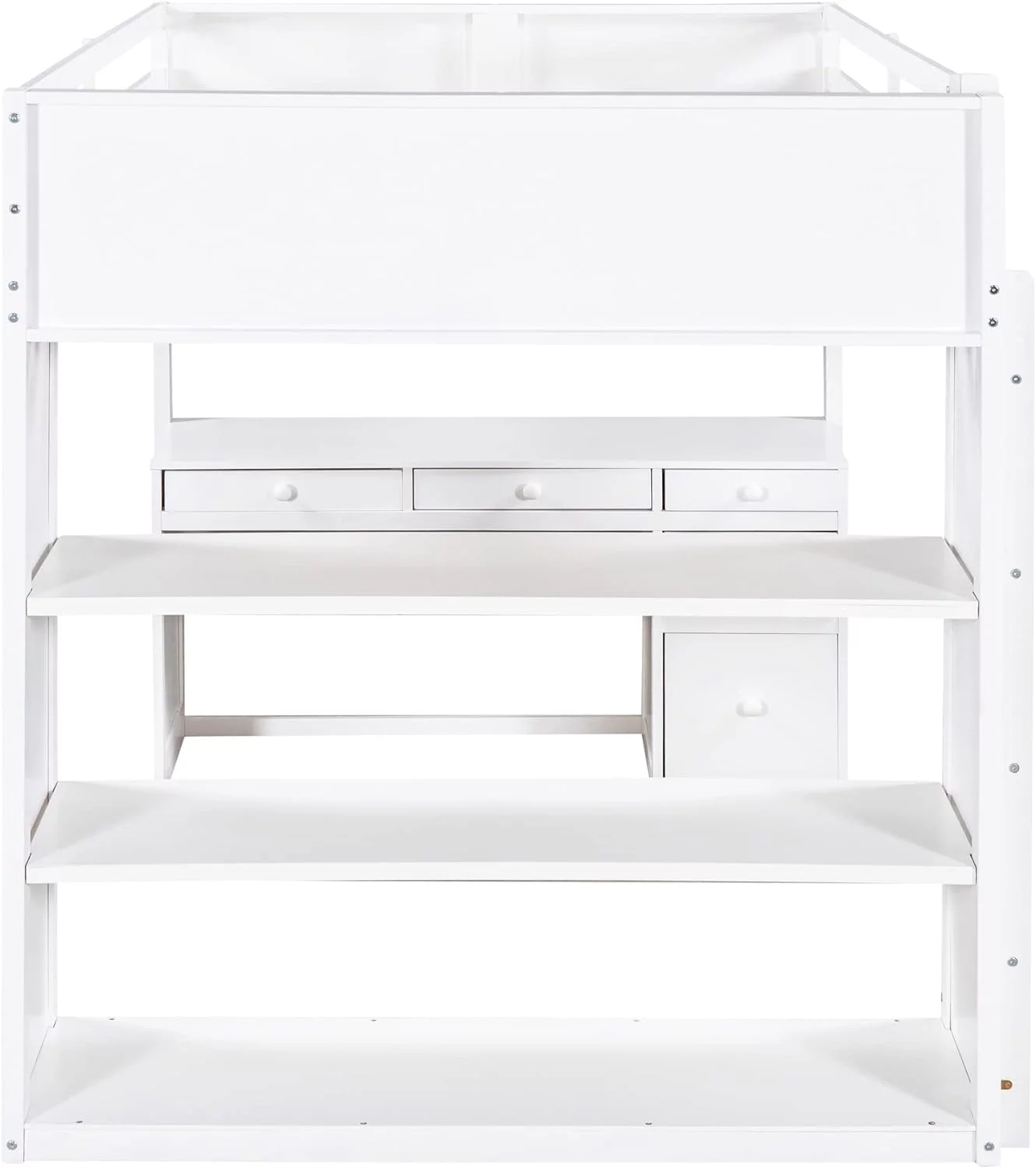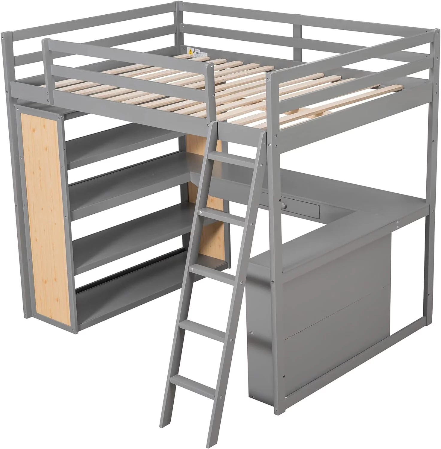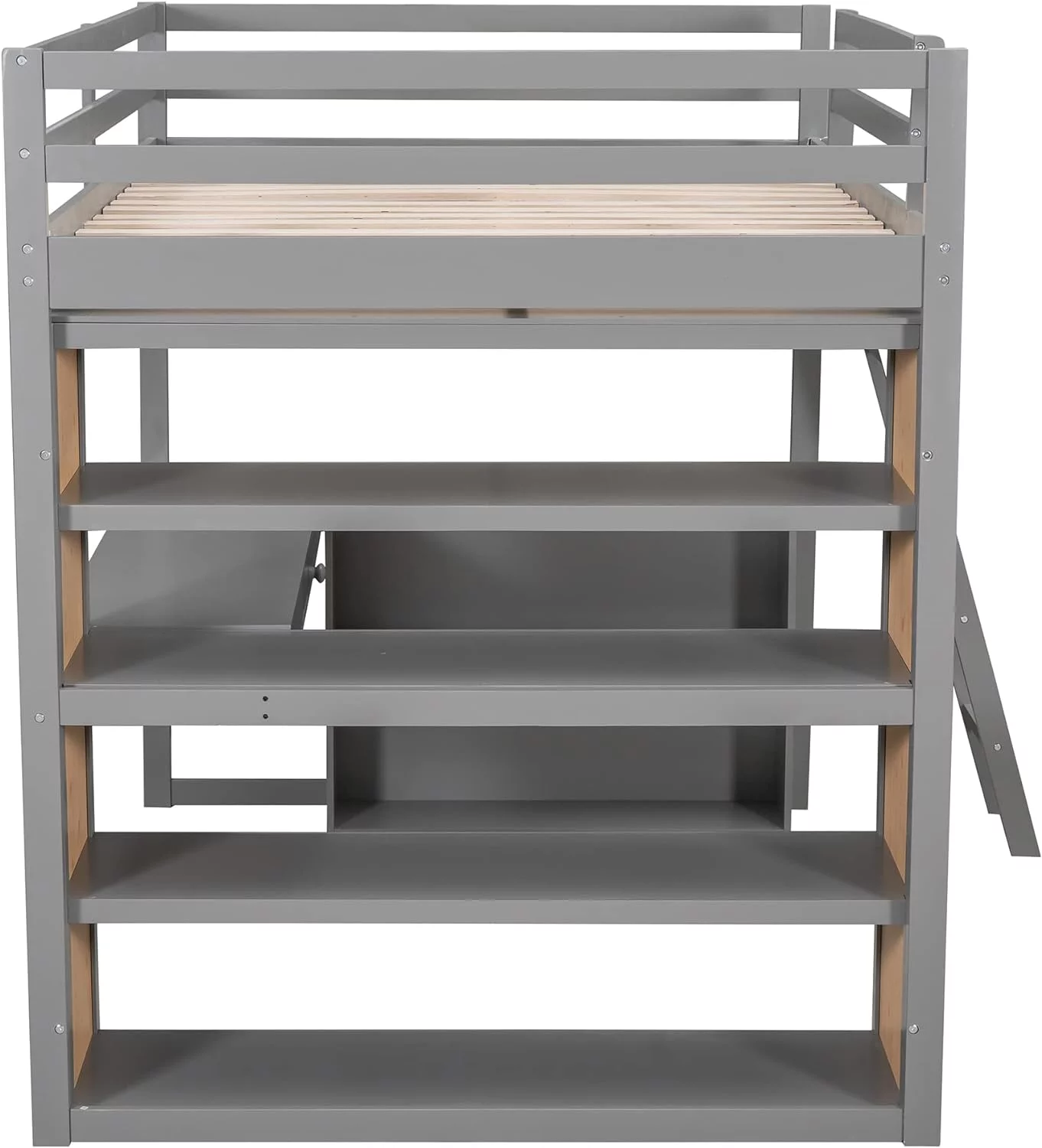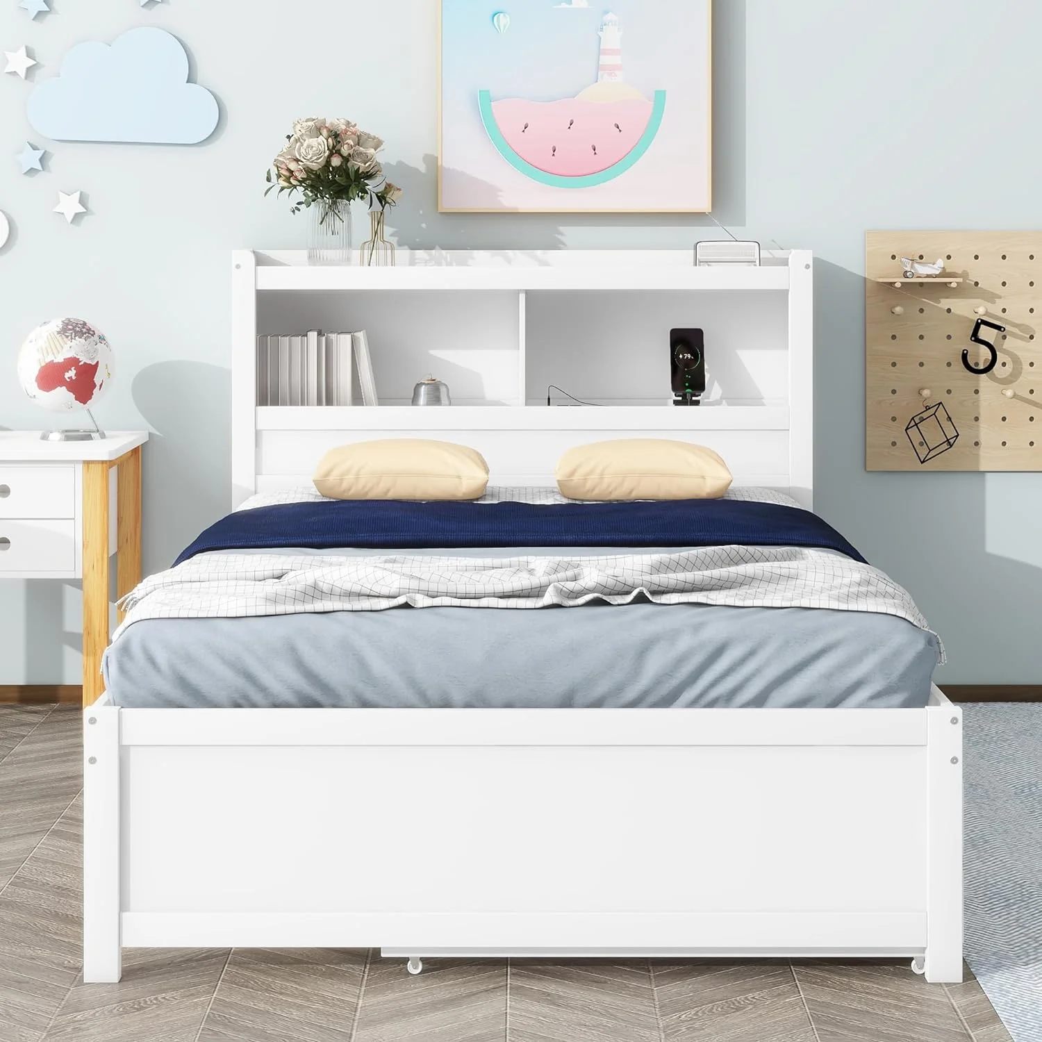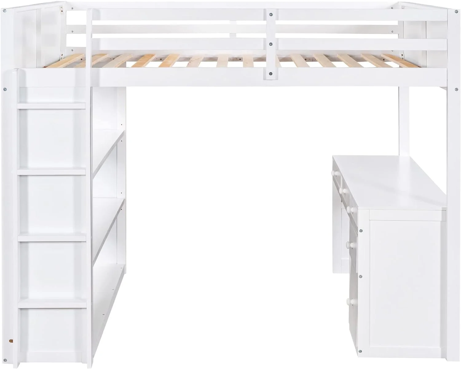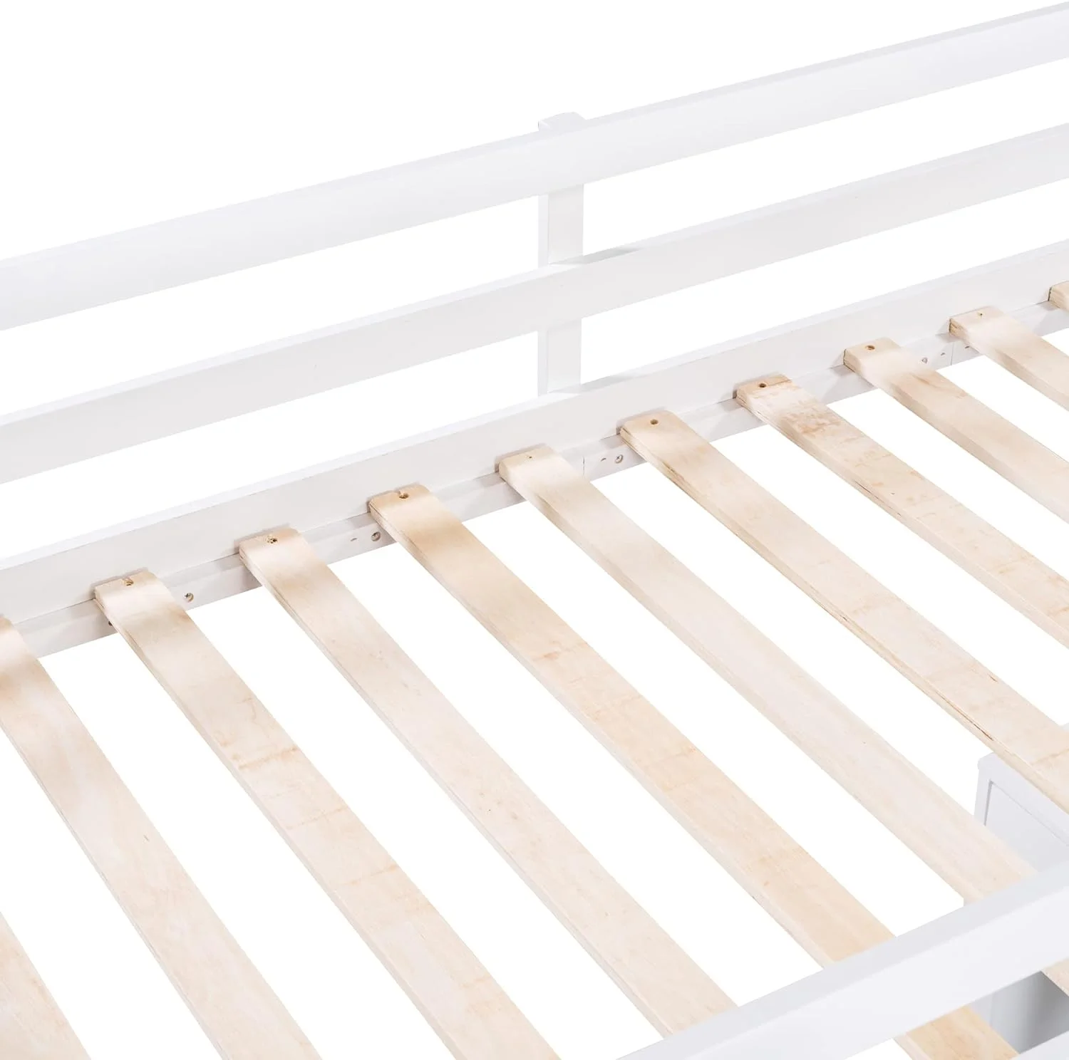 Full Size Wooden Captain Bed Built-in Bookshelves,Wood Platform Bedframe with Three Storage Drawers and Trundle