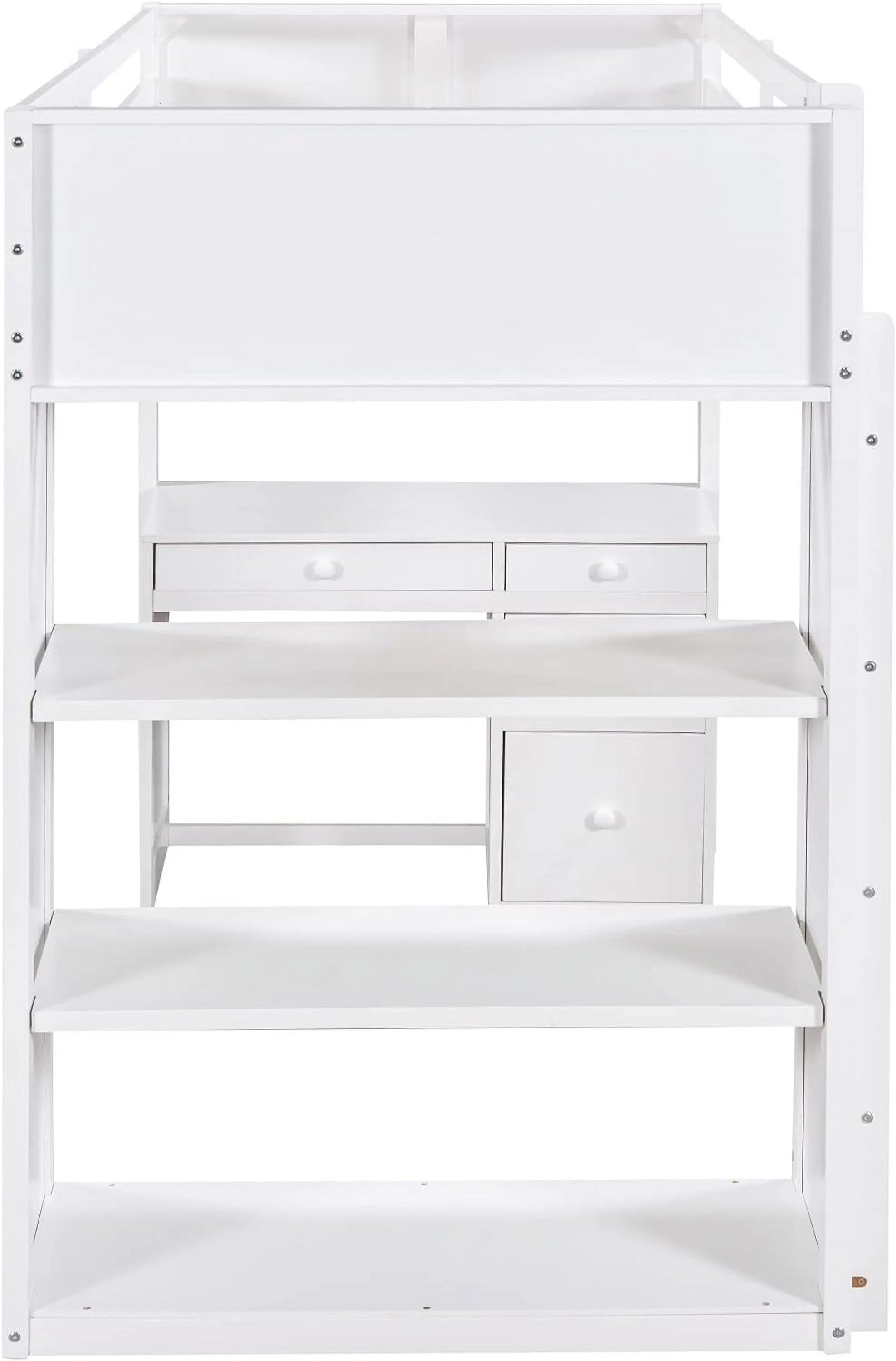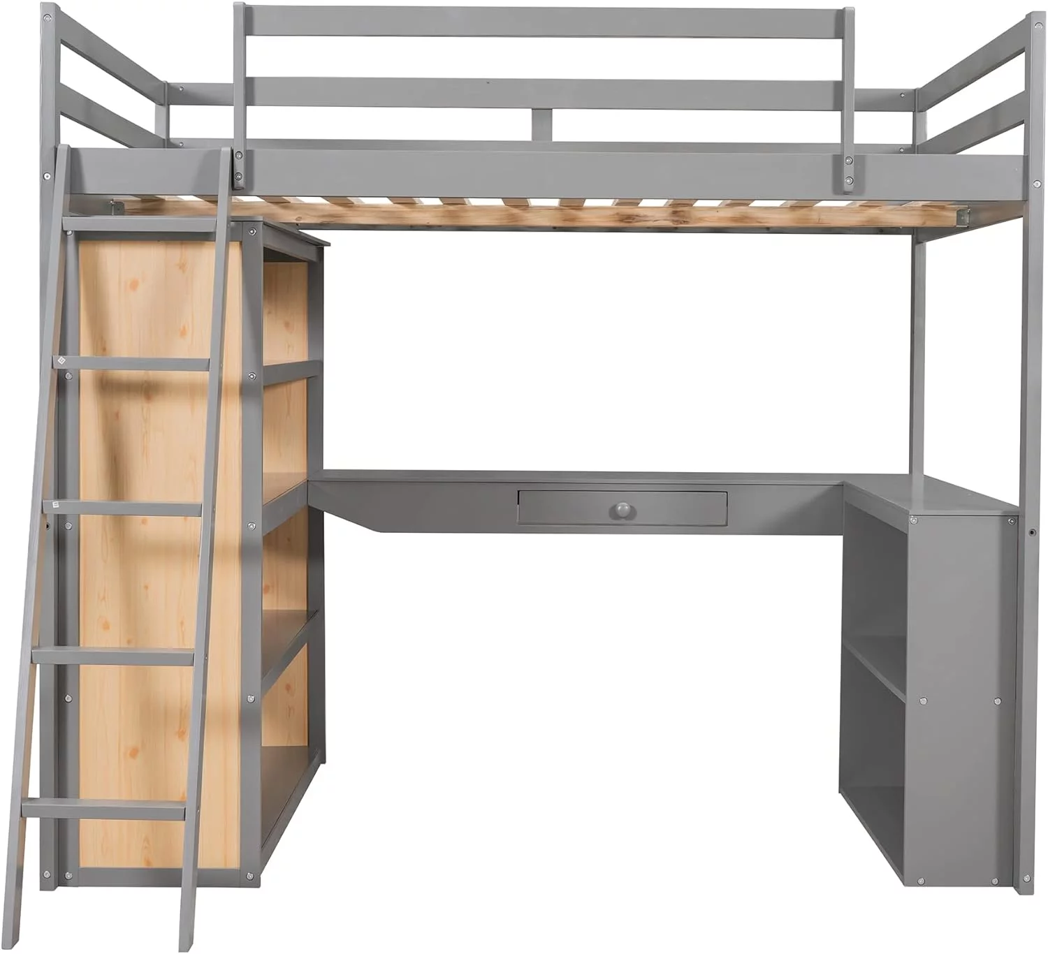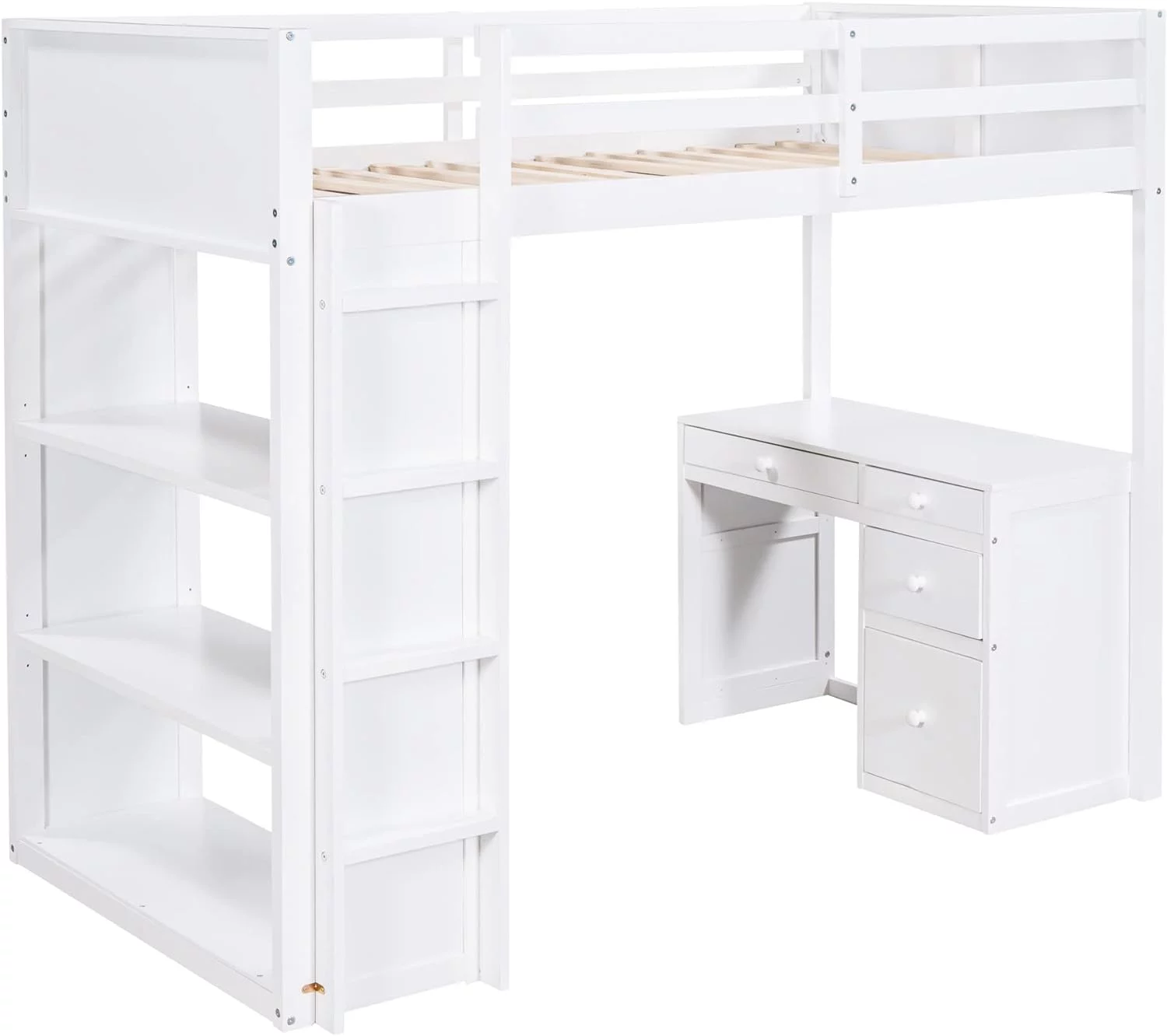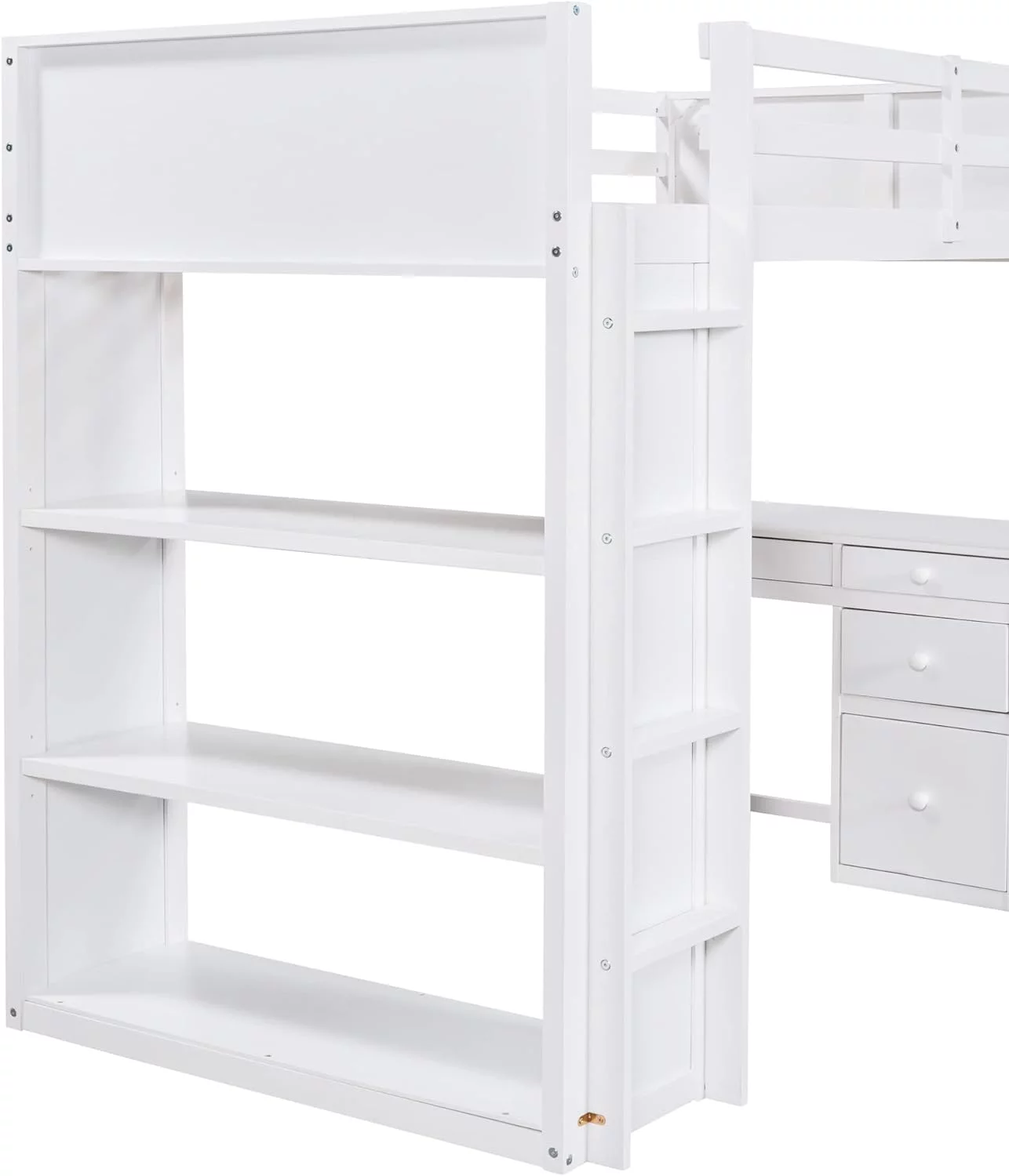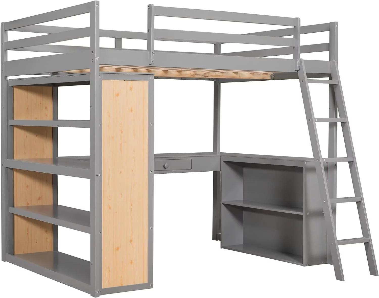 Full Size Wooden Captain Bed Built-in Bookshelves,Wood Platform Bedframe with Three Storage Drawers and Trundle