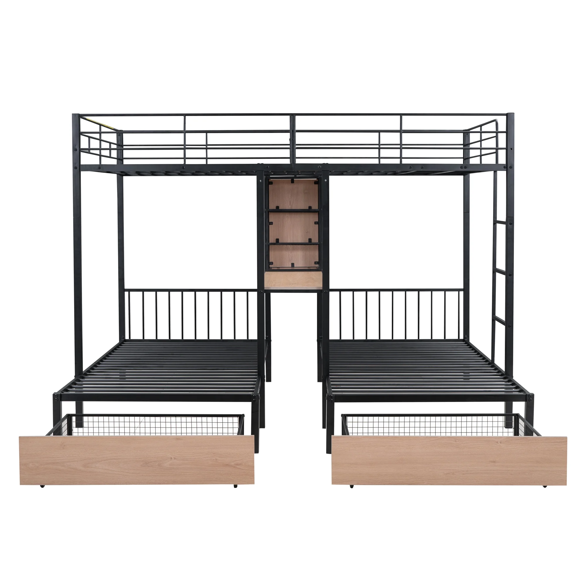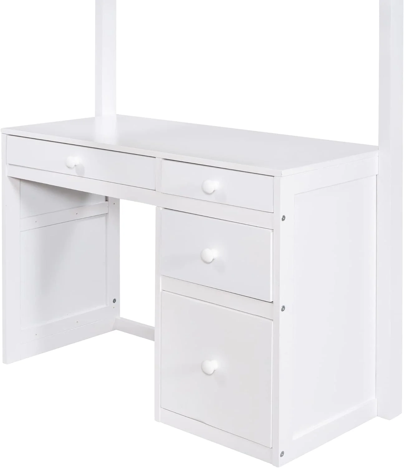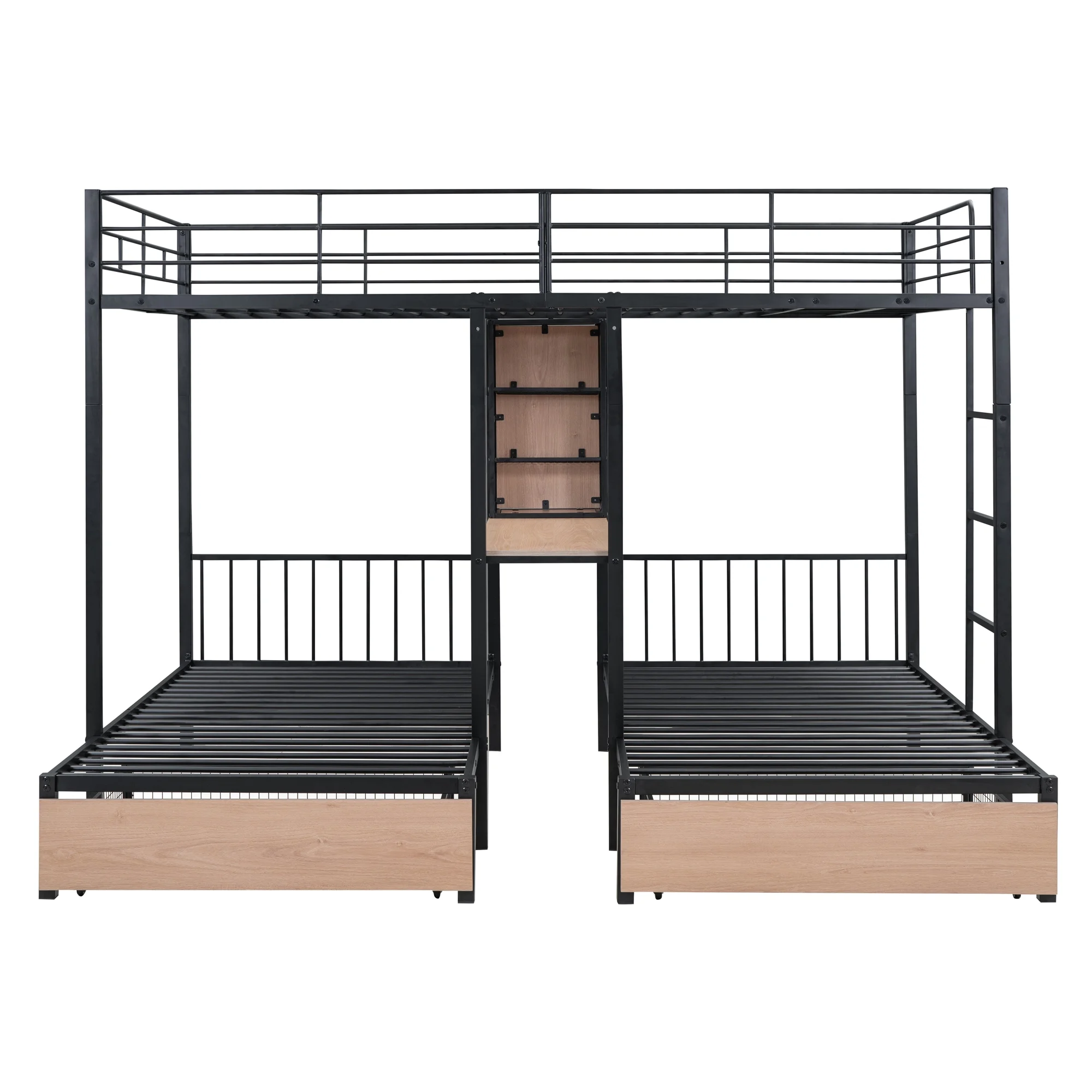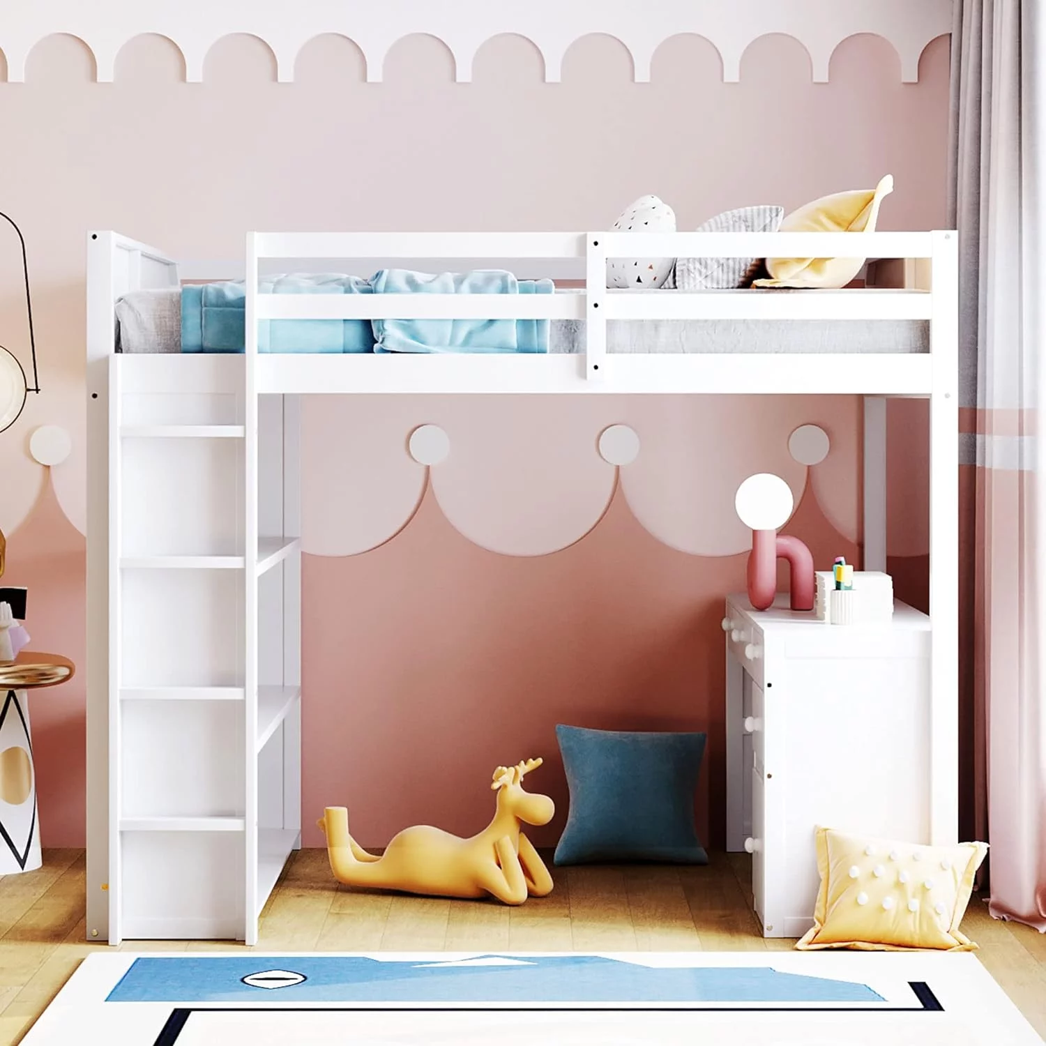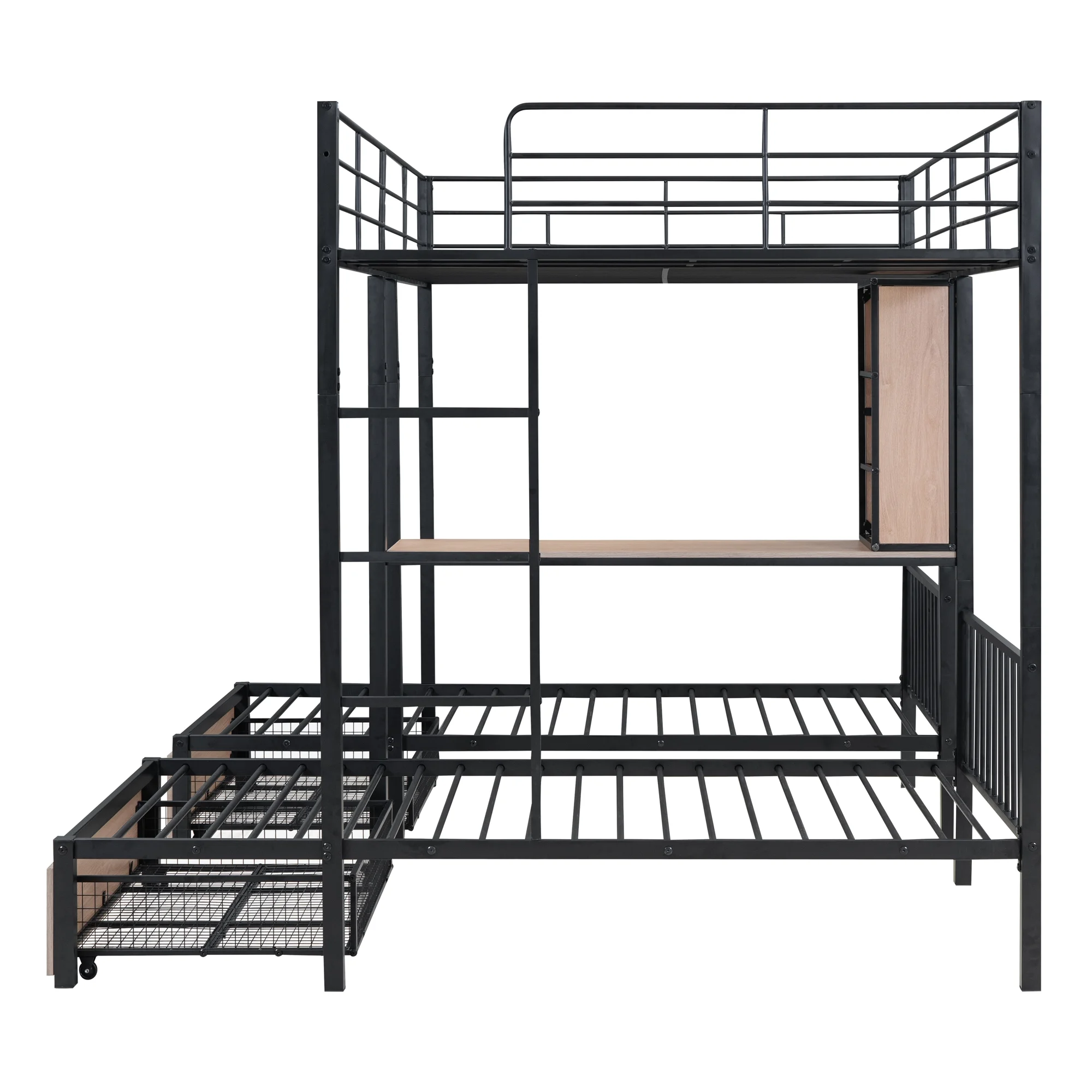 Full Size Wooden Captain Bed Built-in Bookshelves,Wood Platform Bedframe with Three Storage Drawers and Trundle