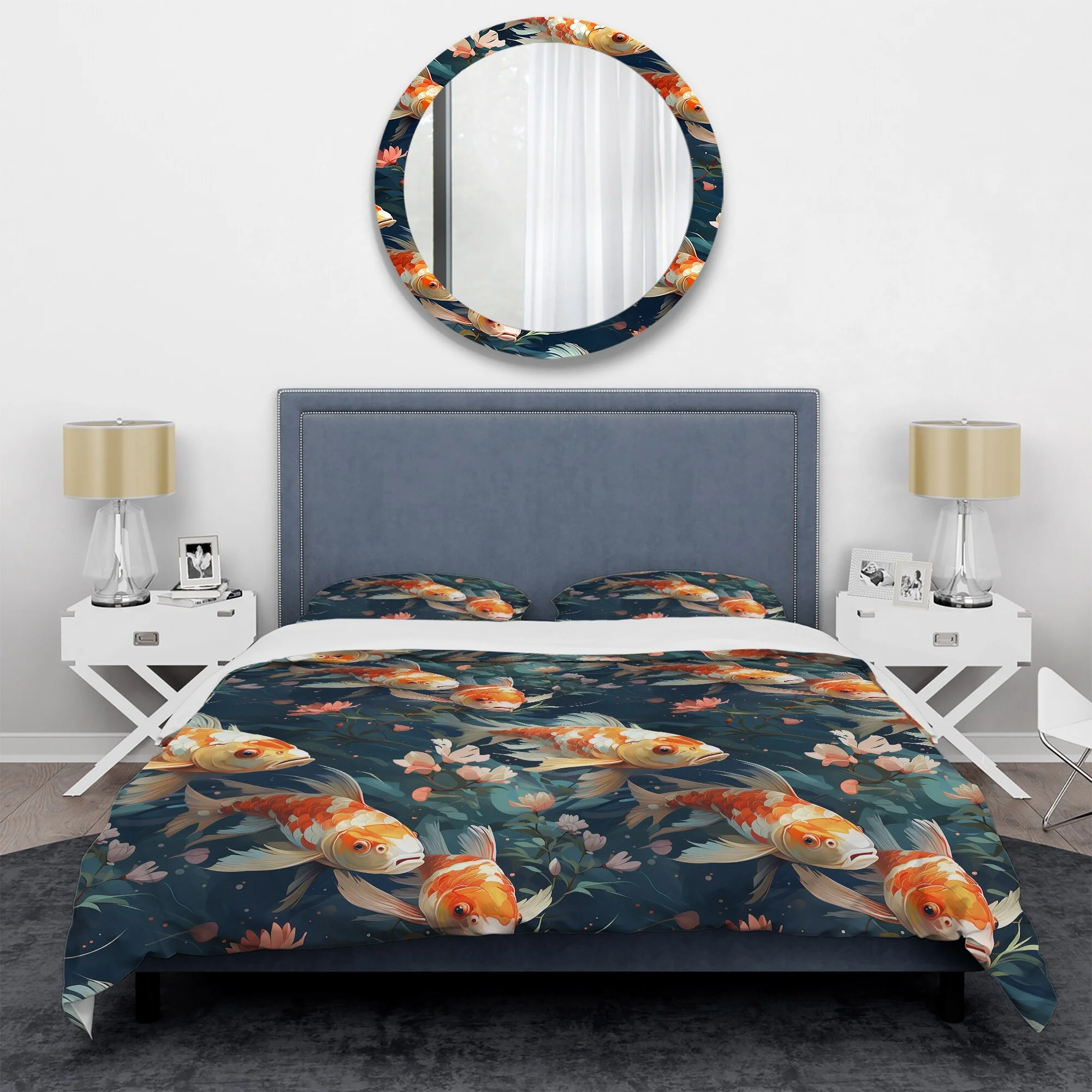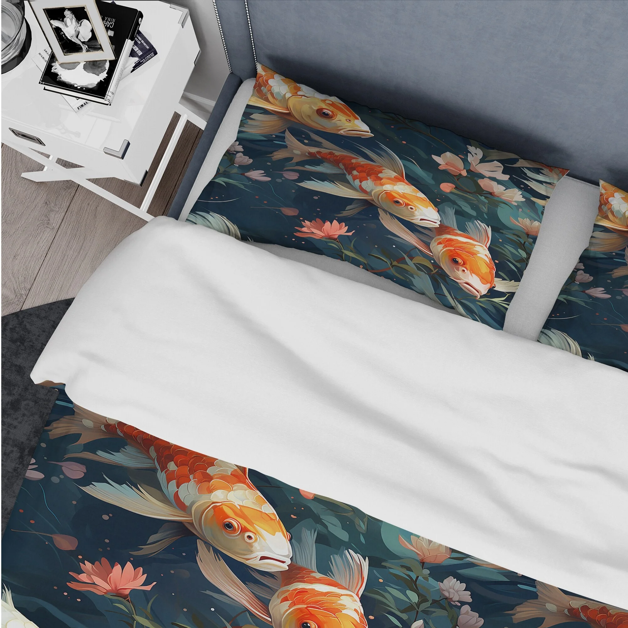 Designart "Nishikigoi Koi In Watercolor II" Orange Japanese Bedding Covert Set - Oriental Bed Set With 2 Shams