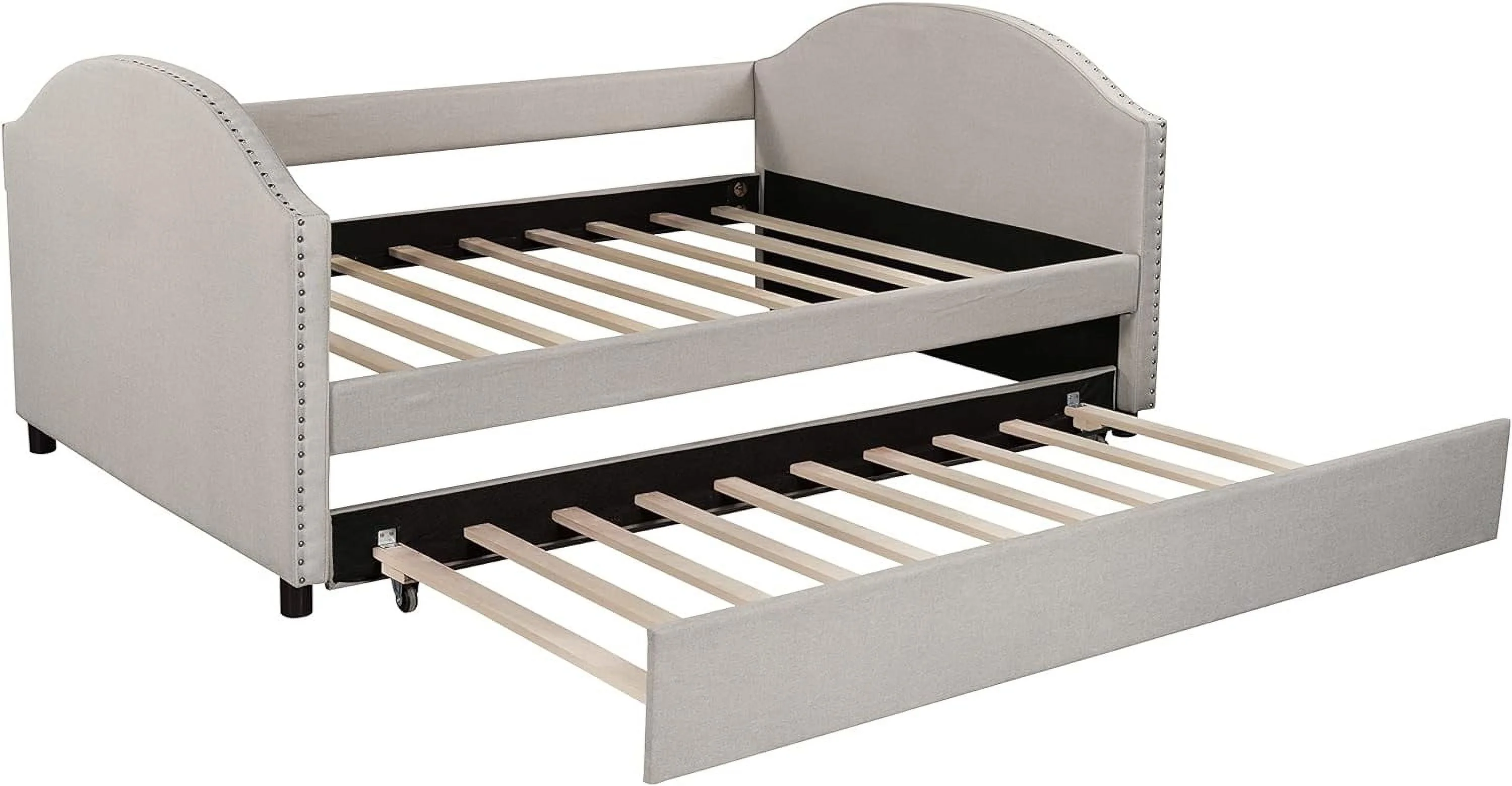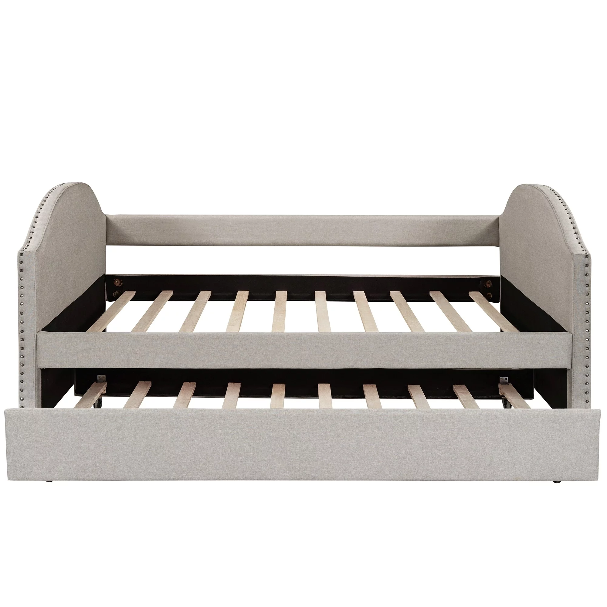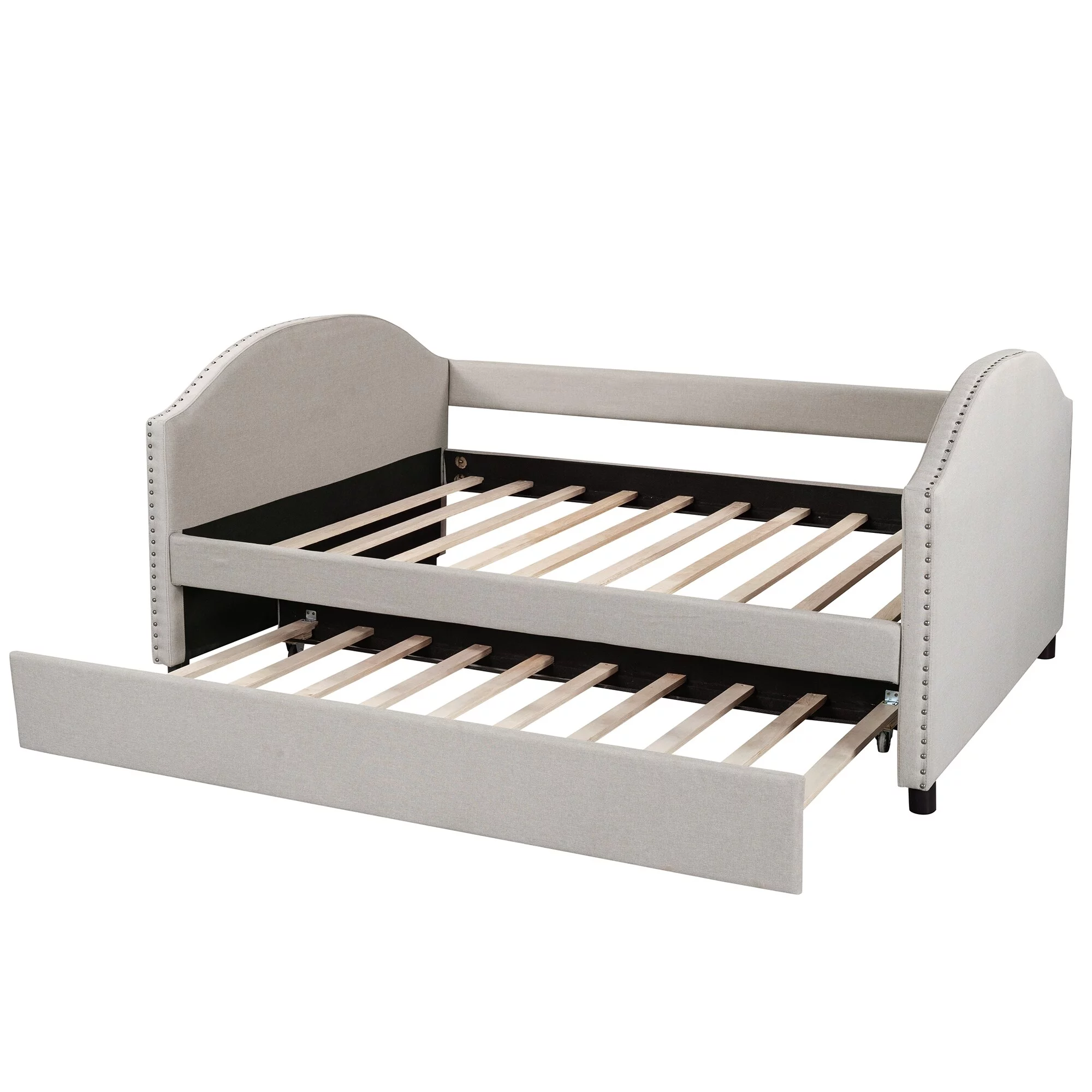 Beige Full size Upholstered Daybed with Twin Size Trundle, Feature a Backrest and Two Armrests With Rivets, Wood Slat Support