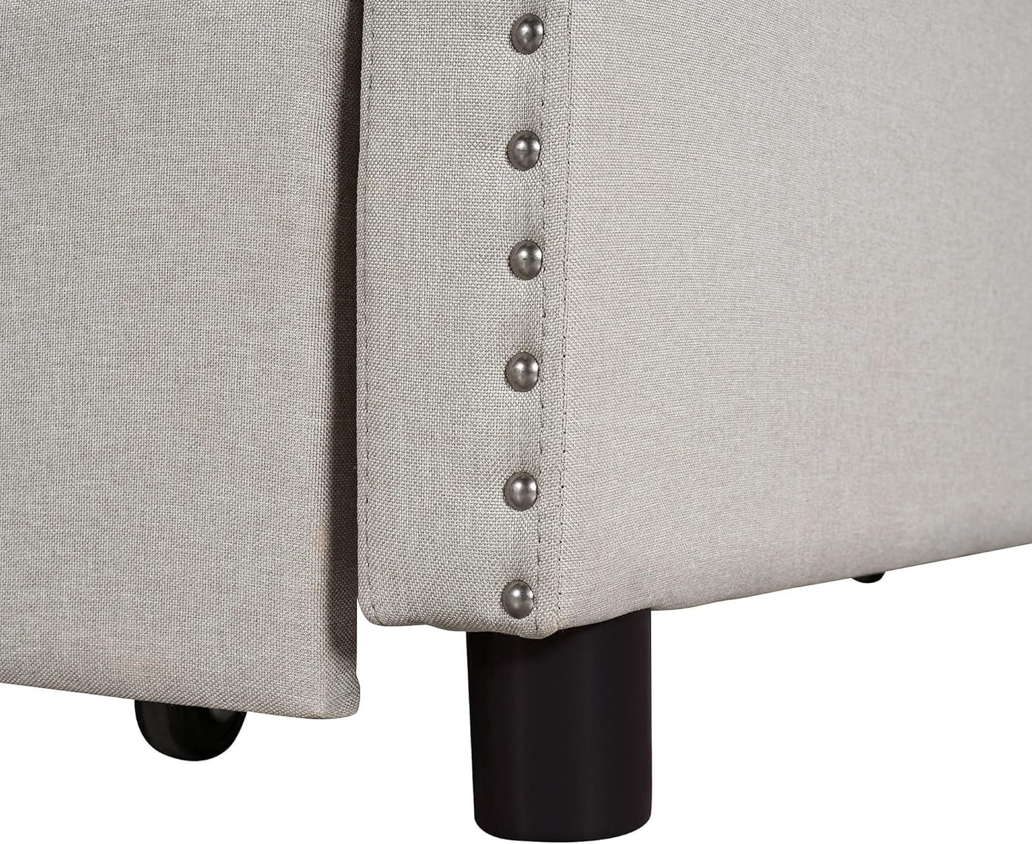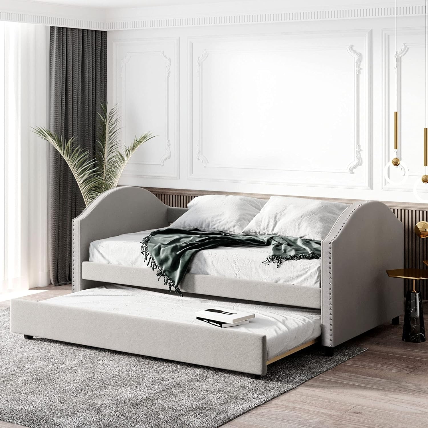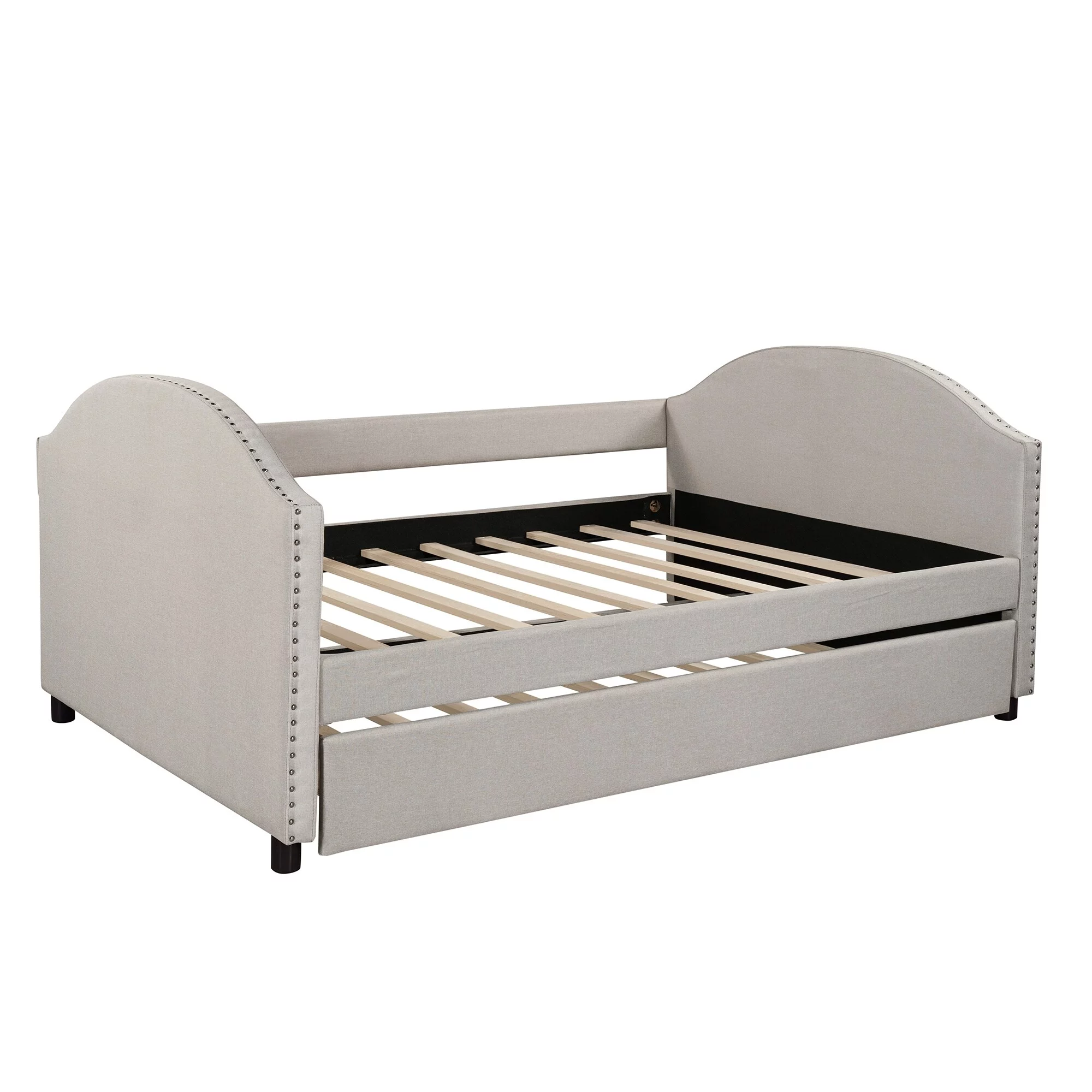 Beige Full size Upholstered Daybed with Twin Size Trundle, Feature a Backrest and Two Armrests With Rivets, Wood Slat Support
