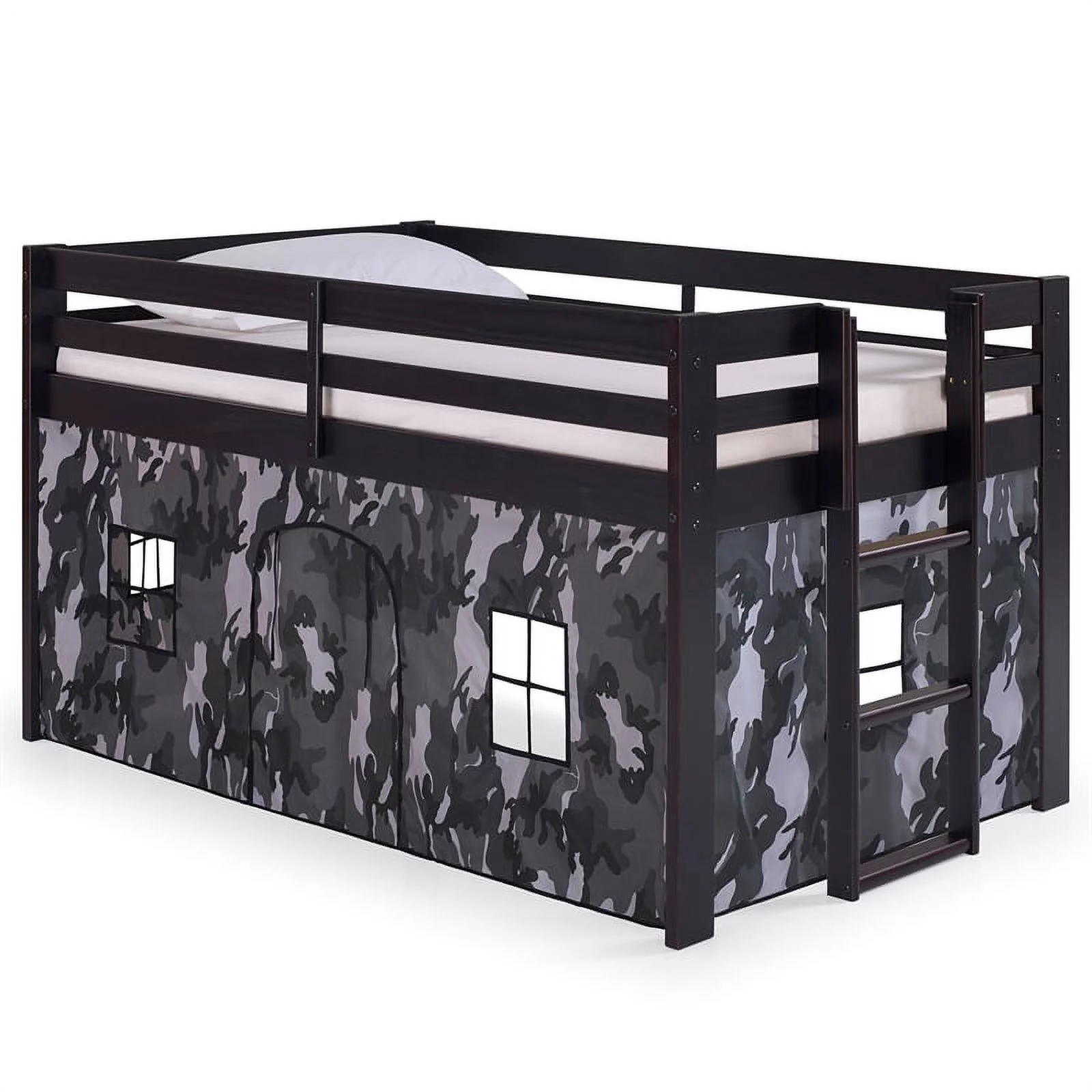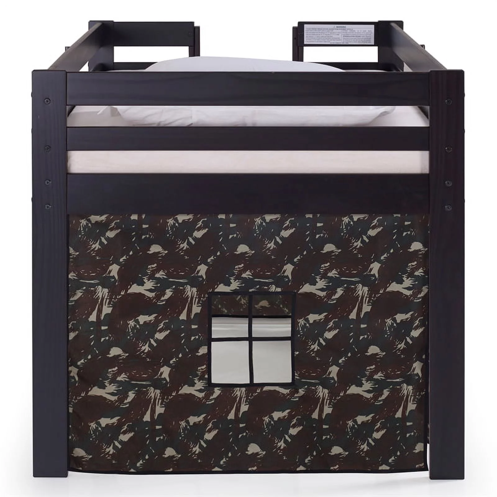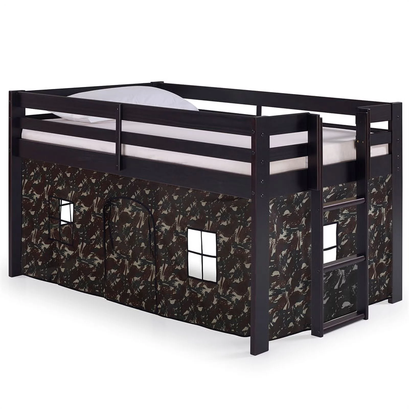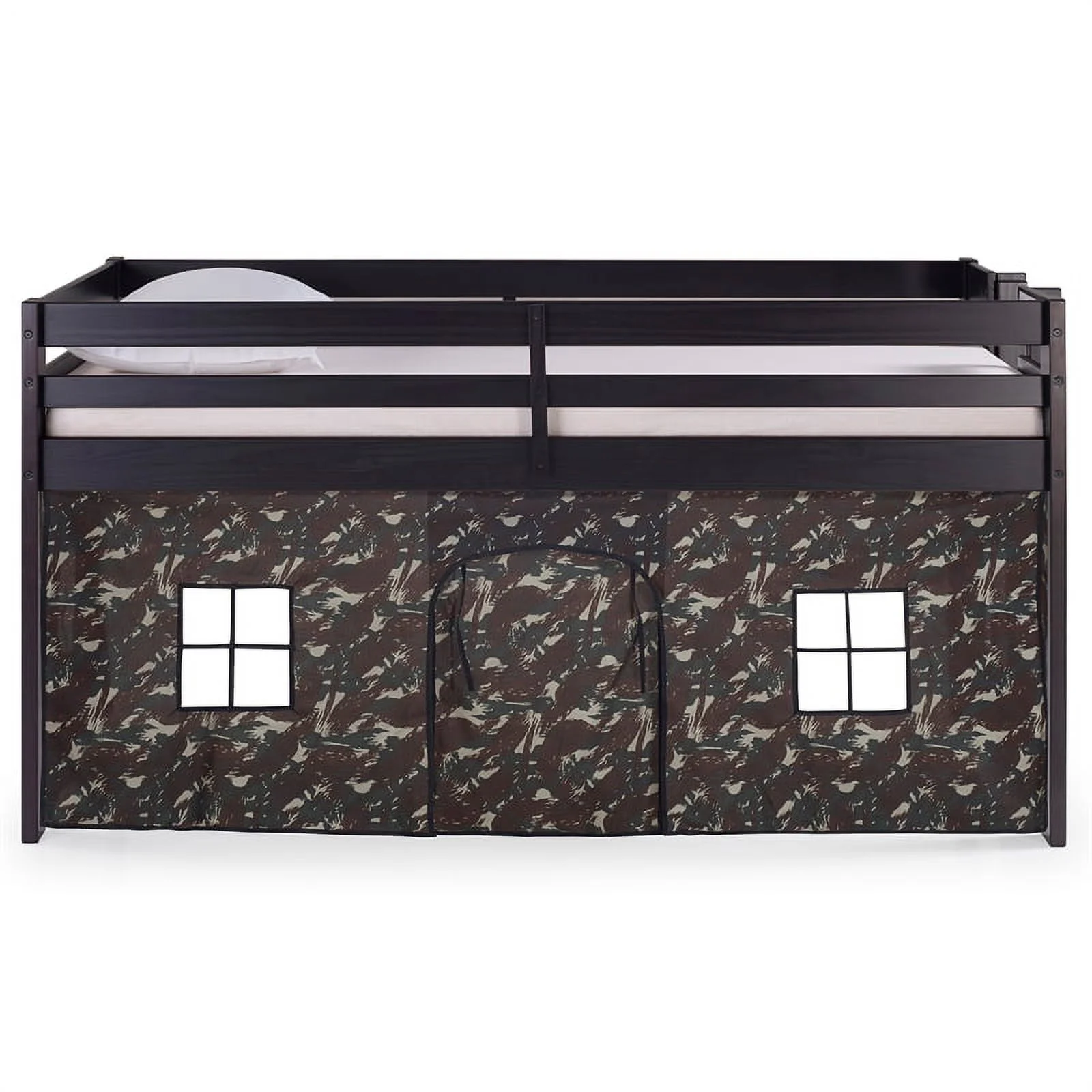 Roseberry Kids Twin Junior Loft Bed Espresso/Camouflage Bottom Playhouse Tent