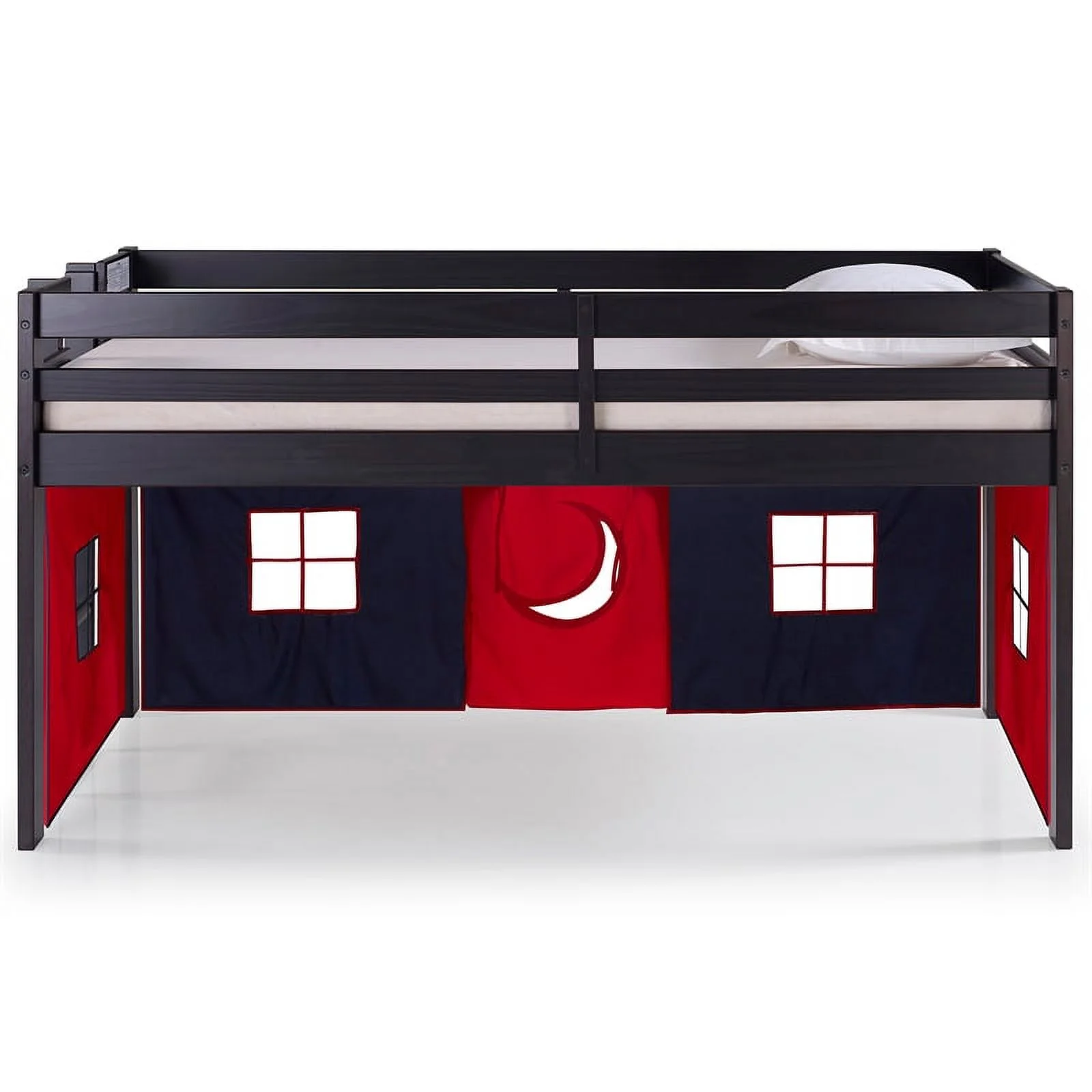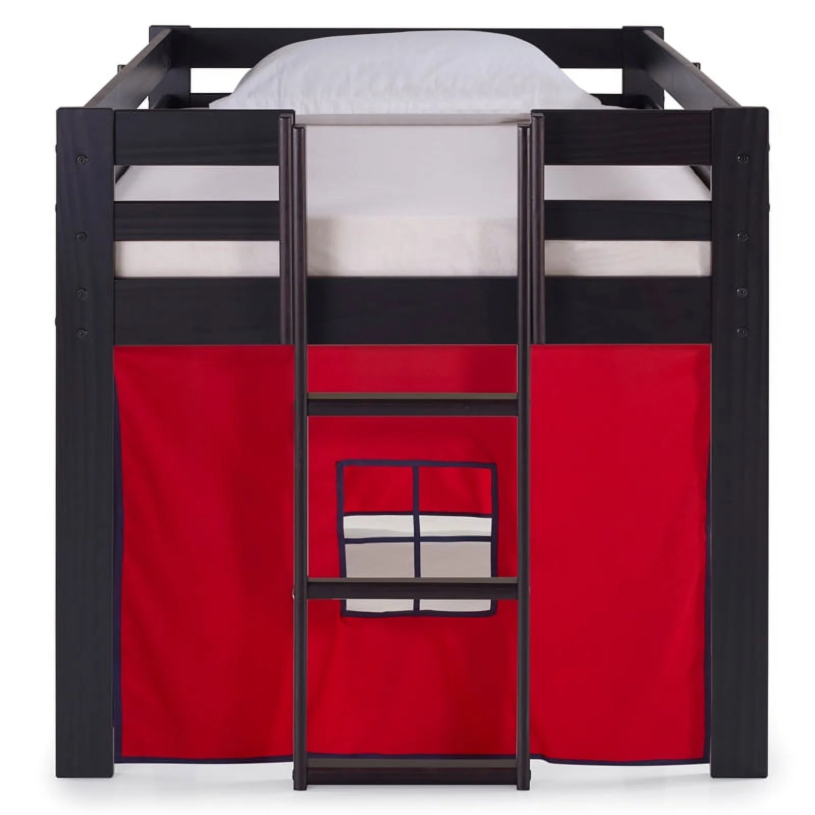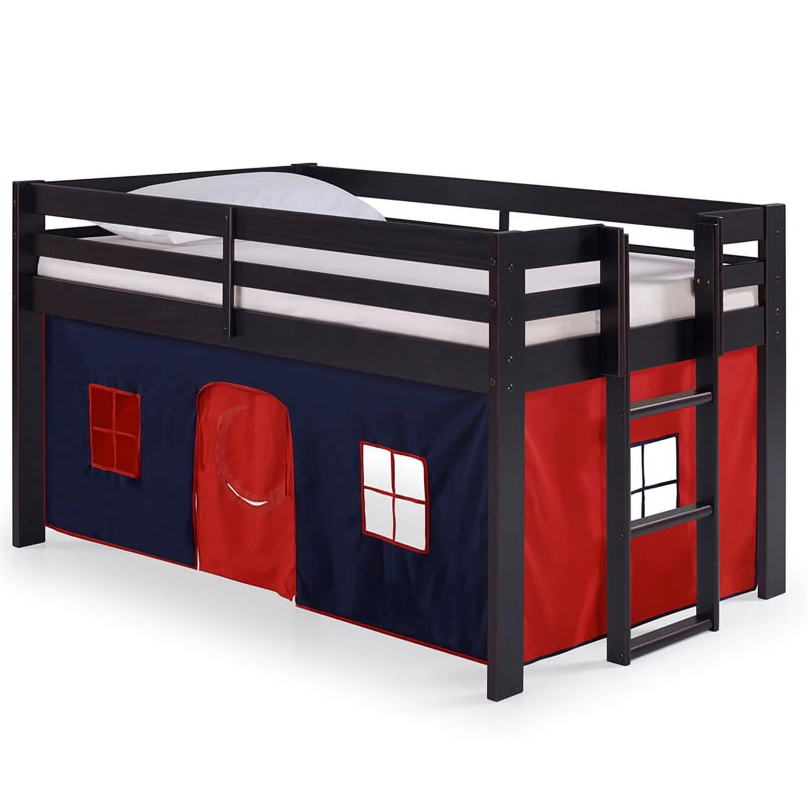 Jasper Twin Junior Loft Bed, Espresso Frame, Blue & Red Playhouse Tent