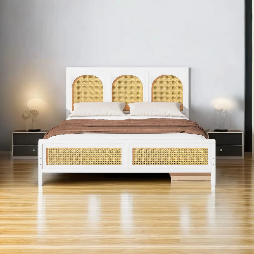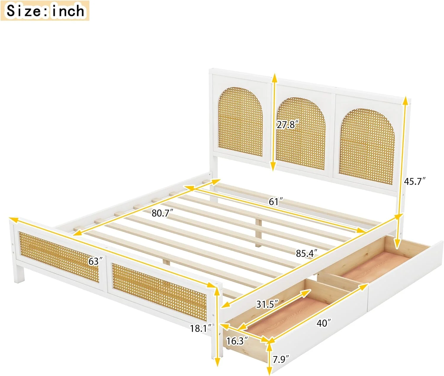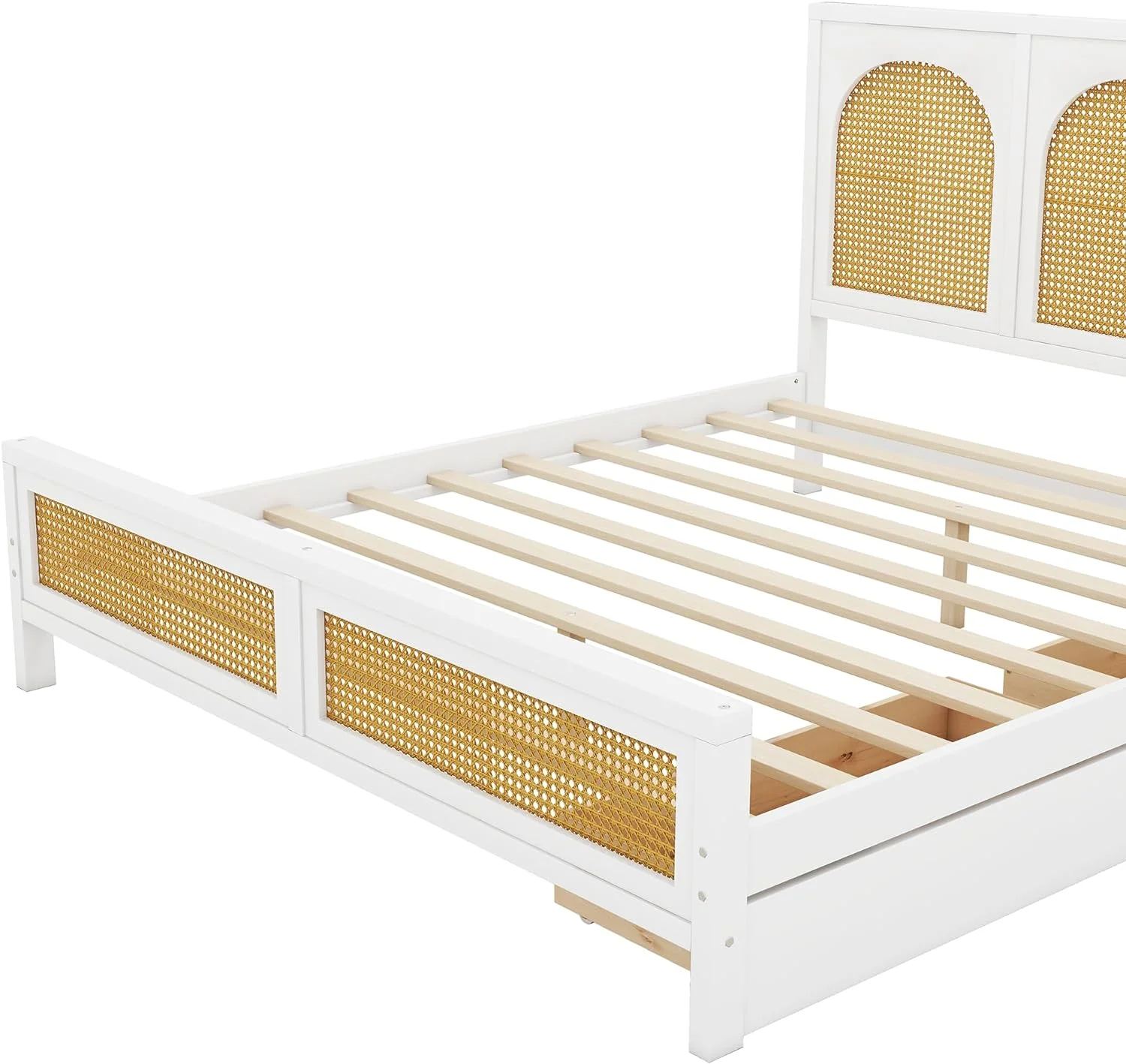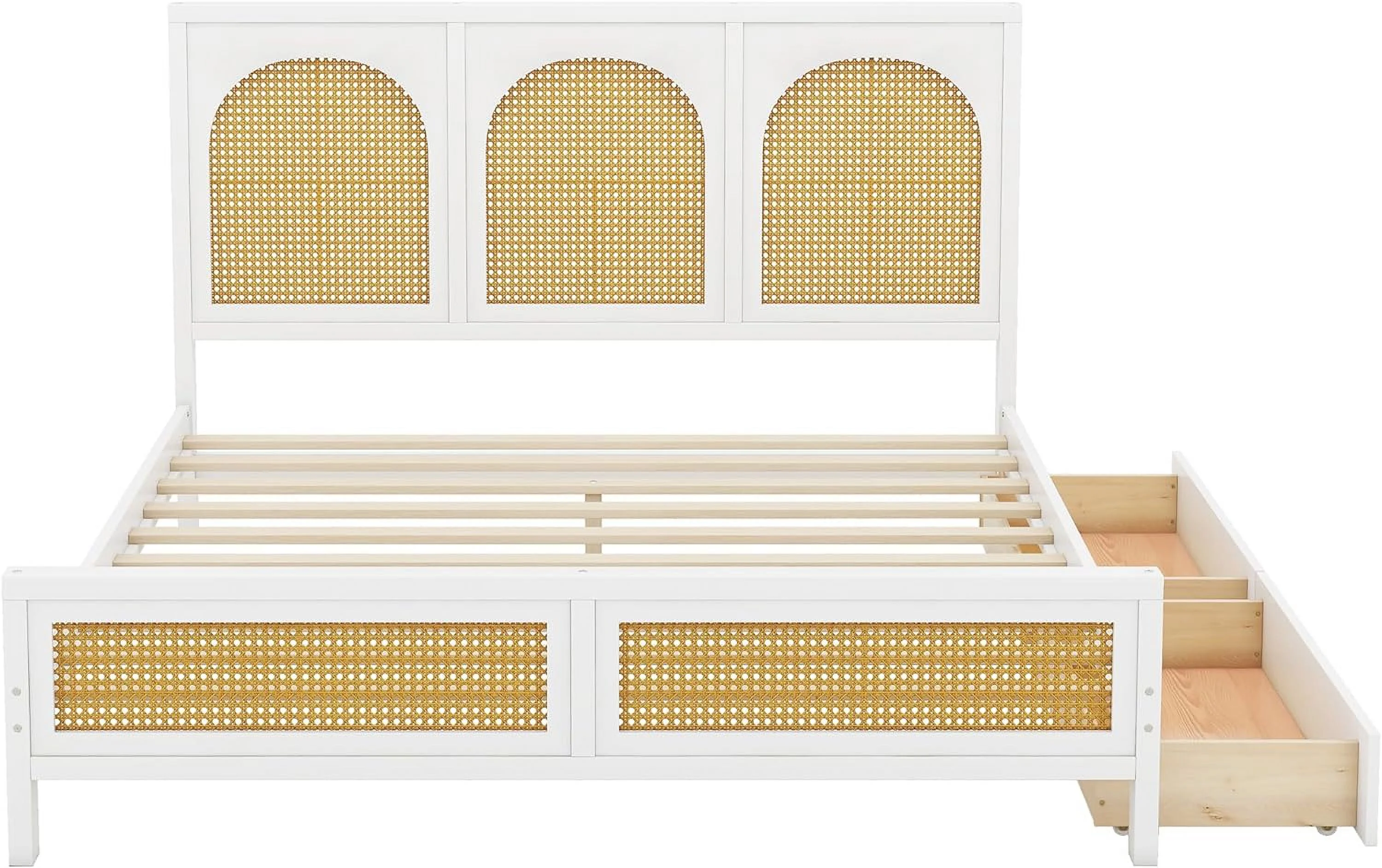 Queen Size Wood Storage Platform Bed with 2 Drawers, Rattan Headboard and Footboard