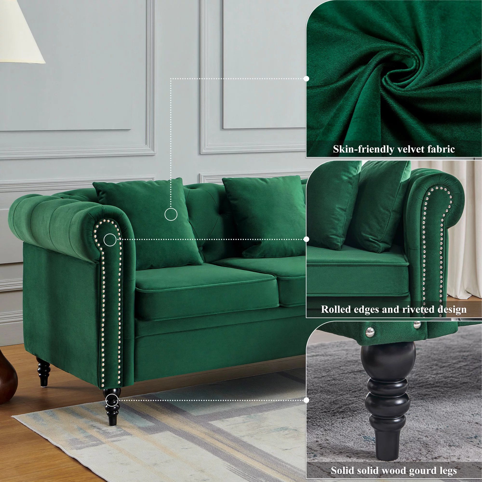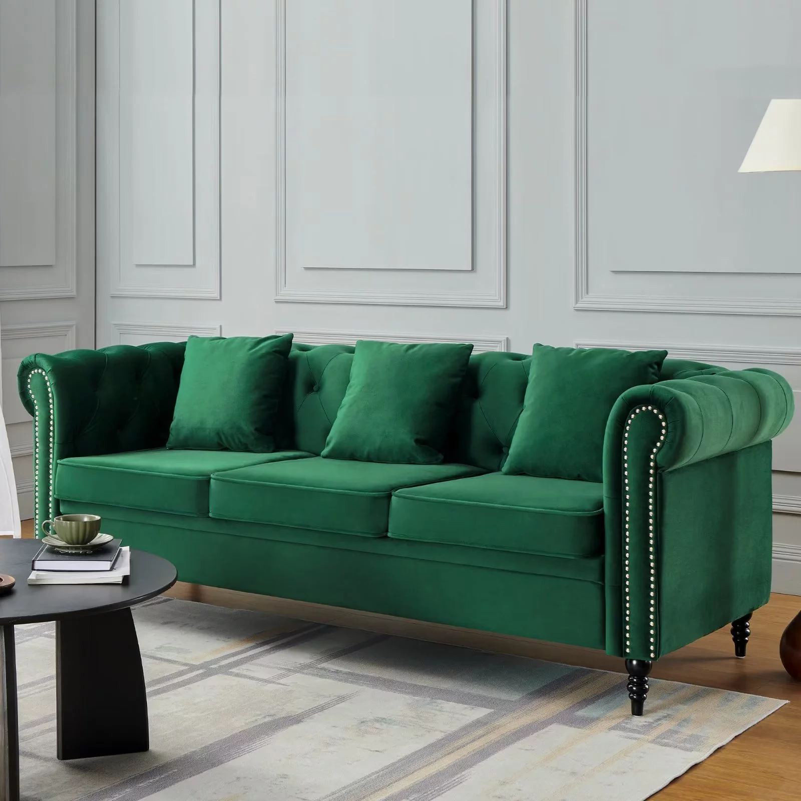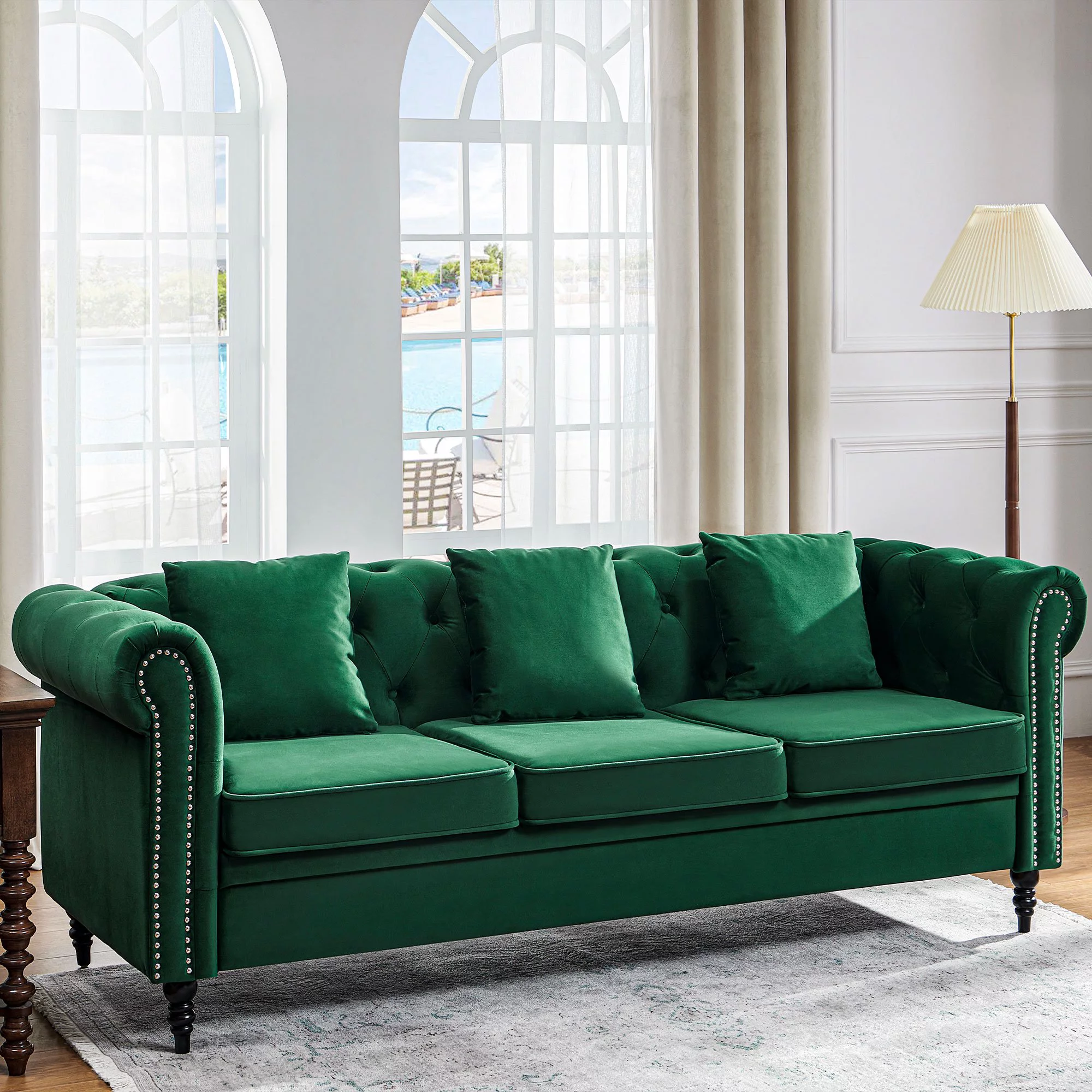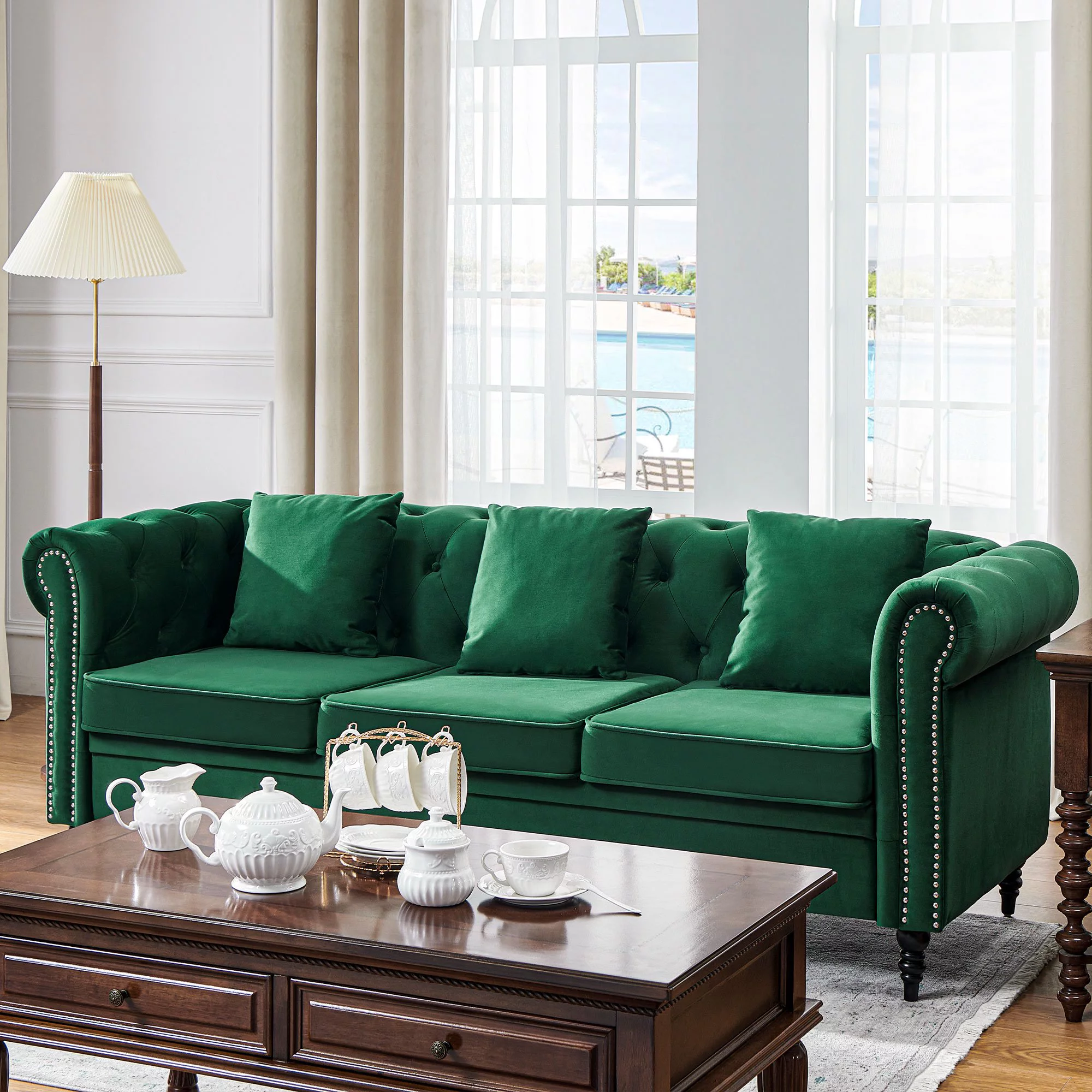 Kinmars Tufted Chesterfield Velvet 3 Seater Sofa, Large Sofa with Rolled Arms (Green)
